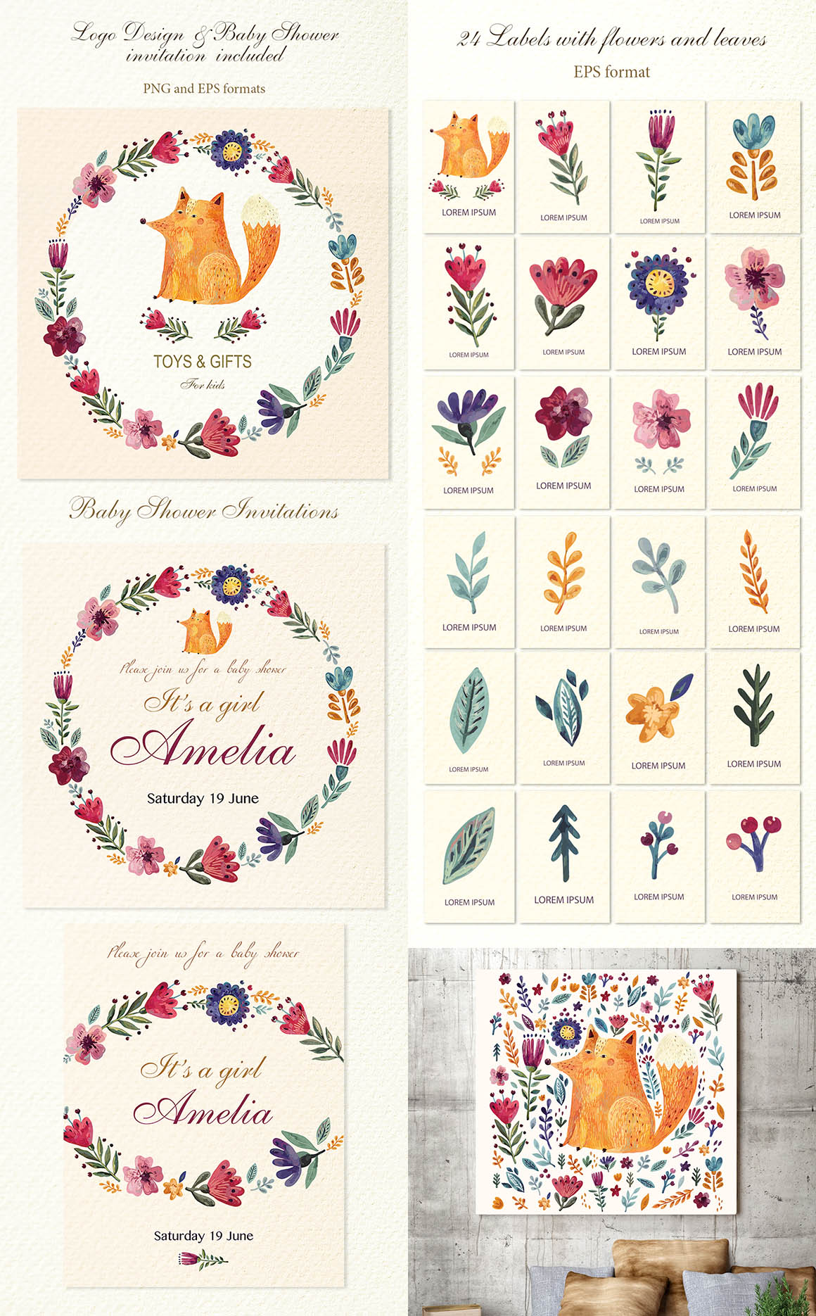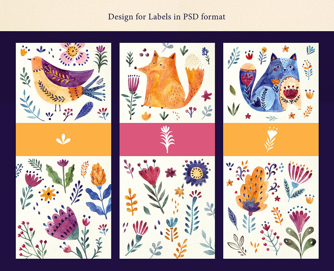 On these mysterious pages you will meet with amazing decorative tropical flowers, leaves, beautiful colorful bird, a little fox and blue cat. All art works was hand painted watercolors, scanned and carefully cleaned from the background. So all elements are isolated from background and you will be able to create any designs using individually each element! In this amazing collection includes more than 150 design elements, 30 label designs and templates and ideas for logo, 5 floral patterns Using all elements from this collection, you can create any amazing design: greeting cards, textile patterns, baby shower invitations, stationary, birthday cards, stickers, art prints, posters, t-shirts, logos, labels, bags, packaging design, wrapping paper, identity and more.