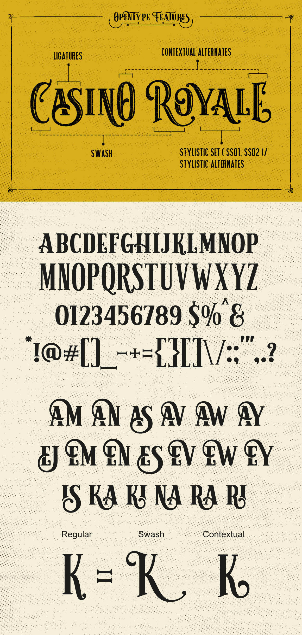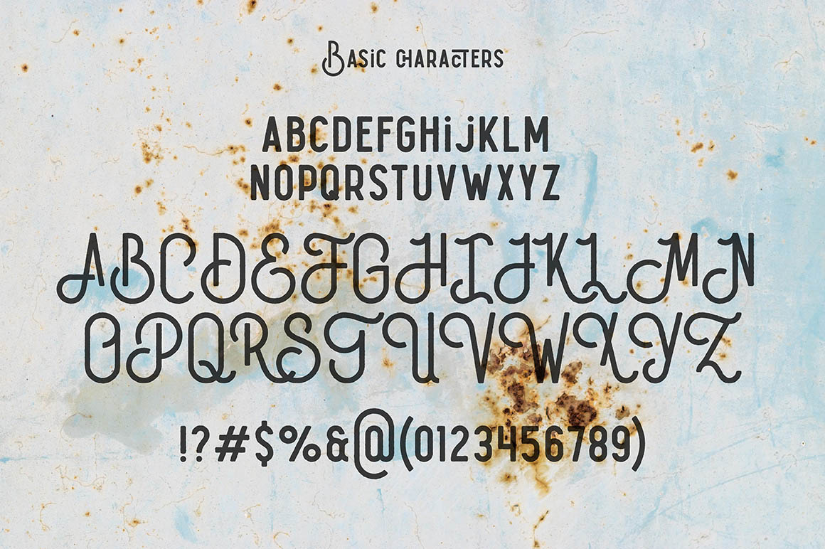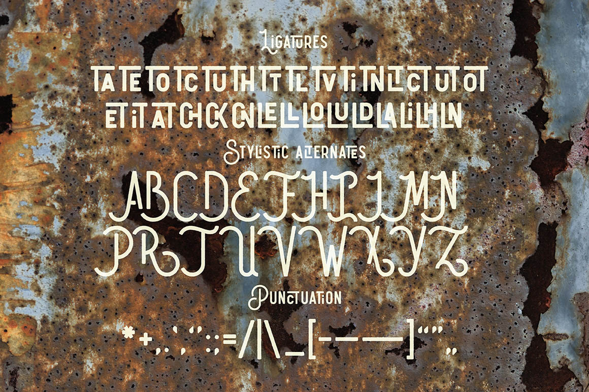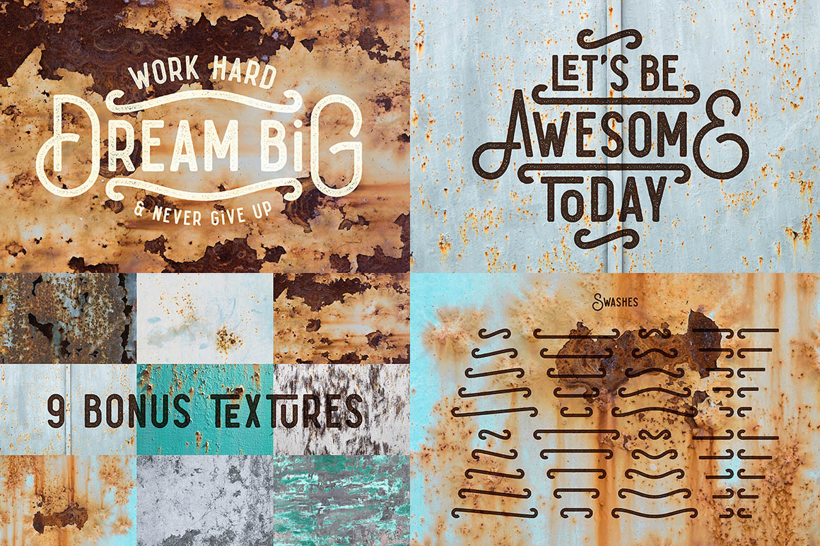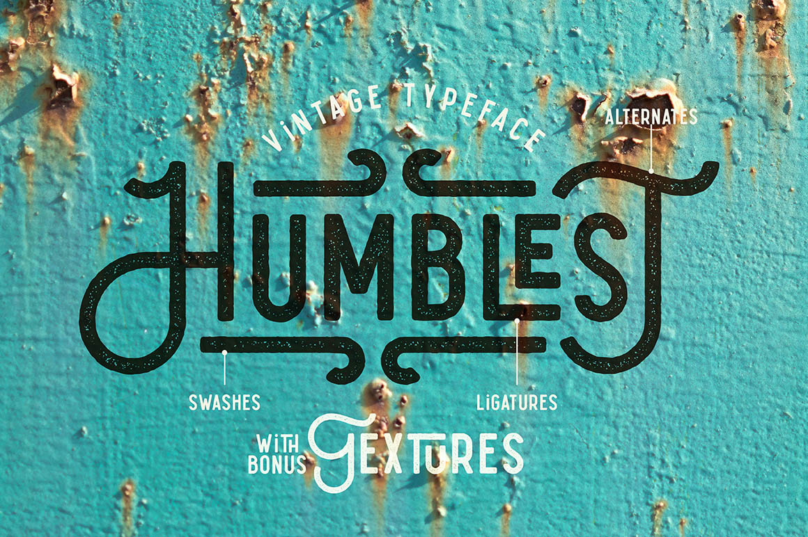 Hello! Here is another one vintage typeface named “Humblest”. It has useful OpenType features: 20 stylistic alternates for caps and 30 ligatures (6th screenshot). Also it comes with additional font file with swashes (7th screenshot). For small sized text the simple font version included “Humblest Clean” (it is without noisy effect inside the characters). And in conclusion you will have a nice bonus – a pack of 9 high resolution photos of rusty textures.