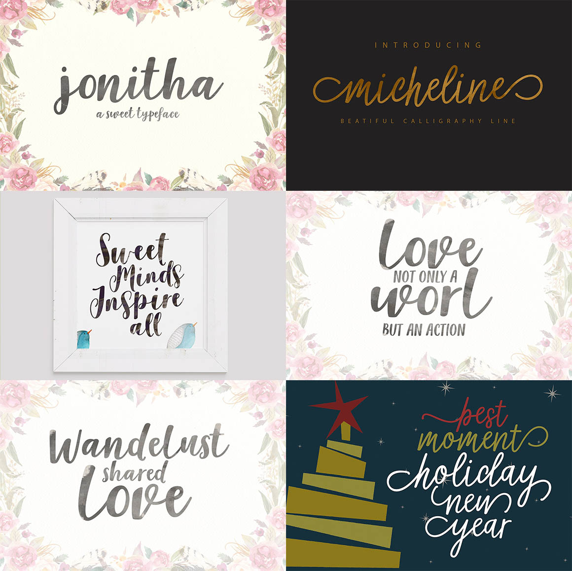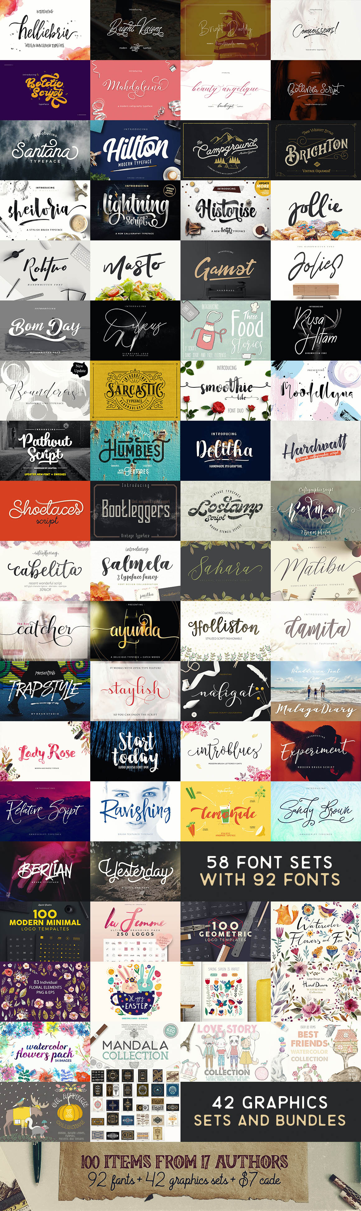 - 58 font bundles with 92 fonts and 42 beautiful graphics sets!