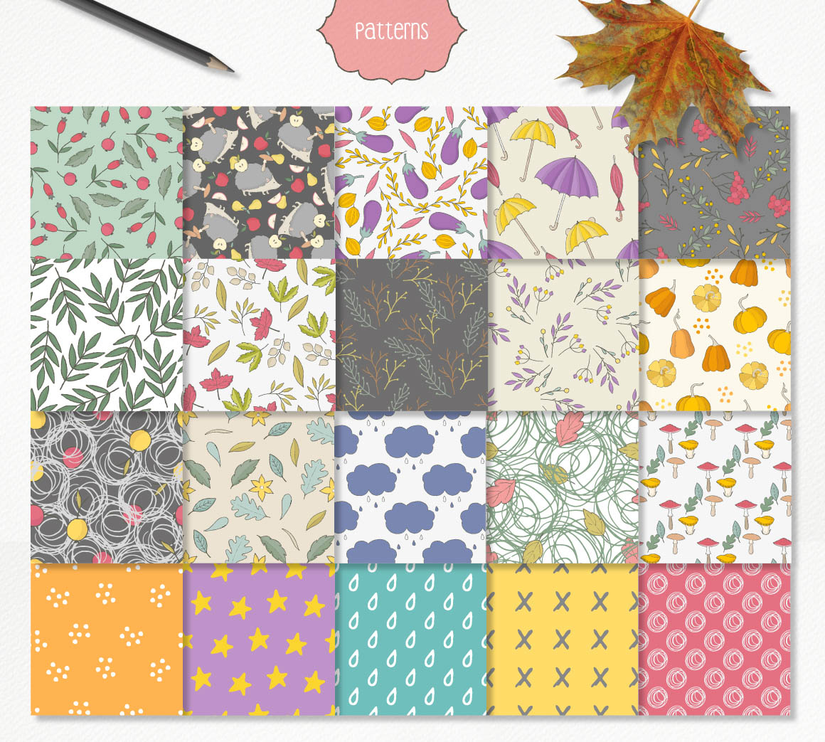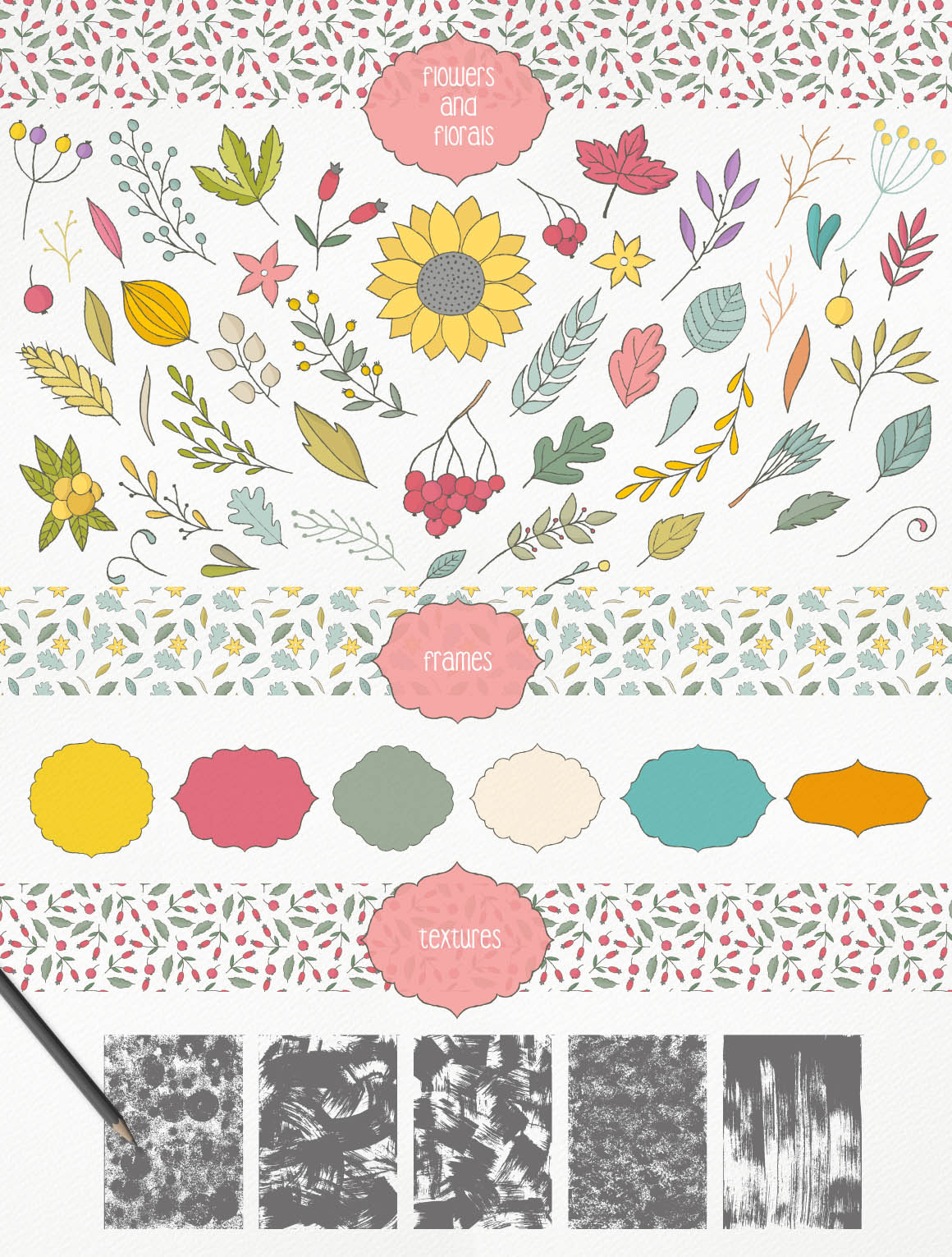 It’s very autumn dwellers ! To create this collection I used pencil. Be sure to click on the image to see all the cuties. Create halloween postcard in autumn style for a friend or decorate child’s room. This package includes elements that will help you in your design: autumn animals, pumpkins, patterns, hand drawn textures, flowers and florals. Create an invitation or use for your small business.