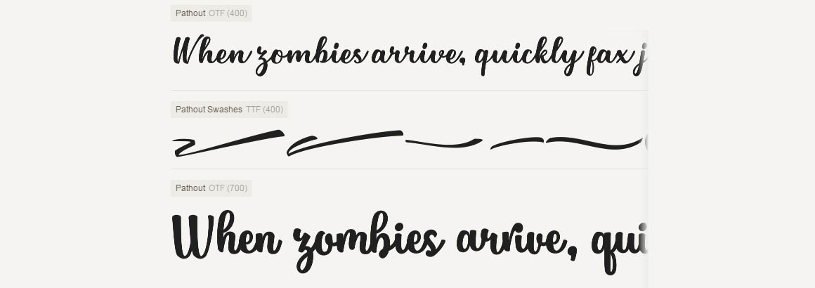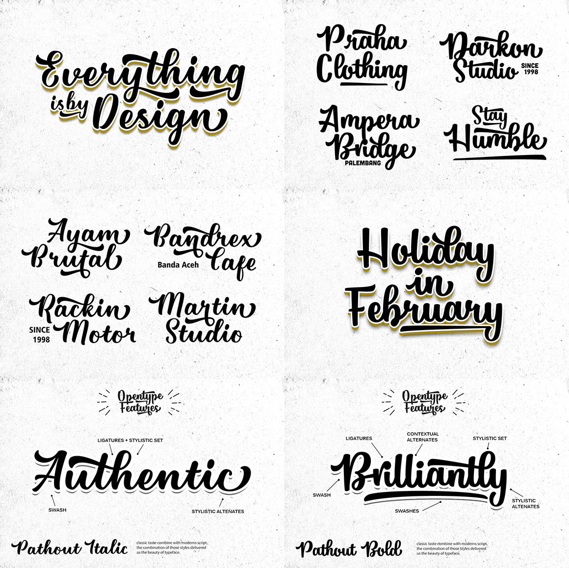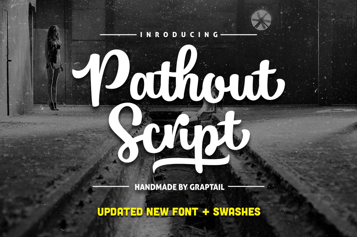 Pathout is a bold connected script font with a clear style and dramatic movement. Pathout comes with uppercase, lowercase, numerals, punctuations and so many variations on each characters include opentype alternates, common ligatures and also additional swash to let you customise your designs. Perfect to use for Logotype, Letterhead, Poster, Apparel Design, Label and etc. Also supported PUA encoded. Simply copy and paste the alternate characters using the Character Map (Windows), Font Book (Mac) or a software program such as PopChar (for Windows and Mac).