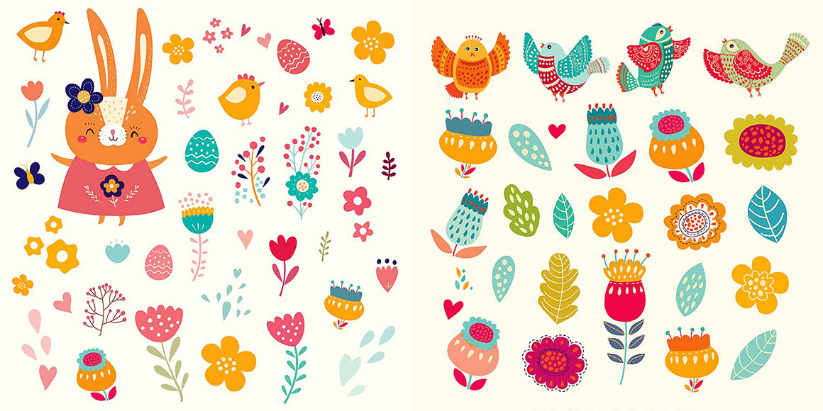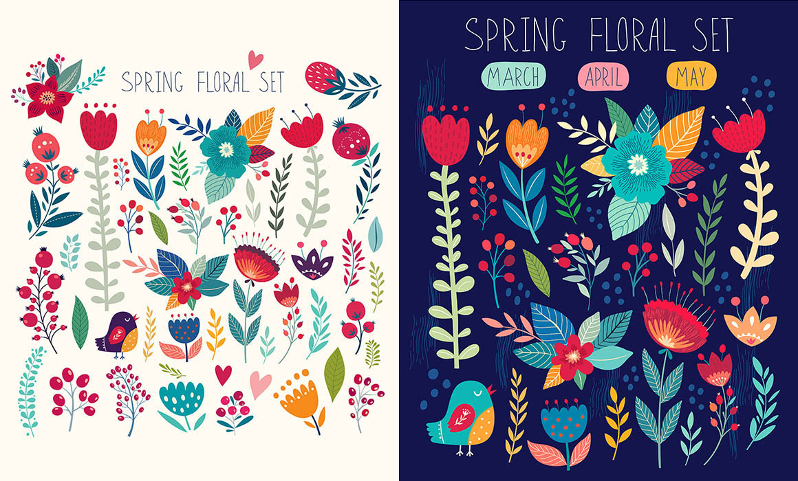 Colorful spring collection with flowers. 43 vector floral elements for any amazing design: greeting cards, textile patterns, invitations, stationary, birthday cards, stickers, art prints, posters, t-shirts, logos, labels, bags, packaging design, wrapping paper, identity and more.