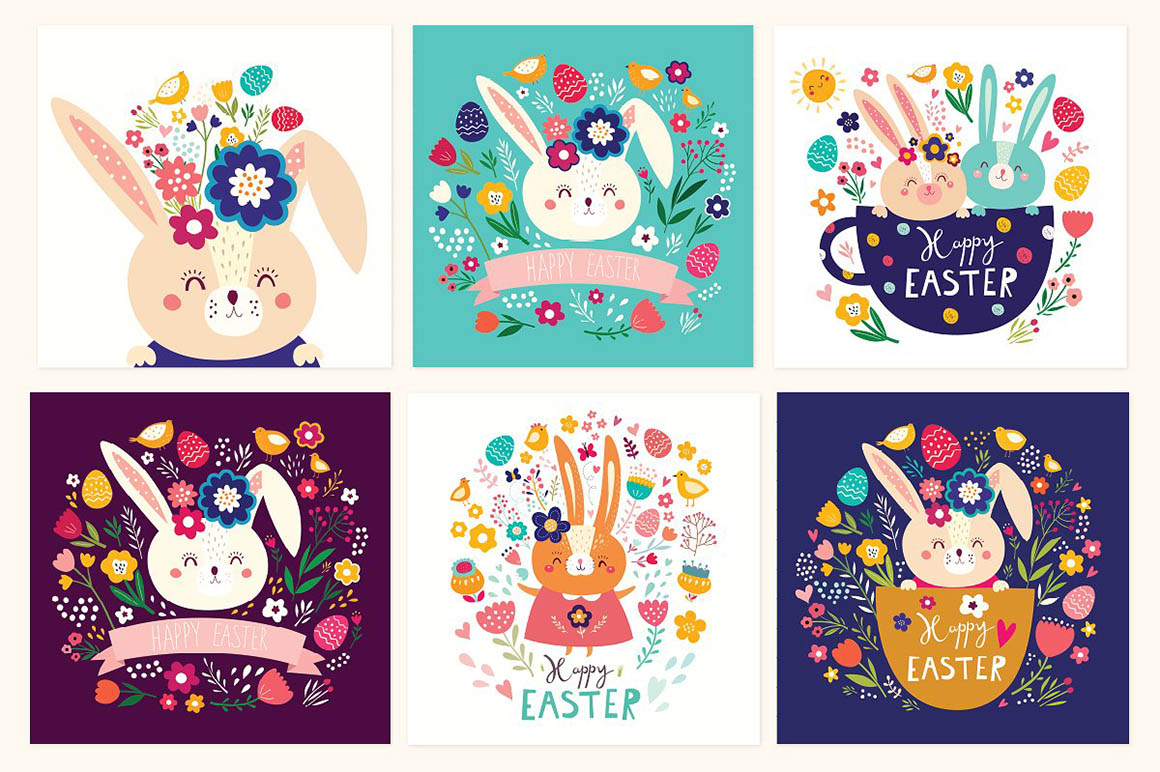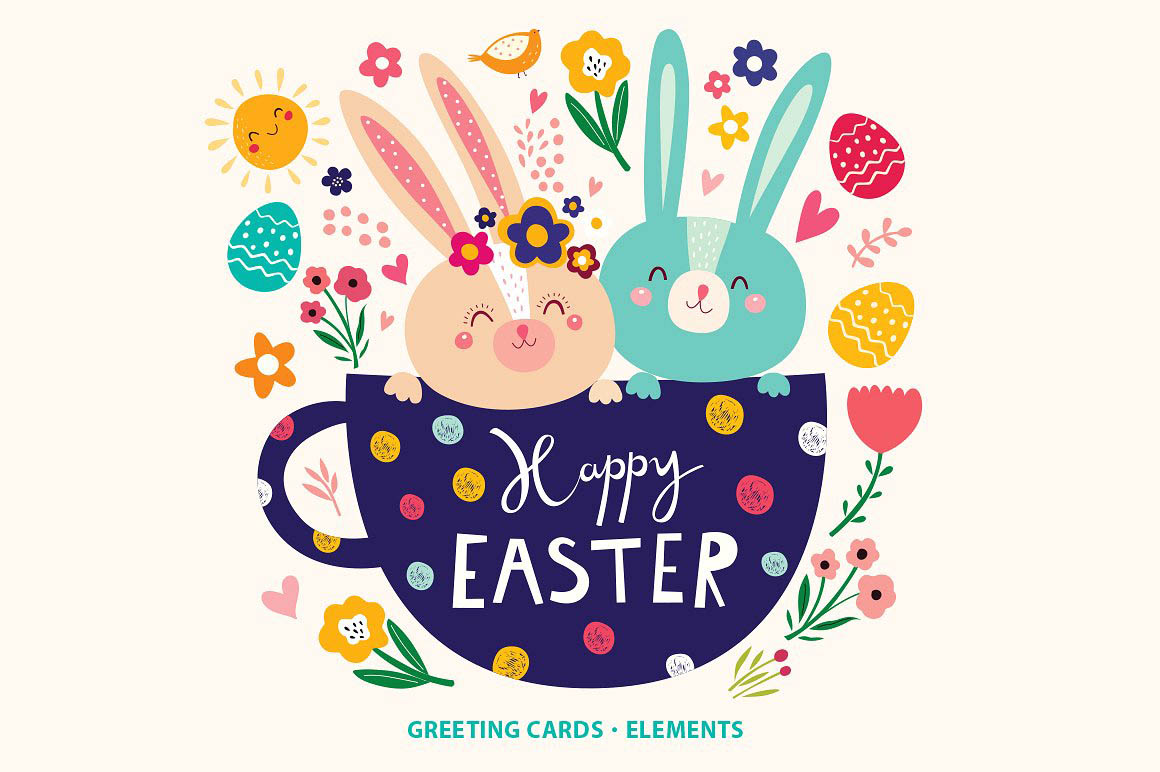 Huge collection of Happy Easter illustrations and decorative elements. Included greeting cards, tags, labels, decorative elements, symbols seamless patterns with cute bunny, Easter eggs, flowers.