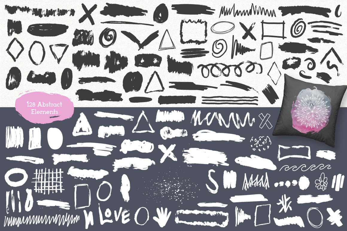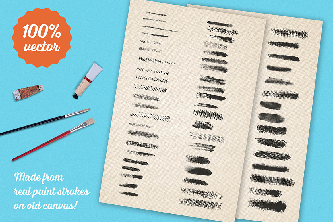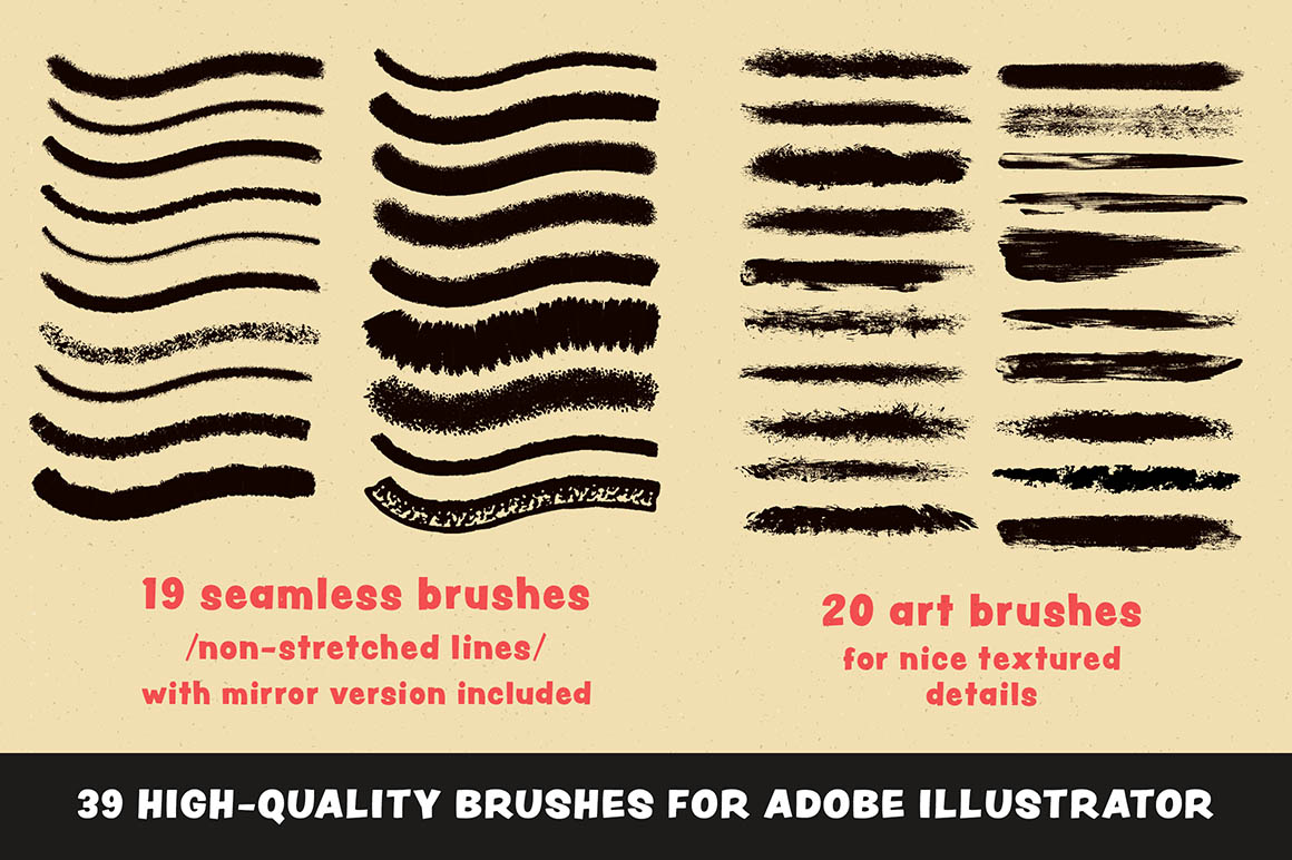 1950s Artist Brush Pack contains 19 seamless pattern based brushes and 20 art brushes for Adobe Illustrator. 39 vector brushes! Inspired by 1950s illustration I made these brushes by using ink, old brushes and my fingers. You can use these brushes for vector paintings and line art too. Scanned in high-resolution, cleaned and turned to vector. Best thing with these brushes is that you are not restricted by length of the stroke. You can draw different lines and they will be look same. It takes some time to create that brush, but it’s really useful for longer lines or textured shape borders. In this brush pack you can find 19 brand new seamless brushes. If you are using Adobe Illustrator CC, you can apply seamless brushes to shapes with one click and you will add nice textures without gap. All seamless brushes are in two version – normal and mirror. It saves you time and speed your workflow. Feel free to use brushes with Width tool – it gives you more and better options how to handle them. For version of CS6 – CS3 there is PDF with tutorial how to avoid gaps in shapes (this version do not contains corner tiles) . Furthermore, I created 20 high-quality and detailed finger-smudged and expressive art brushes. You can use them for line-art or adding textures to your vector illustrations or use them as a part of your design work.