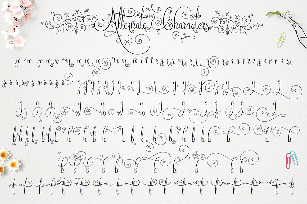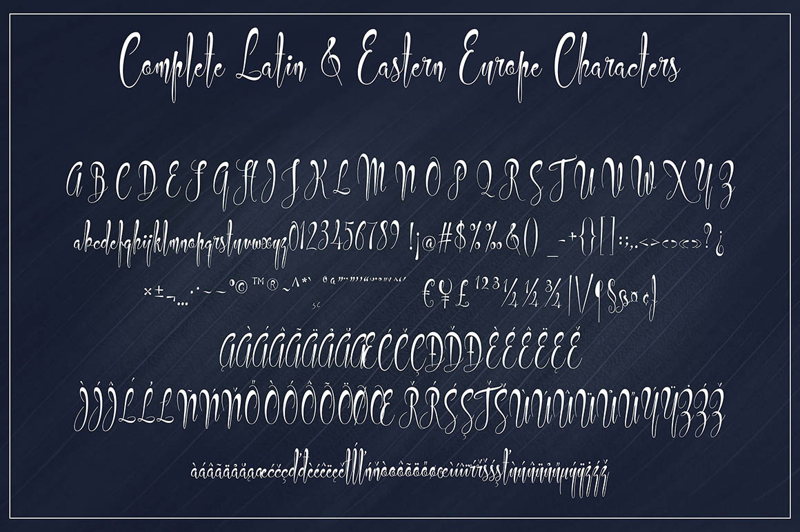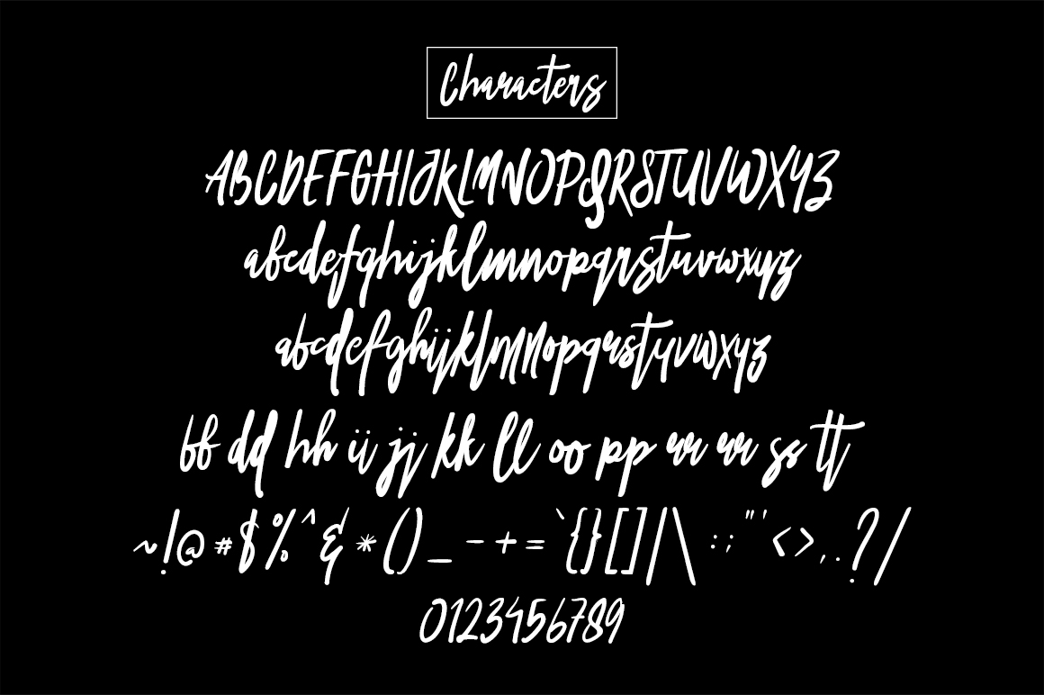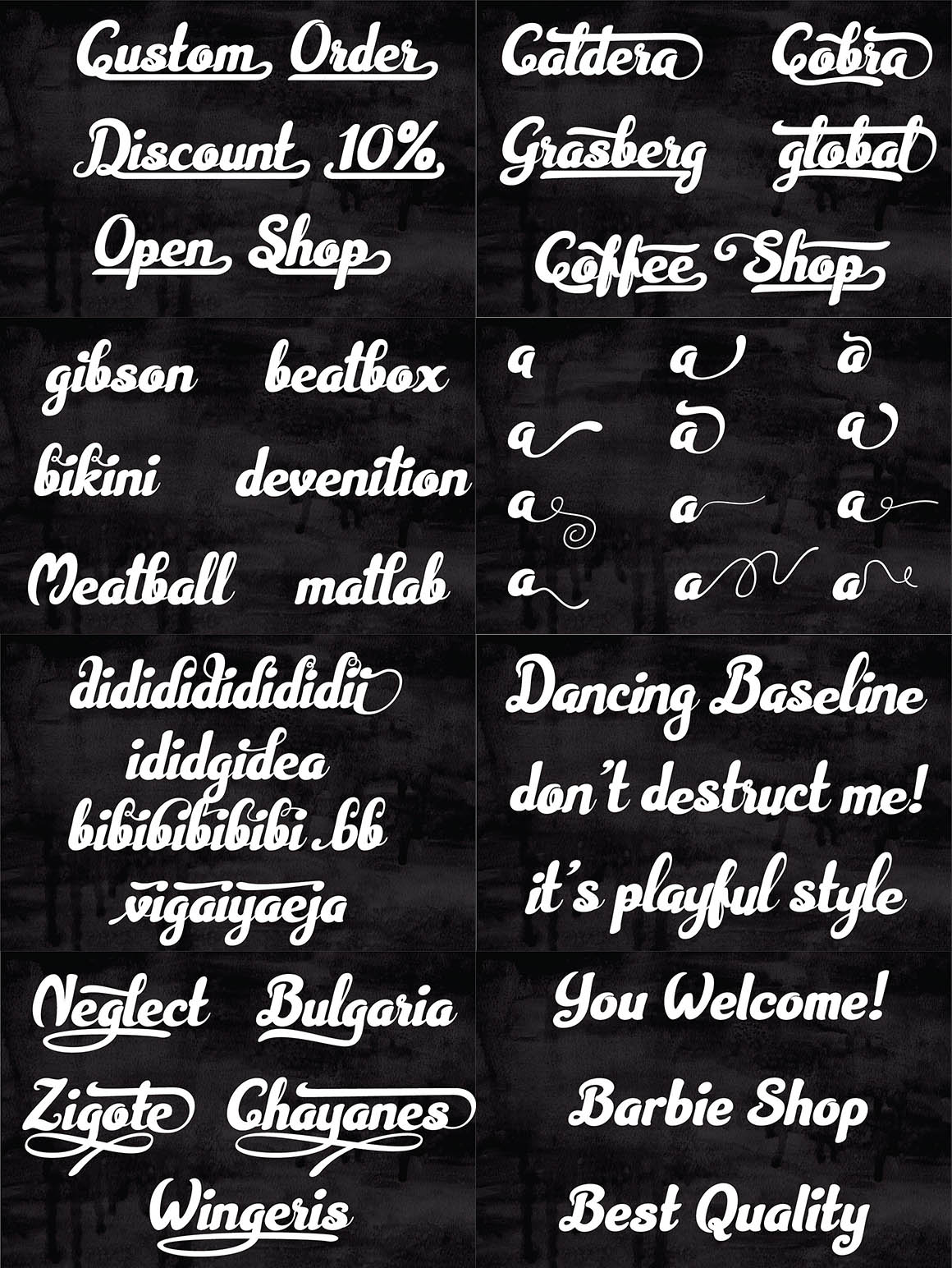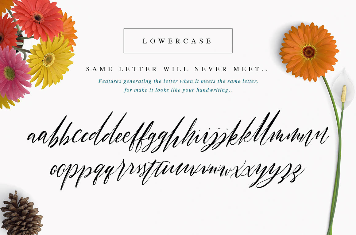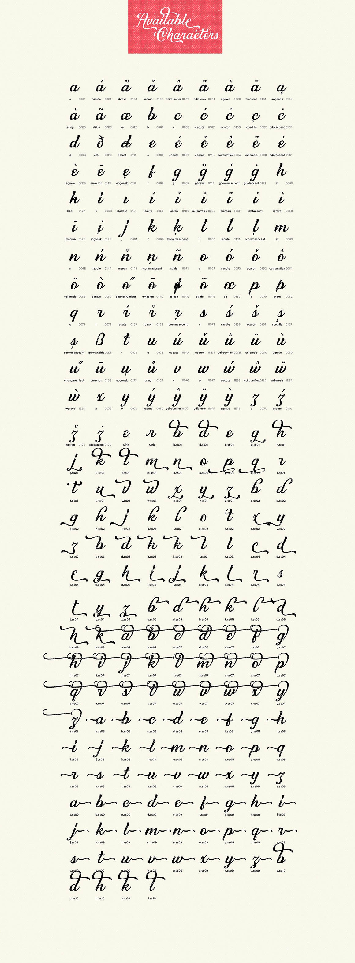 Script font that have a huge alternate characters this gives many options to choose the best for you. Inspired by the dynamic style of hand lettering script and created not too feminine or masculine to make it more unlimited style for your lovely work such as : logos, posters, invitation, wedding, artistic design, website header, t-shirt, accessories, souvenir, etc. Over 1000+ Glyphs with up to 25 alternate stylistic characters on some letter, and the Titling Alternates Features replacing the swash at Uppercase with the normal one, so if you want to type with uppercase just use the Titling Alternates. Tabular Lining if you want to create great price menu. Oldstyle Numeral also available if you need it. Punctuation, Mark, Symbol and Multiple Language Available.