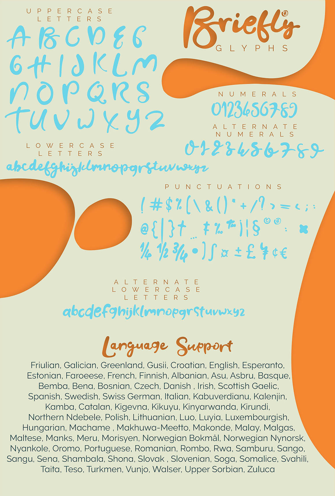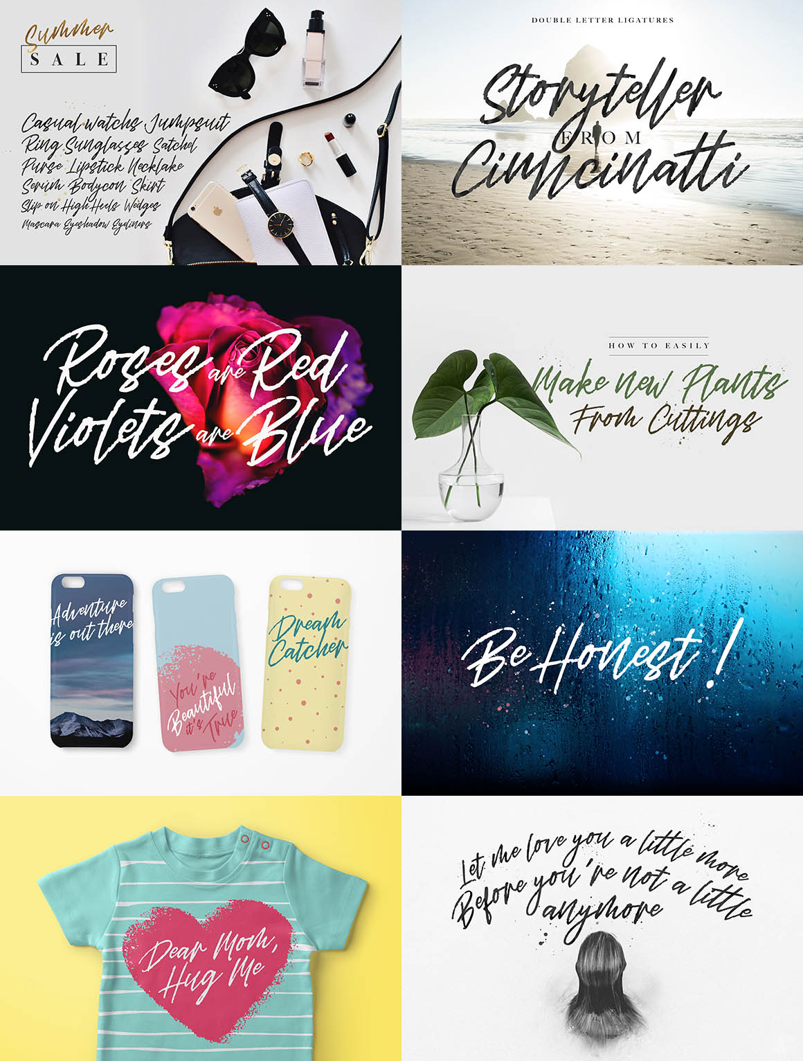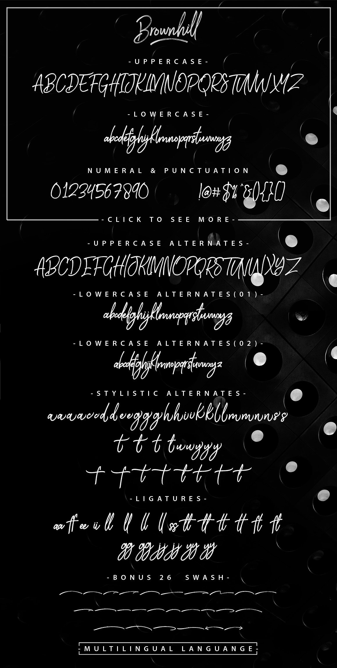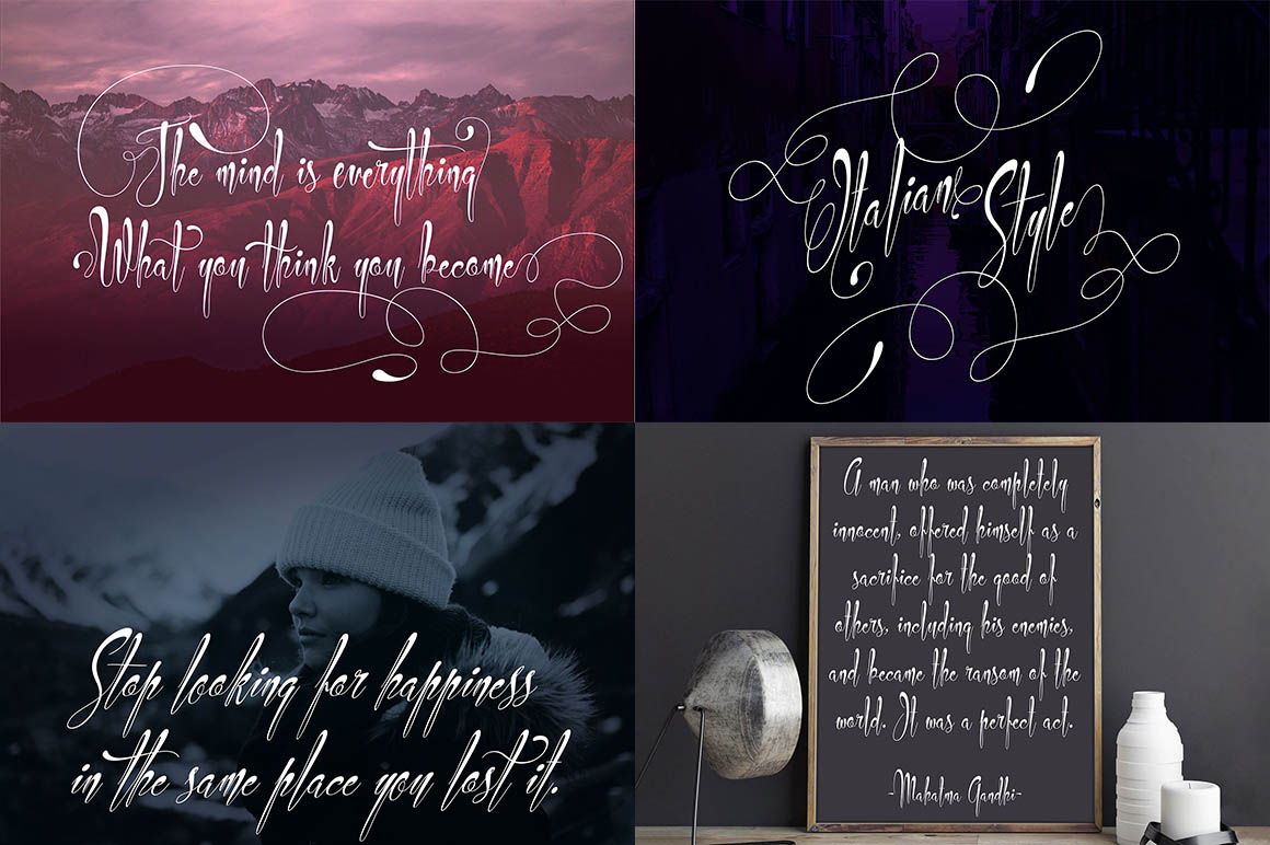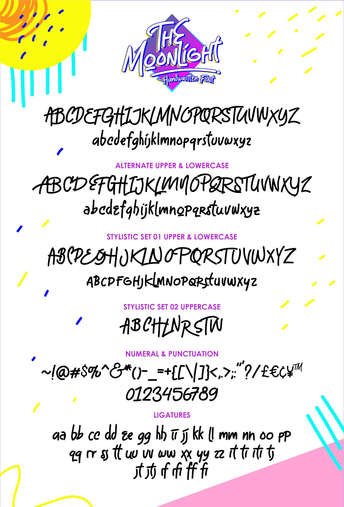 Script font that have a huge alternate characters this gives many options to choose the best for you. Inspired by the dynamic style of hand lettering script and created not too feminine or masculine to make it more unlimited style for your lovely work such as : logos, posters, invitation, wedding, artistic design, website header, t-shirt, accessories, souvenir, etc. Over 1000+ Glyphs with up to 25 alternate stylistic characters on some letter, and the Titling Alternates Features replacing the swash at Uppercase with the normal one, so if you want to type with uppercase just use the Titling Alternates. Tabular Lining if you want to create great price menu. Oldstyle Numeral also available if you need it. Punctuation, Mark, Symbol and Multiple Language Available.
