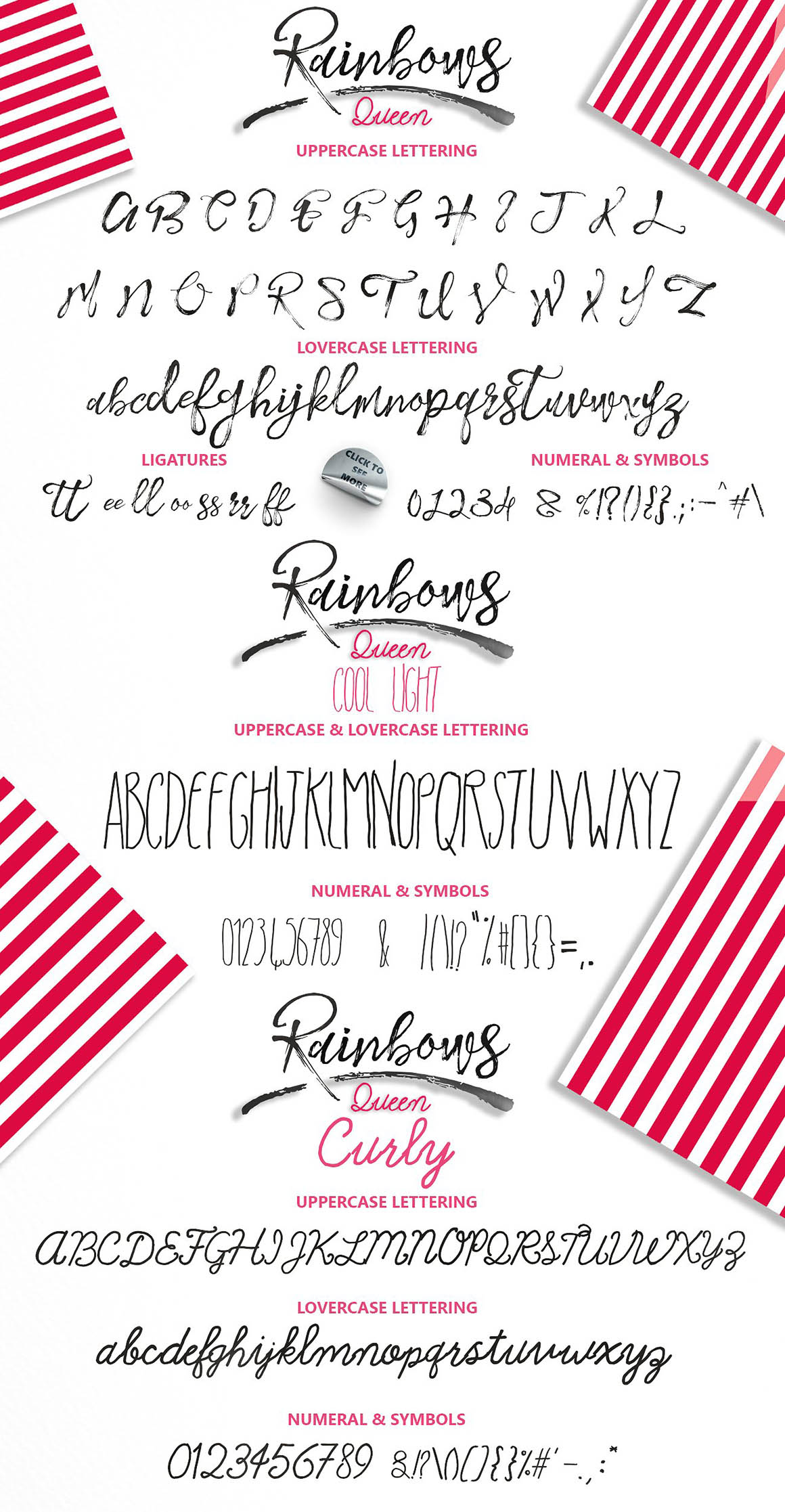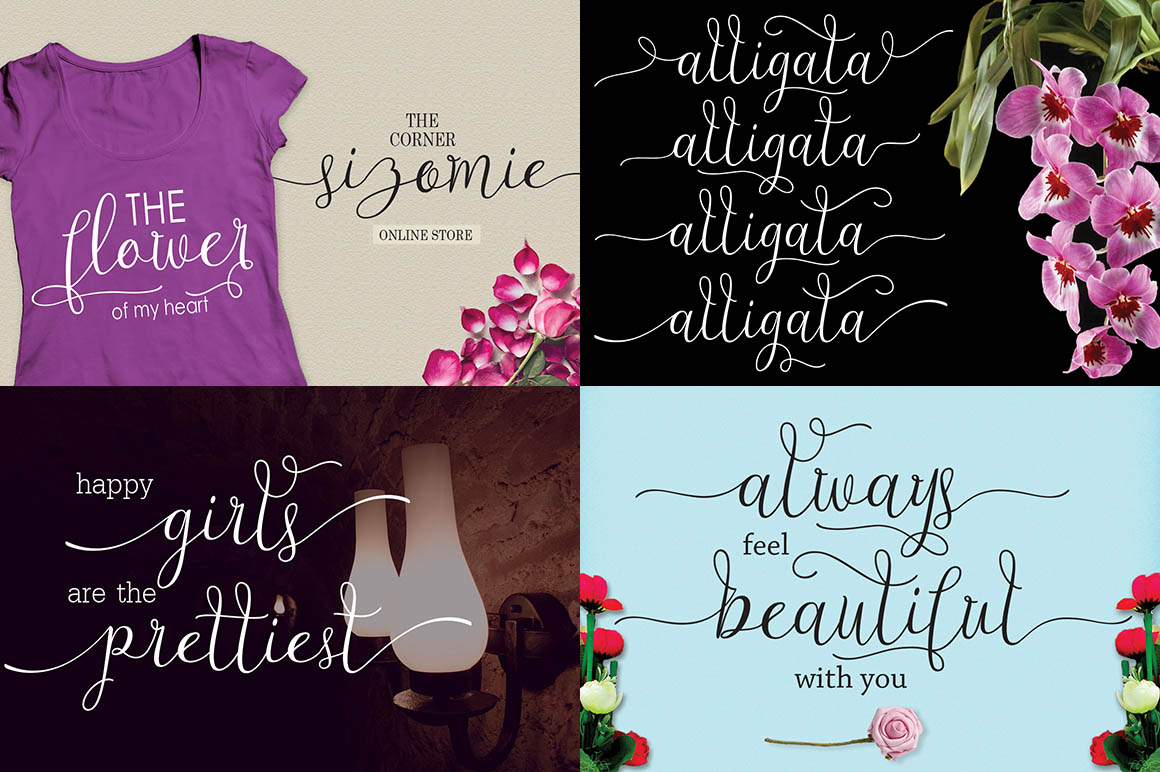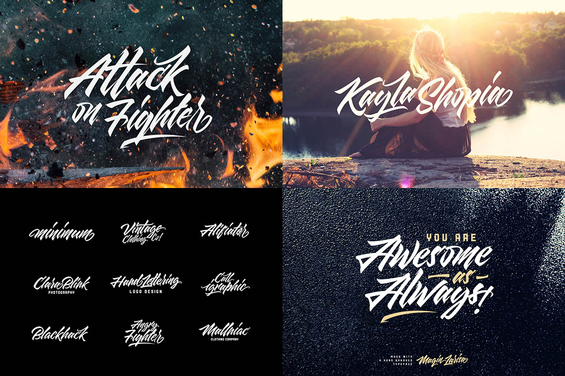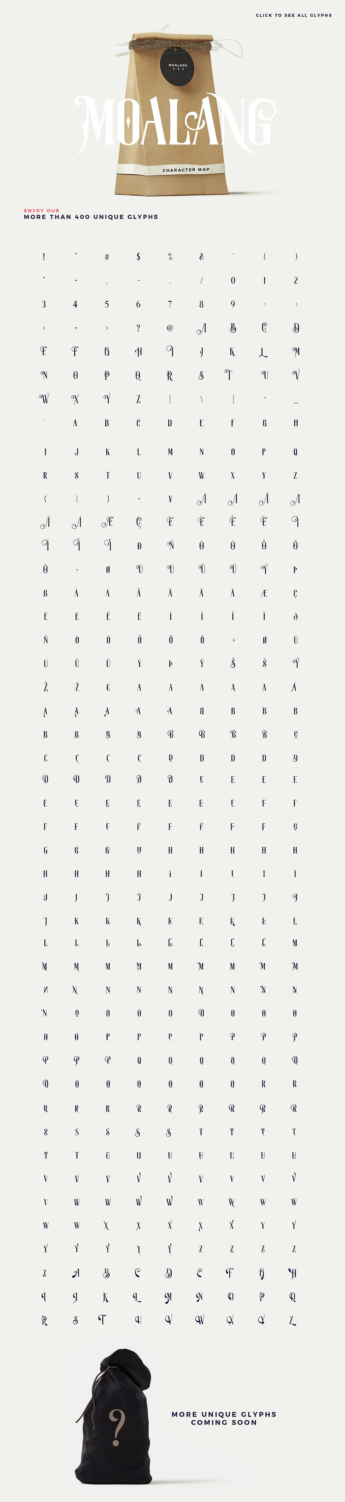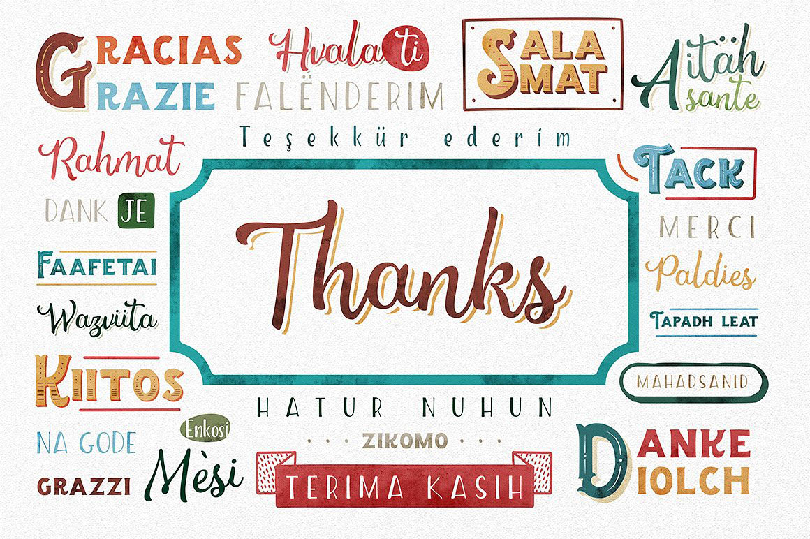 Script font that have a huge alternate characters this gives many options to choose the best for you. Inspired by the dynamic style of hand lettering script and created not too feminine or masculine to make it more unlimited style for your lovely work such as : logos, posters, invitation, wedding, artistic design, website header, t-shirt, accessories, souvenir, etc. Over 1000+ Glyphs with up to 25 alternate stylistic characters on some letter, and the Titling Alternates Features replacing the swash at Uppercase with the normal one, so if you want to type with uppercase just use the Titling Alternates. Tabular Lining if you want to create great price menu. Oldstyle Numeral also available if you need it. Punctuation, Mark, Symbol and Multiple Language Available.