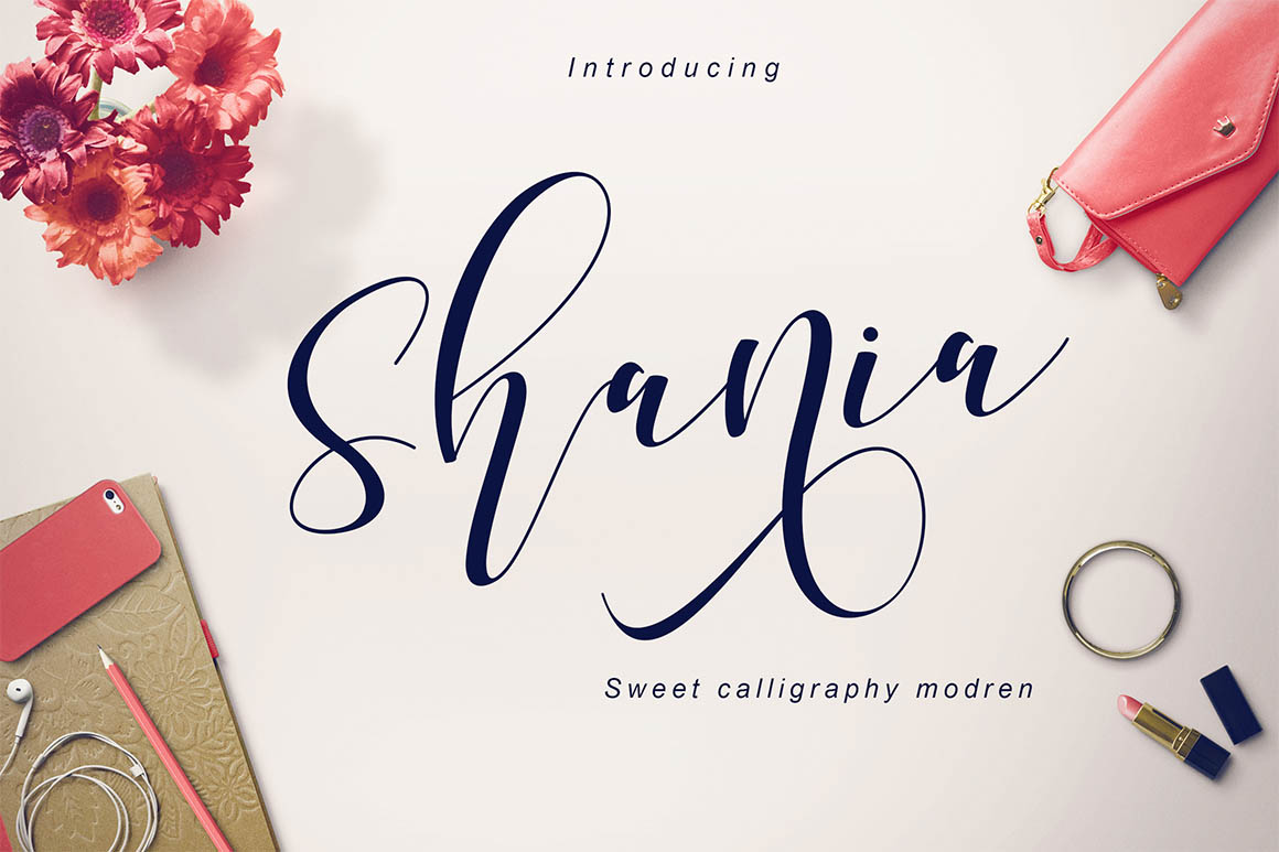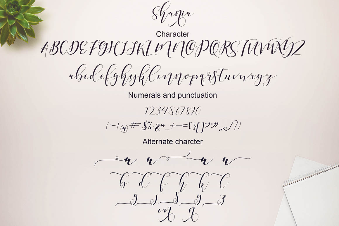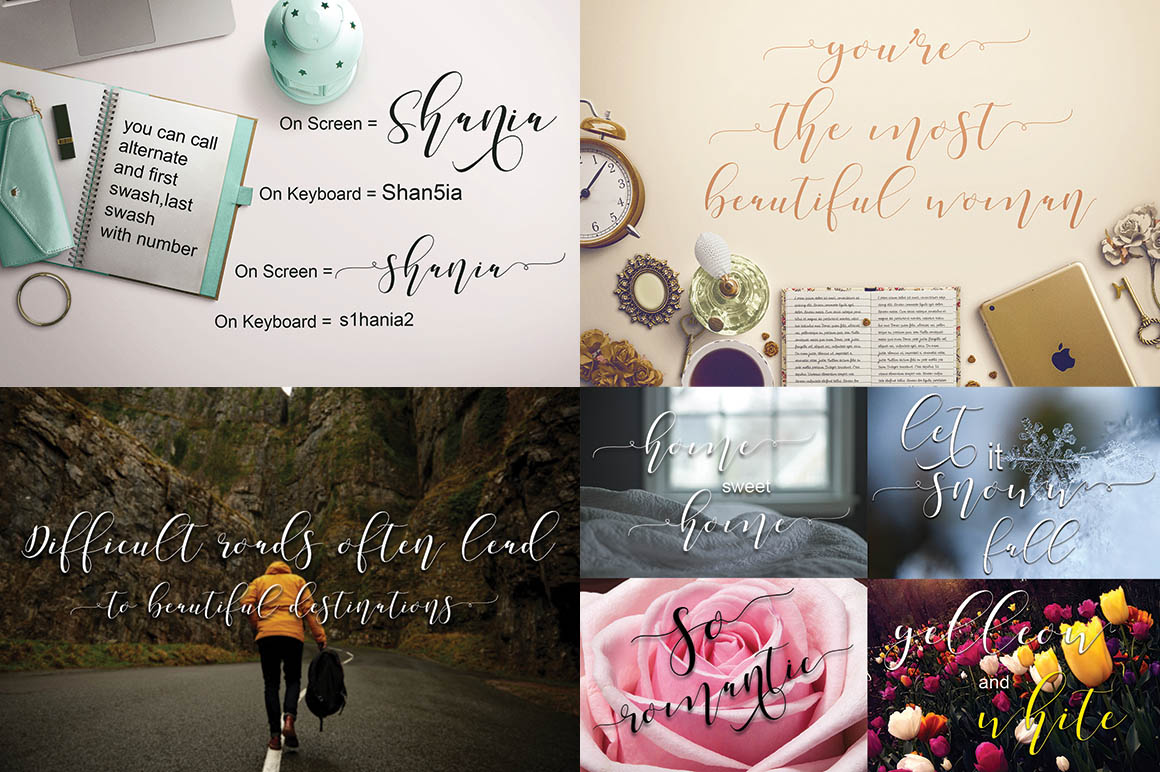 Shania a sweet calligraphy modern script style, decorative characters and a dancing baseline! So beautiful on invitation like greeting cards, branding materials, business cards, quotes, posters, and more!! Shania come with 270 glyphs. The alternative characters were divided into several Open Type features such as Swash, Stylistic Sets, Stylistic Alternates. The Open Type features can be accessed by using Open Type savvy programs such as Adobe Illustrator, Adobe InDesign, Adobe Photoshop Corel Draw X version, And Microsoft Word. And this Font has given PUA unicode (specially coded fonts). so that all the alternate characters can easily be accessed in full by a craftsman or designer.