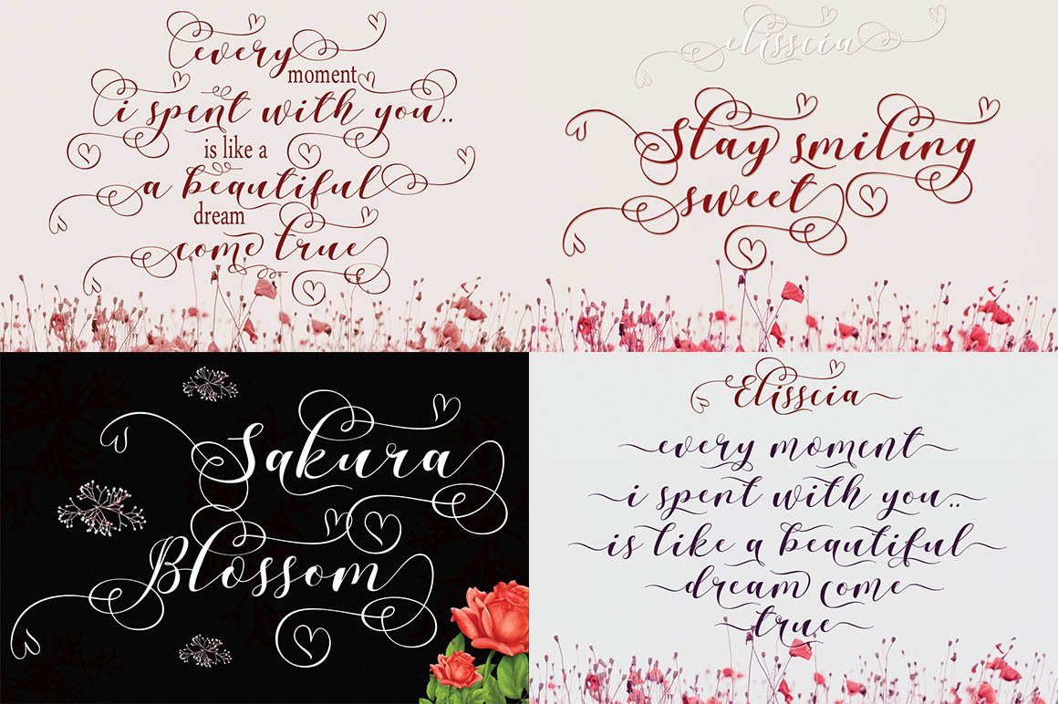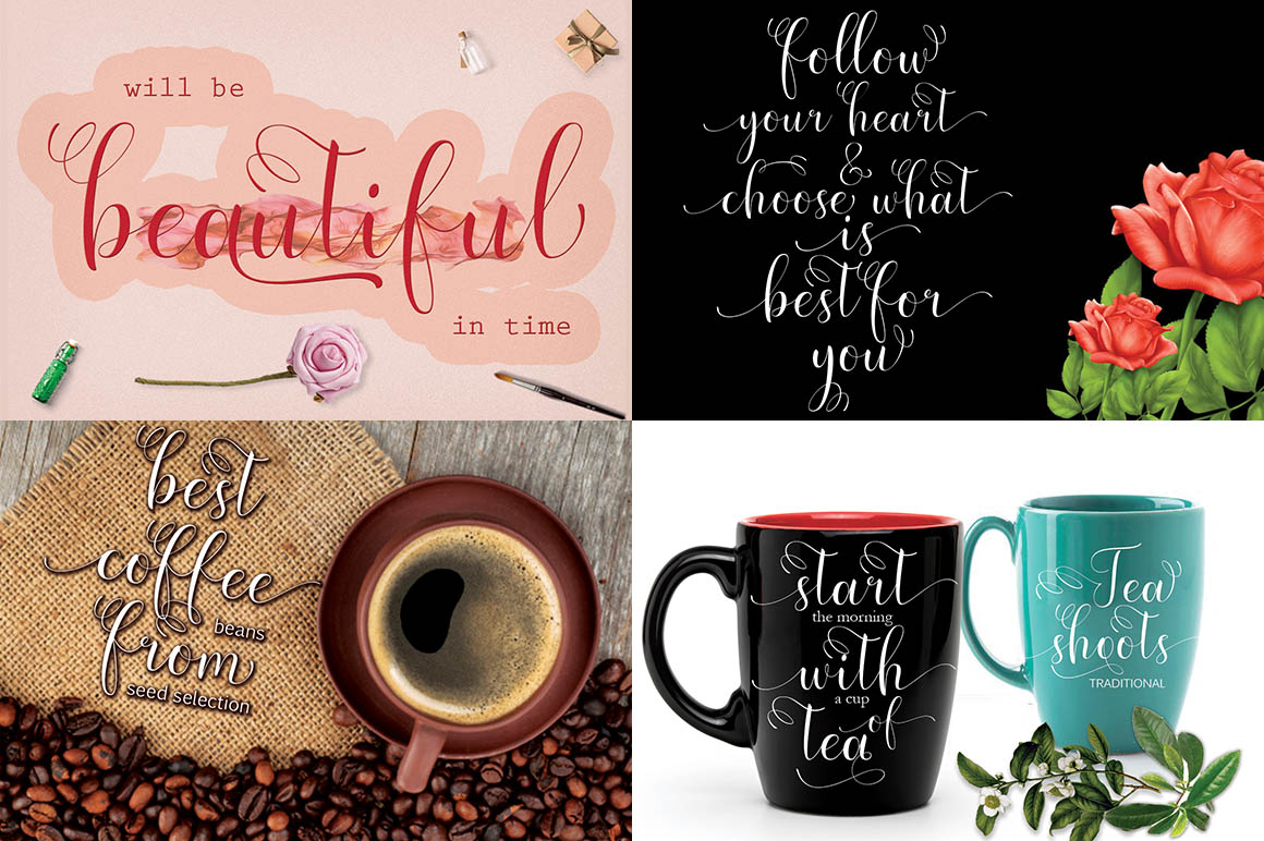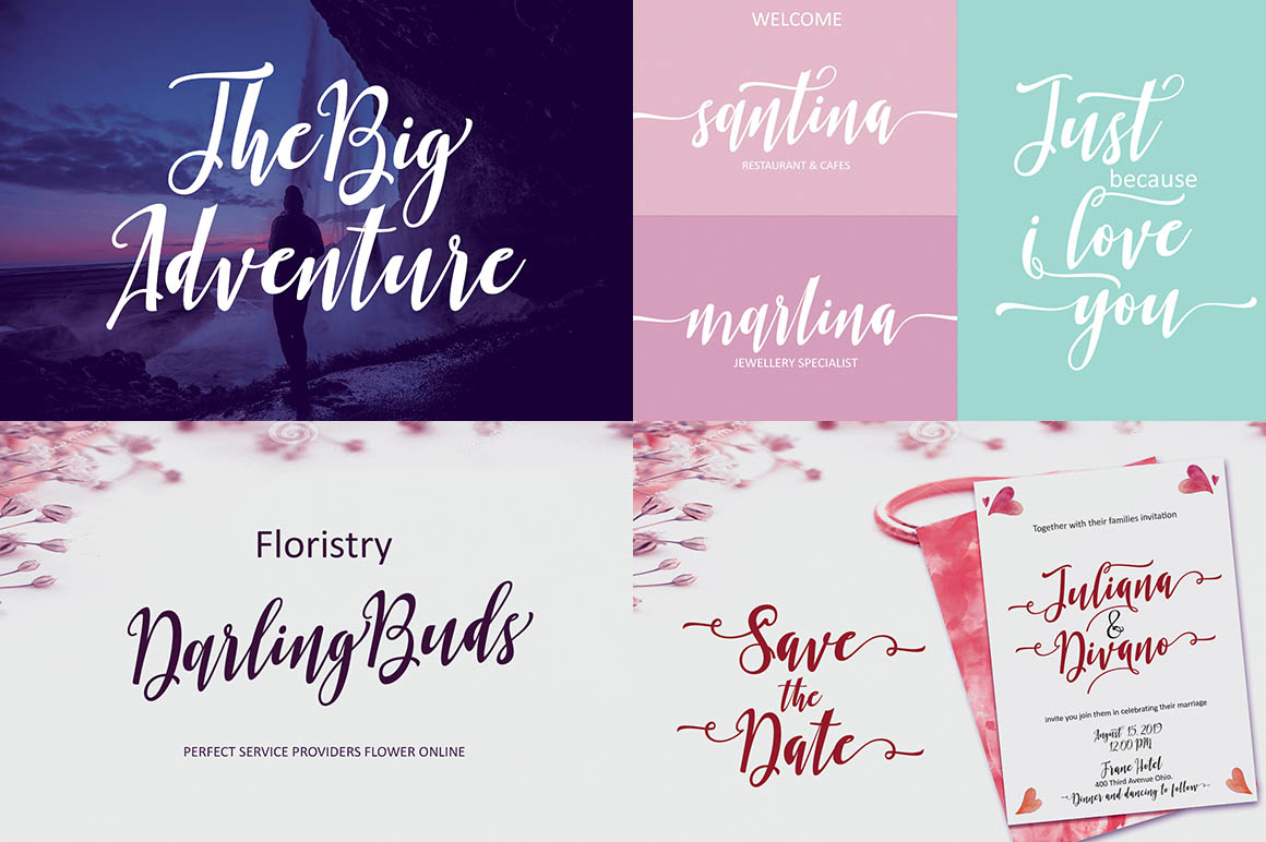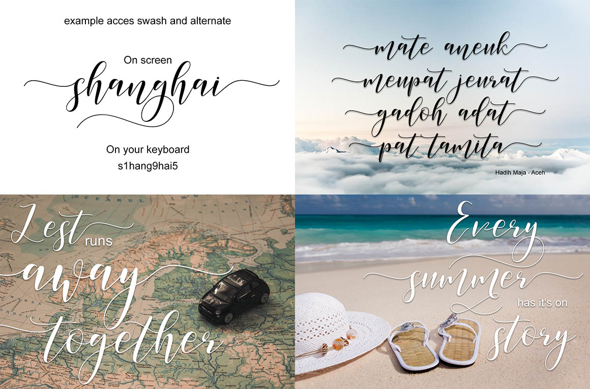 Shania a sweet calligraphy modern script style, decorative characters and a dancing baseline! So beautiful on invitation like greeting cards, branding materials, business cards, quotes, posters, and more!! Shania come with 270 glyphs. The alternative characters were divided into several Open Type features such as Swash, Stylistic Sets, Stylistic Alternates. The Open Type features can be accessed by using Open Type savvy programs such as Adobe Illustrator, Adobe InDesign, Adobe Photoshop Corel Draw X version, And Microsoft Word. And this Font has given PUA unicode (specially coded fonts). so that all the alternate characters can easily be accessed in full by a craftsman or designer.