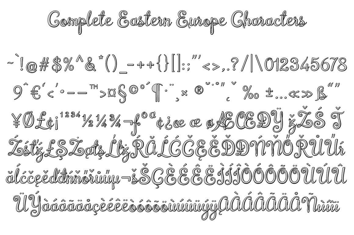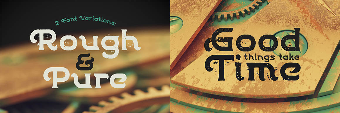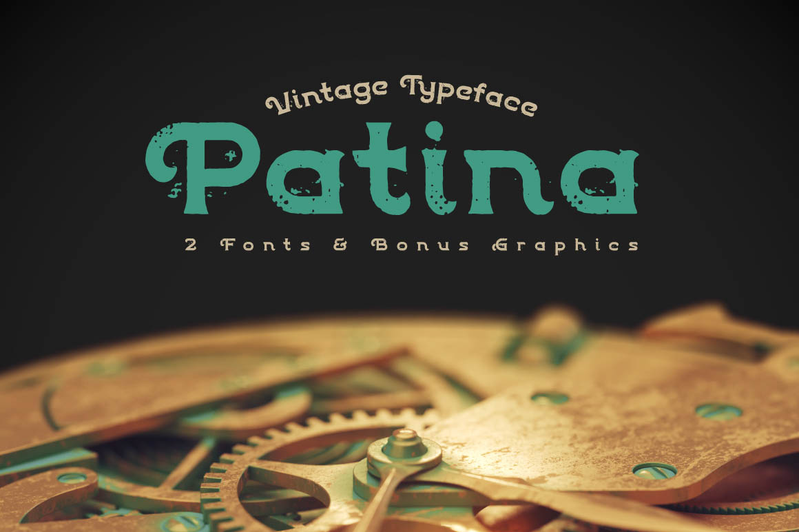 Hi! Introducing another one font set named “Patina”. It has two variations – with pure simple glyphs and with rough textured effect. Both of them has a multilingual support: support (all available characters you can see on the 3rd screenshot). Also, as a bonus, you will get a 3d rendered old metal watch gears, covered with nice patinated effect.
