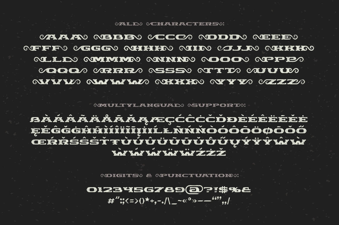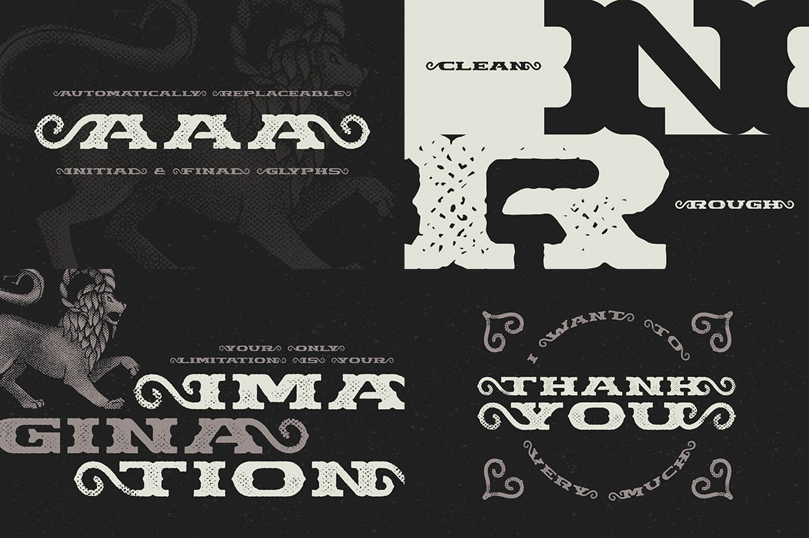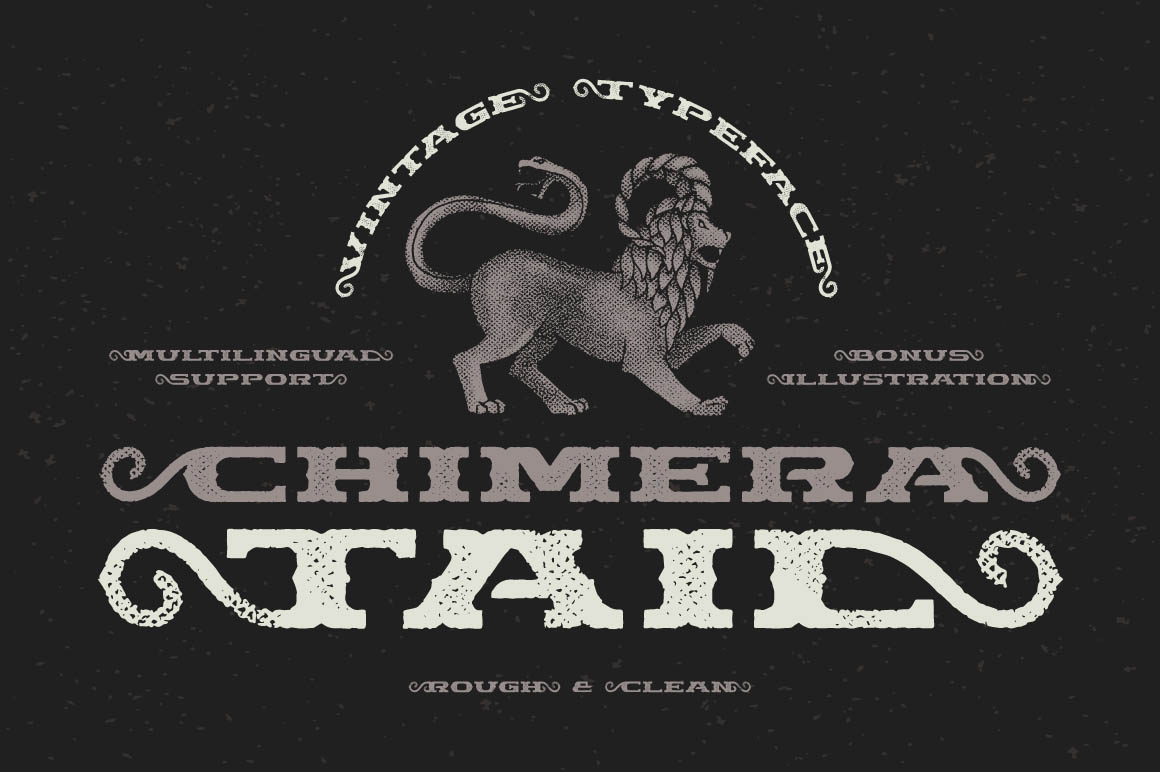 Hello! Presenting a vintage dark font “Chimera Tail”. It’s a wide textured typeface with automatically replaceable initial and final extended characters. Also a clean version without texture is included. As a bonus you’ll get a vector illustration of a chimera from the first screenshot.