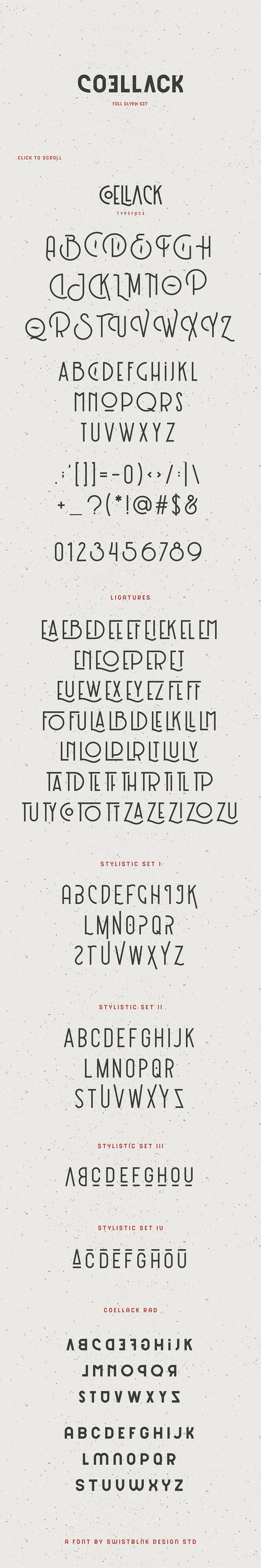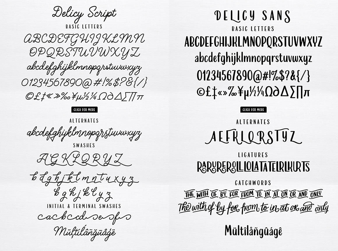 The Features : Sans, Serif, Condensed, and Catchword are have standard features like full the Alphabetical Letters with the number and punctuations indeed. Except the Script, This script have a special features on Contextual Alternates (stops lowercase letter after space), stylistic alternates, ligatures, and initial and terminal.