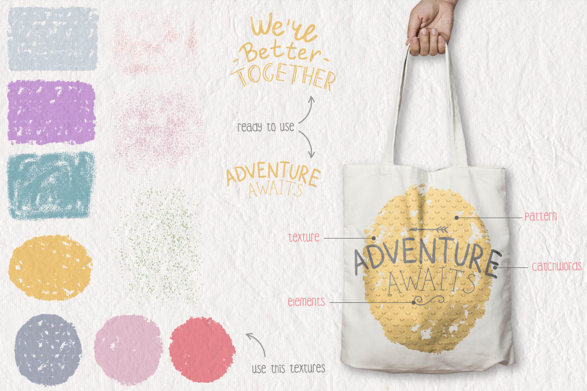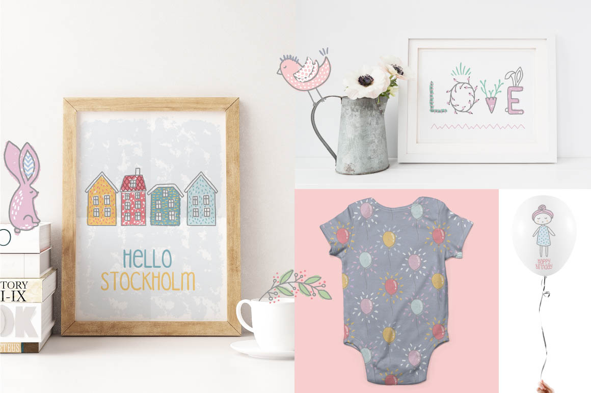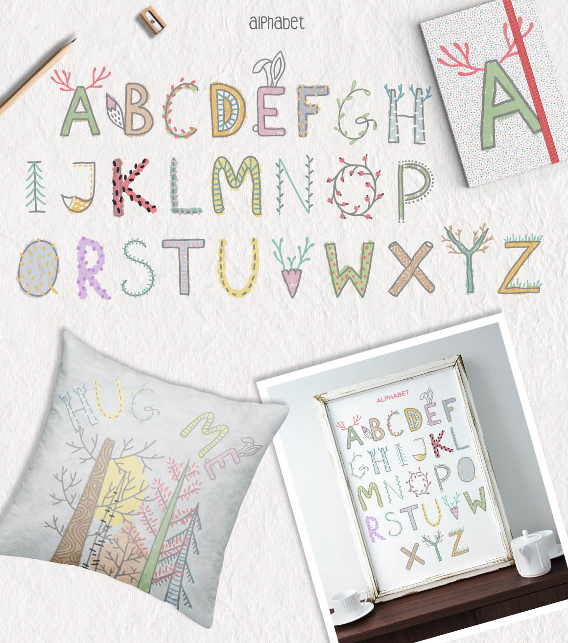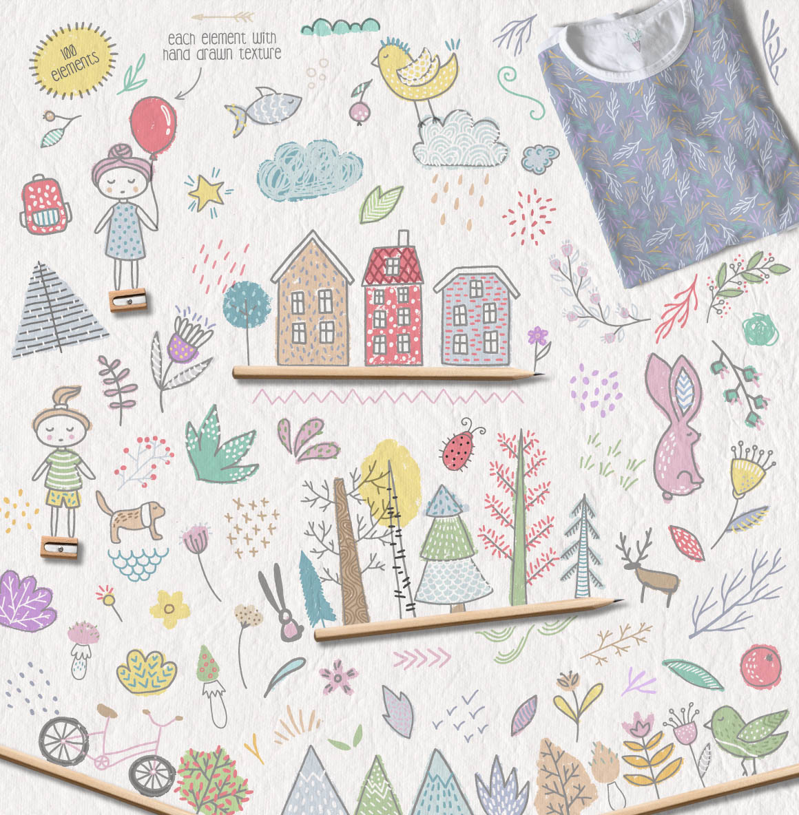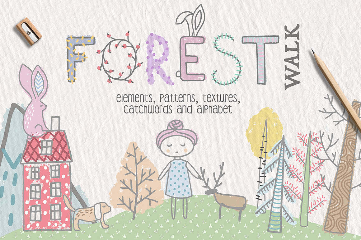 It’s forest walk with cuties! To create this collection I used pencil. Be sure to click on the image to see all the cuties. Create postcard with hand drawn alphabet for a friend or decorate child’s room. This package includes elements that will help you in your design: animals, flowers, patterns, hand drawn textures, alphabet and houses. Create an invitation or use for your small business.