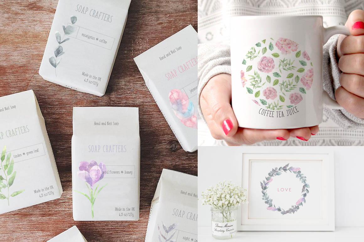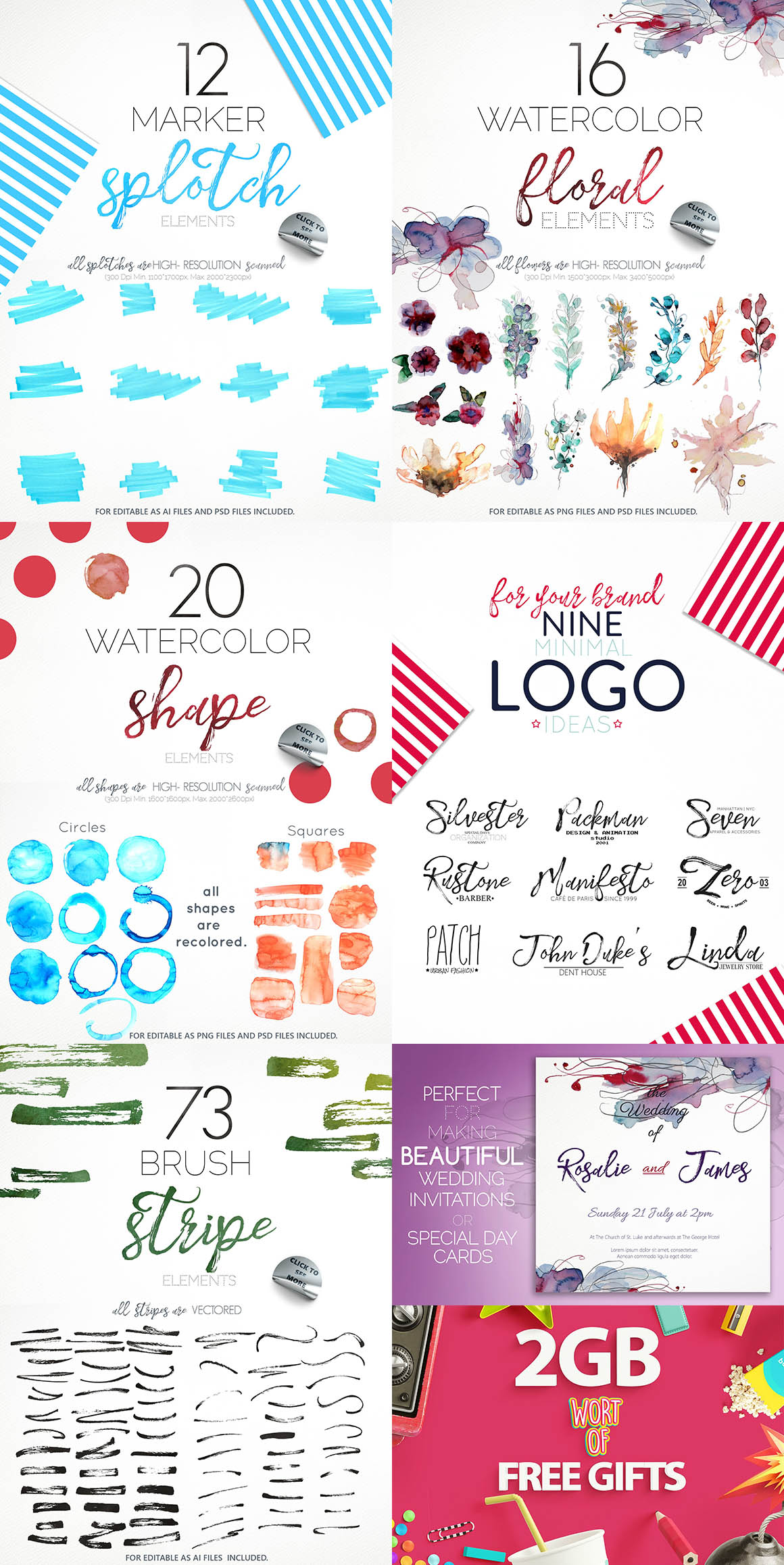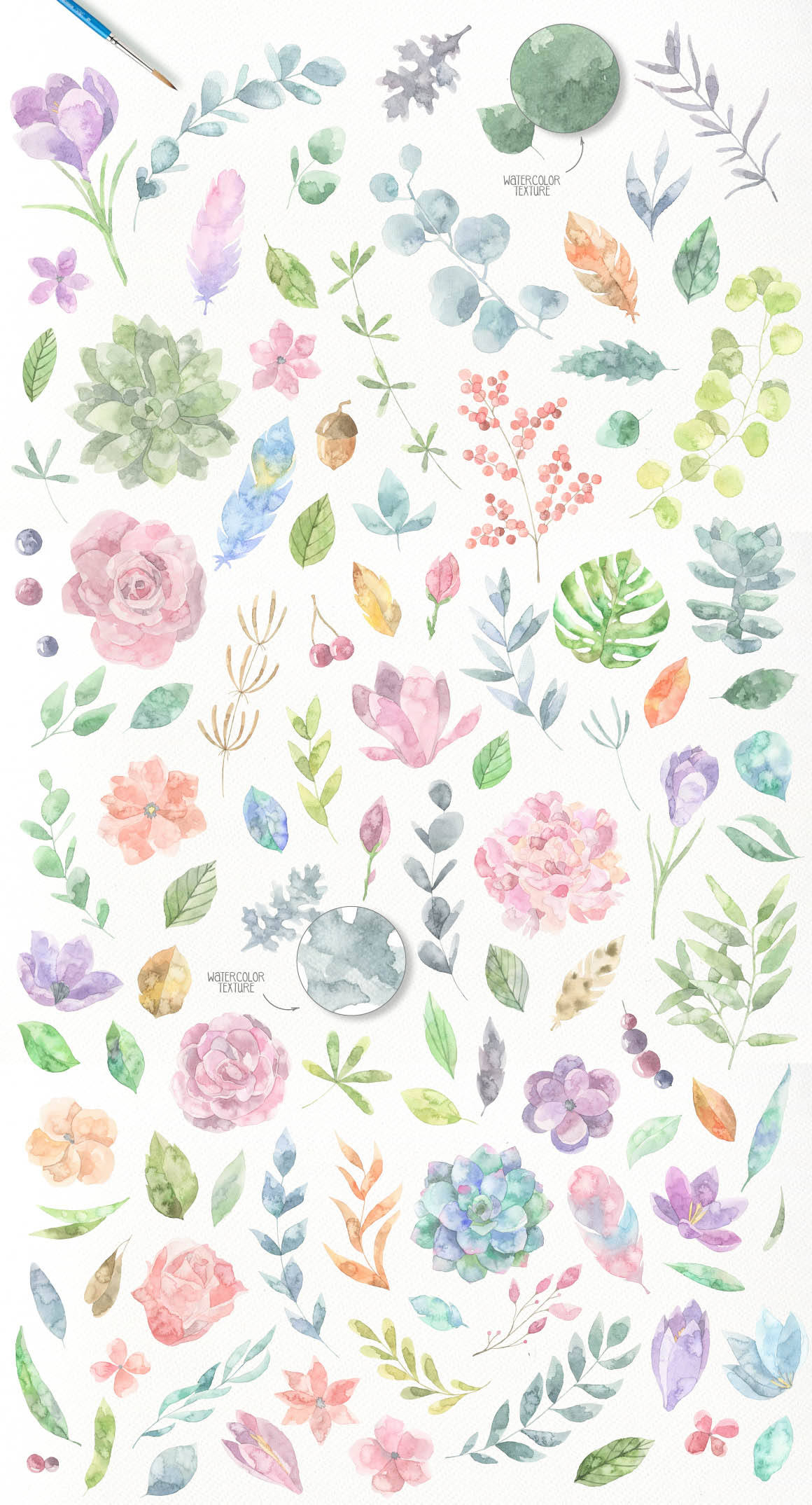 - WATERCOLOR OBJECTS [ It’s 105 watercolor elements : leaf, flowers, berry and other elements ];
