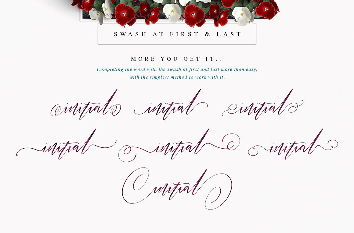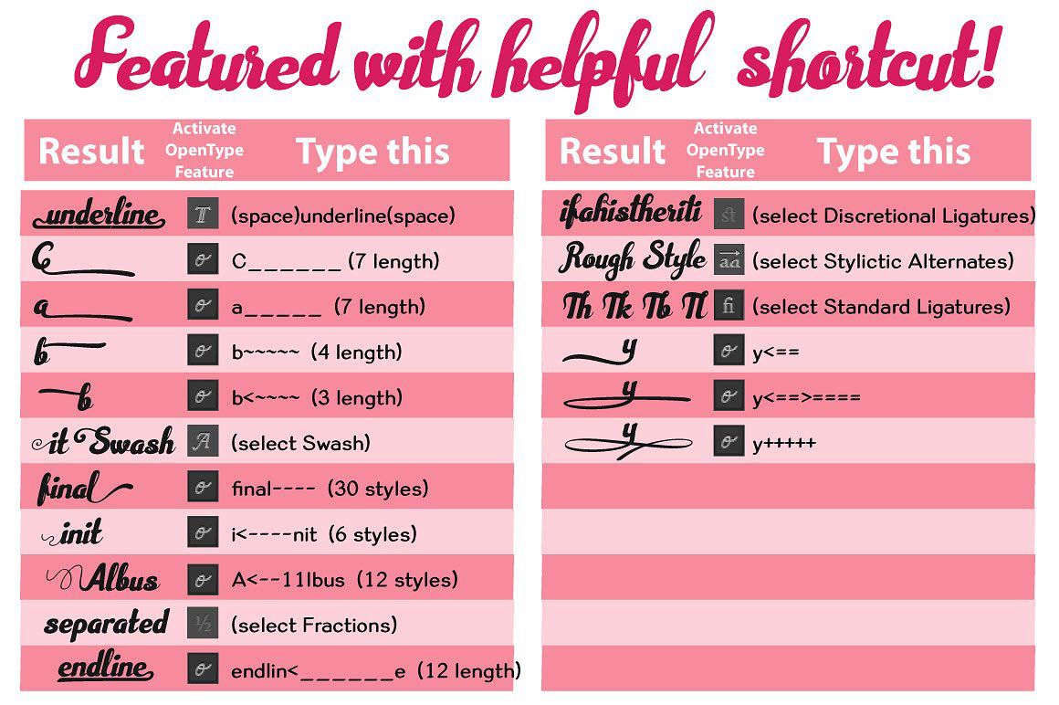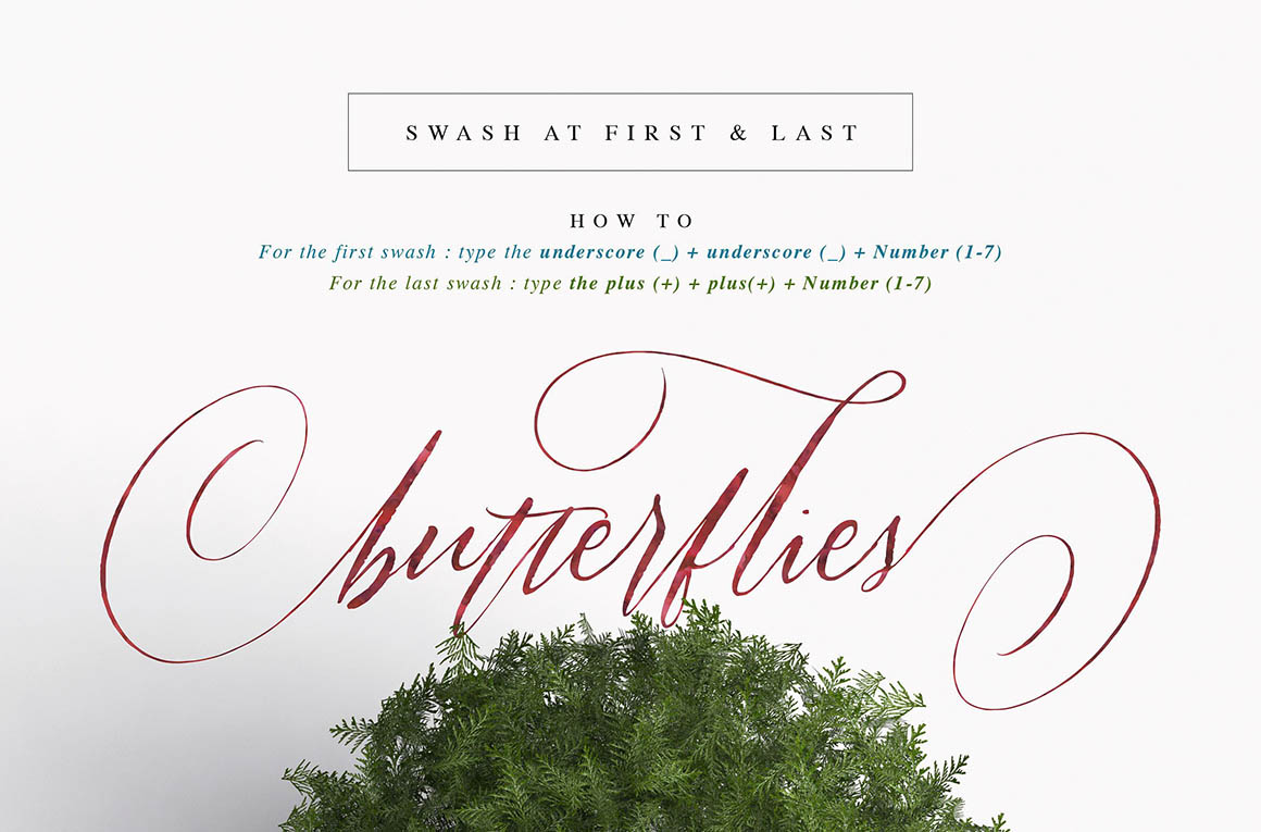 Swash at first & last : Refined the first & last letter with 7 options, look at display no 5 for the example. and for use, you can use it in type tester below. for the first swash using double underscore + number 1-7 , and for the last swash using double plus + 1-7. To try this method just copy and paste this word = __1beautiful++1 , or __7butterflies++7 . Follow the guide on display no 6.