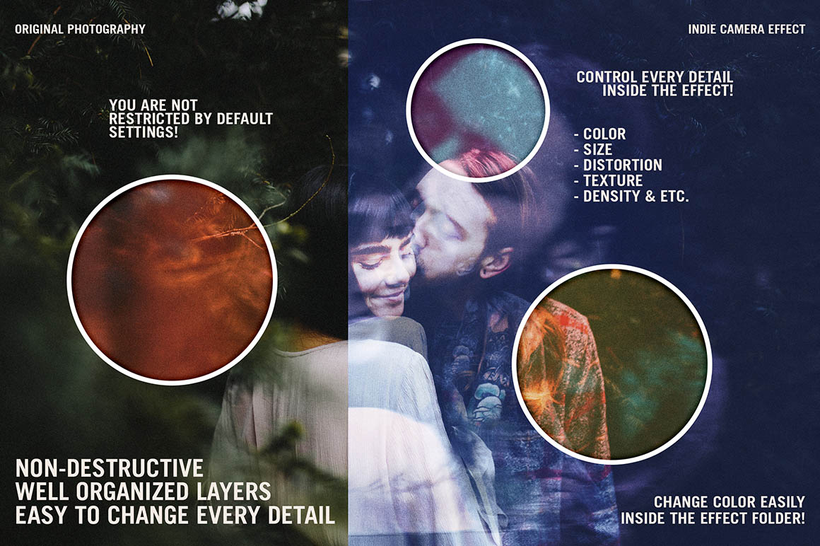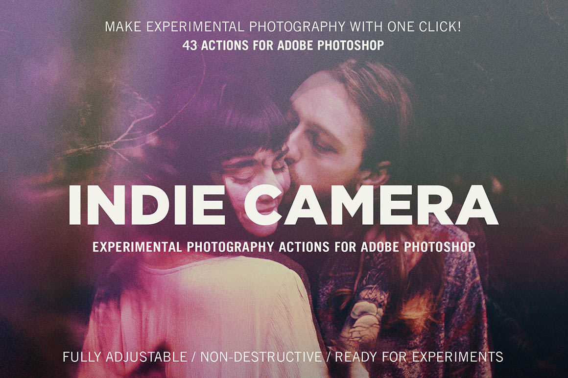 Indie Camera for Adobe Photoshop is an ultimate collection of experimental photo actions. It includes 43 brand new actions inspired by experimental photography. Furthermore there is 24 Lomo Photography Actions first published in 2014, but revised and made with better folder organization. As free bonus you will get 27 Black and White Actions made by Guerillacraft in 2015. This powerful set contains over 90 actions ready to use in Adobe Photoshop. Indie Camera was highly inspired by cover photos of weird indie bands. If you are looking for something special, that will pop out, you have found it now! Don’t you like quirky actions that flatten image and you have no chance to adjust anything? I really don’t! Indie Camera Actions are non-destructive, well organized and completely adjustable! Don’t be restricted by default action setting. You have full control over every tiny detail. Just click on effect inside layer and transform it as you want. Do you like an effect but you want other color? No problem, just choose different gradient map. It sooo easy!