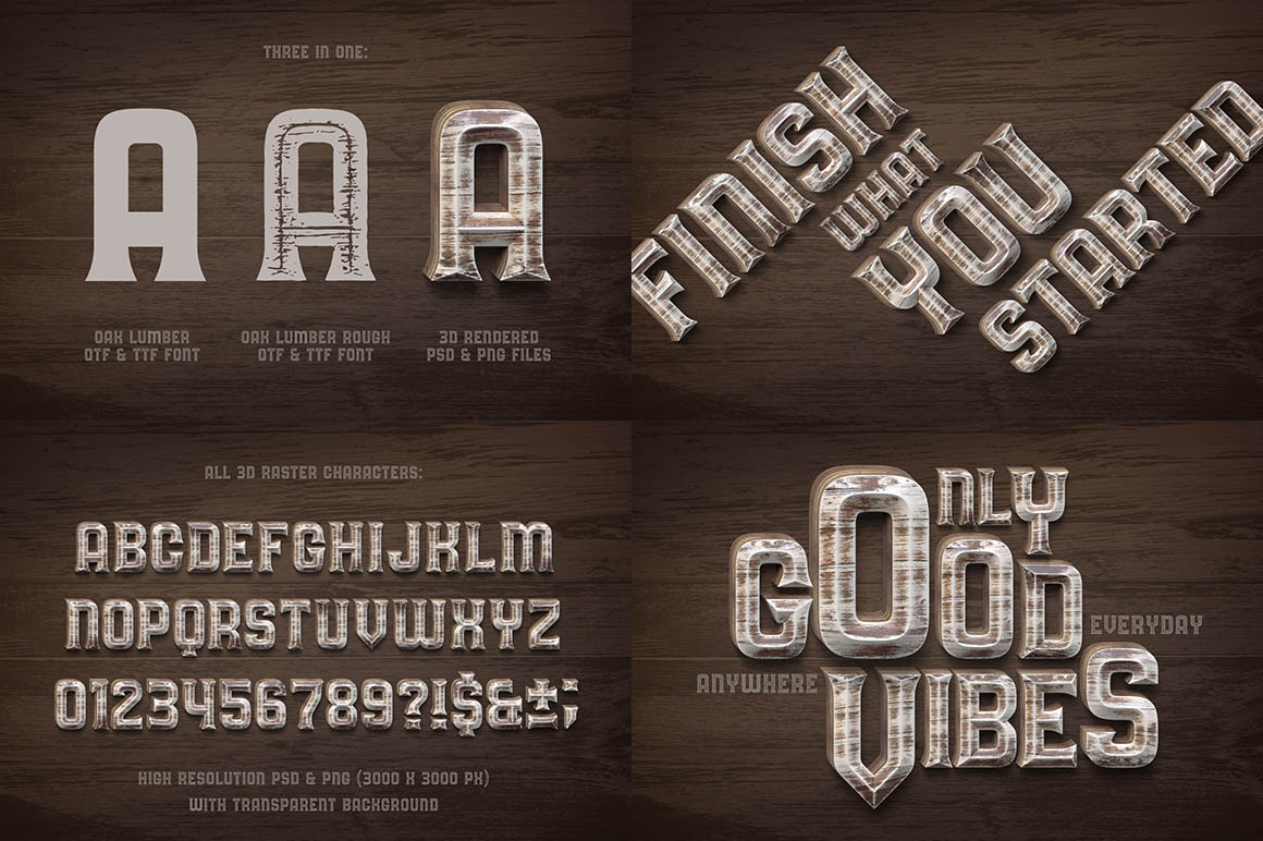 Hello! Presenting a font set Oak Lumber. It consists of a 3d rendered high resolution characters in PSD & PNG formats with transparent background. And two styles (clean & rough) of this font in usual OTF & TTF formats with multilingual support. Also a background texture and all characters in vector EPS are included.