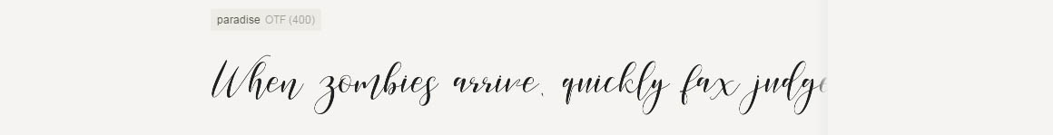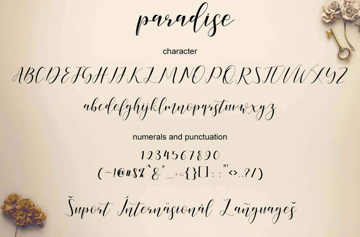 Paradise modern script style, decorative characters and a dancing baseline! So beautiful on invitation like greeting cards, branding materials, business cards, quotes, posters, and more!! Paradise come with 393 glyphs. The alternative characters were divided into several Open Type features such as Swash, Stylistic Sets, Stylistic Alternates. The Open Type features can be accessed by using Open Type savvy programs such as Adobe Illustrator, Adobe InDesign, Adobe Photoshop Corel Draw X version, And Microsoft Word. And this Font has given PUA unicode (specially coded fonts). so that all the alternate characters can easily be accessed in full by a craftsman or designer.