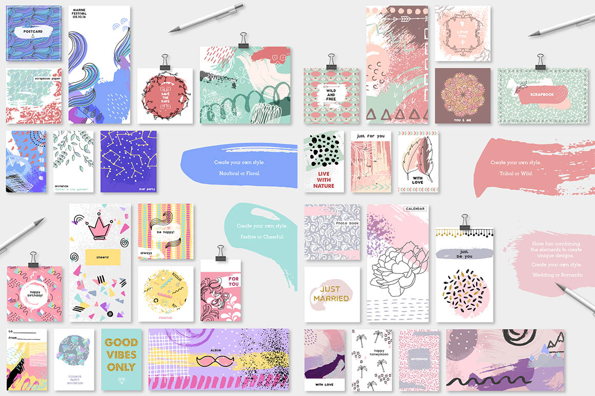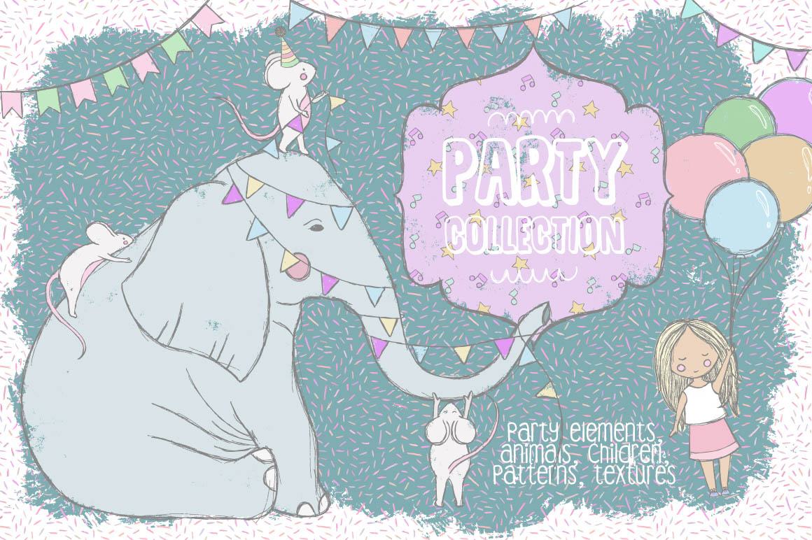 These cuties started a fun party! Join them! Be sure to click on the image to see all the cuties. Create postcard with hand drawn elephant for a friend or decorate child’s room. This package includes elements that will help you in your design: animals, flowers, patterns, hand drawn textures, party elements and more. Create an invitation or use for your small business.