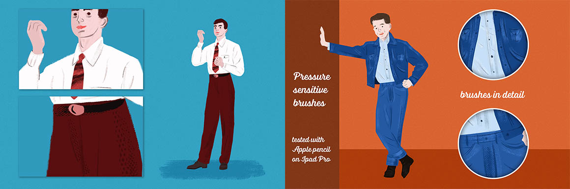 Preppy Art contains 59 high-quality brushes for Adobe Illustrator. Made with real paint strokes on canvas! I made a lot of research on 50s and 60s illustration used in magazines. I collected illustrations from men and fashion magazines from that era. I love illustrated advertisigns especially! With such great inspiration I started making these brushes. I used acrylic paint and old canvas and hade a little fun. When you are making textured vector brushes, struggle always is to find balance between nice stroke shape and texture. I really liked the idea of strokes with canvas textures and half-dried paint on brush tip. It creates beautiful dynamic effect in your illustrations. After I made tons of pain strokes, I selected the best ones and started making magic in Adobe Illustrator. I cleaned all messy parts and vectorized them in high resolution. But no one likes the slowing brushes, so I kept it “draw-friendly” – you can draw with them without your computer is going mental! Recently I started using Ipad Pro with Adobe Illustrator (with Astropad app) so I made a pressure sensitive version of the brushes. You can control the weight of strokes while you drawing, so it saves your time! Tested with Apple pencil on Ipad Pro, but it works fine with other styluses. With Preppy Art Brushes you can make a stunnig vector illustration and get nice retro feeling into your artwork!