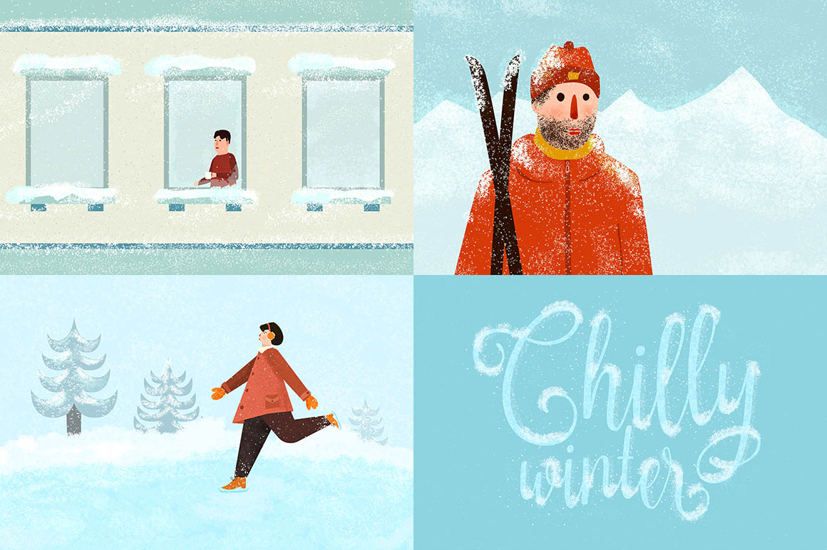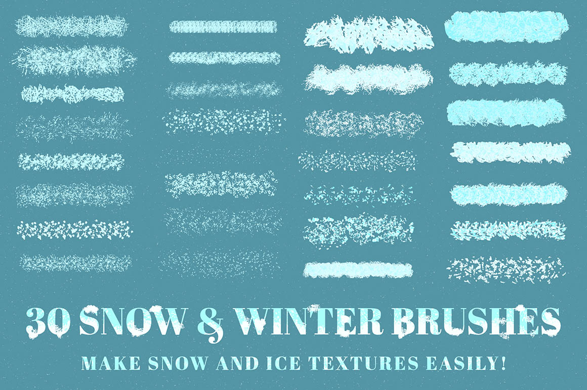 Snow and Winter Brushes for Adobe Illustrator contains 30 powerful brushes for your winter projects. With these brushes, you can make snow and ice textures easily. Just draw over your graphics to add chilly winter details. Use it for Christmas Cards or Winter party posters. In this brush pack there are two kinds of scatter brushes. You can choose between the one color brushes and multishades. One color brushes are great for texturing bigger spaces. You can make falling snow effect with them. With multishades scatter brushes you can make beautiful vector icy effects. Mix them together, play with blending mode /normal, overlay, multiply/ to get perfect freezy effect! Great for illustrations, lettering and typography effects! Snow and Winter Brushes are best tool for making winter graphics in Adobe Illustrator!