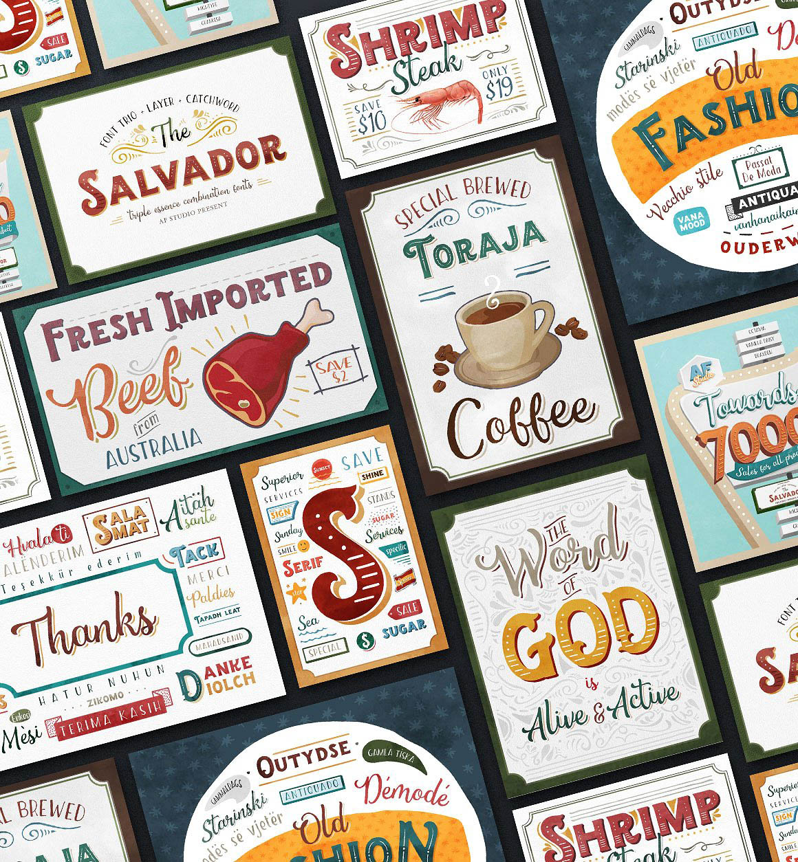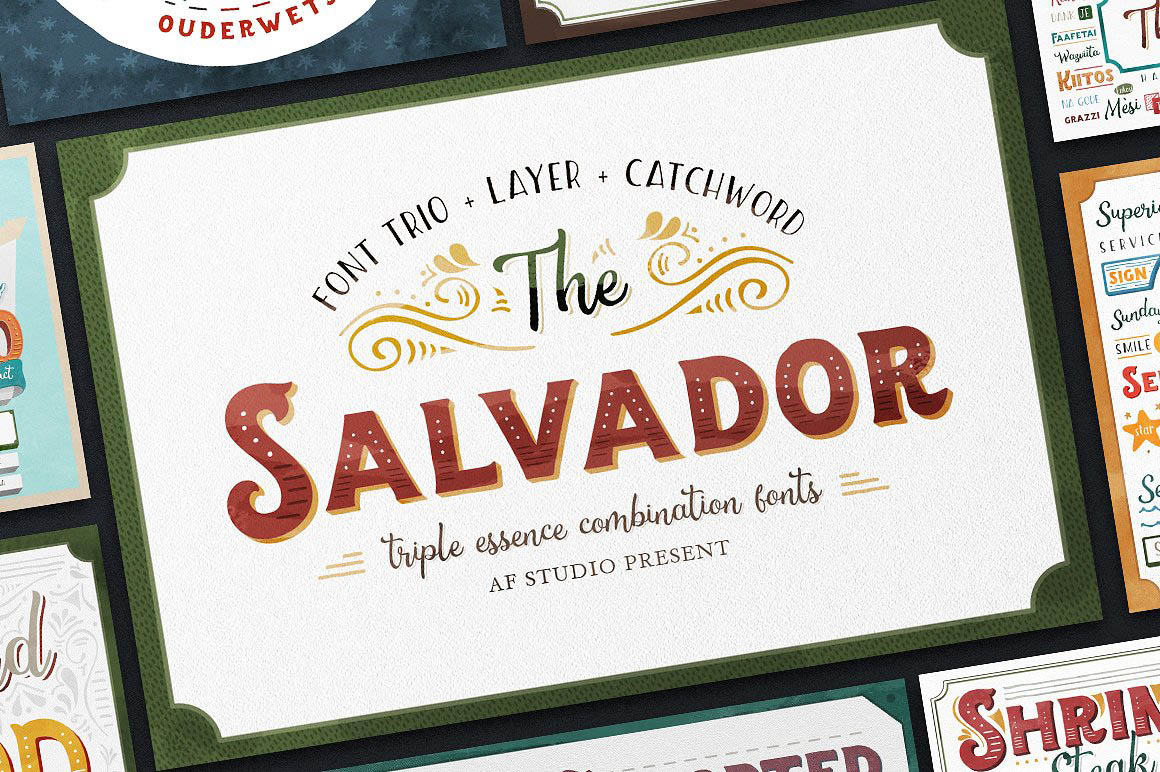 The Salvador is trio combinations of fonts. inspired from the Lettering Artist who made the unique combination handlettering type style and perfect color choosen.