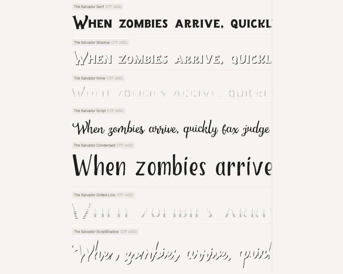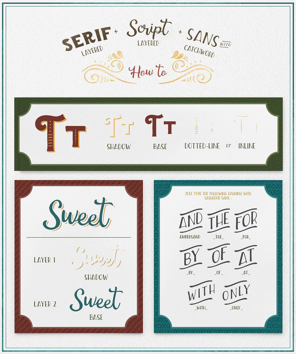 The Salvador Serif comes with 4 layers : Base, Shadow, and Inline or Dotted Inline. Inline and Dotted Inline are similar style, just choose one which is the best for you.