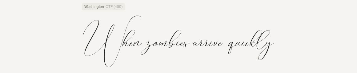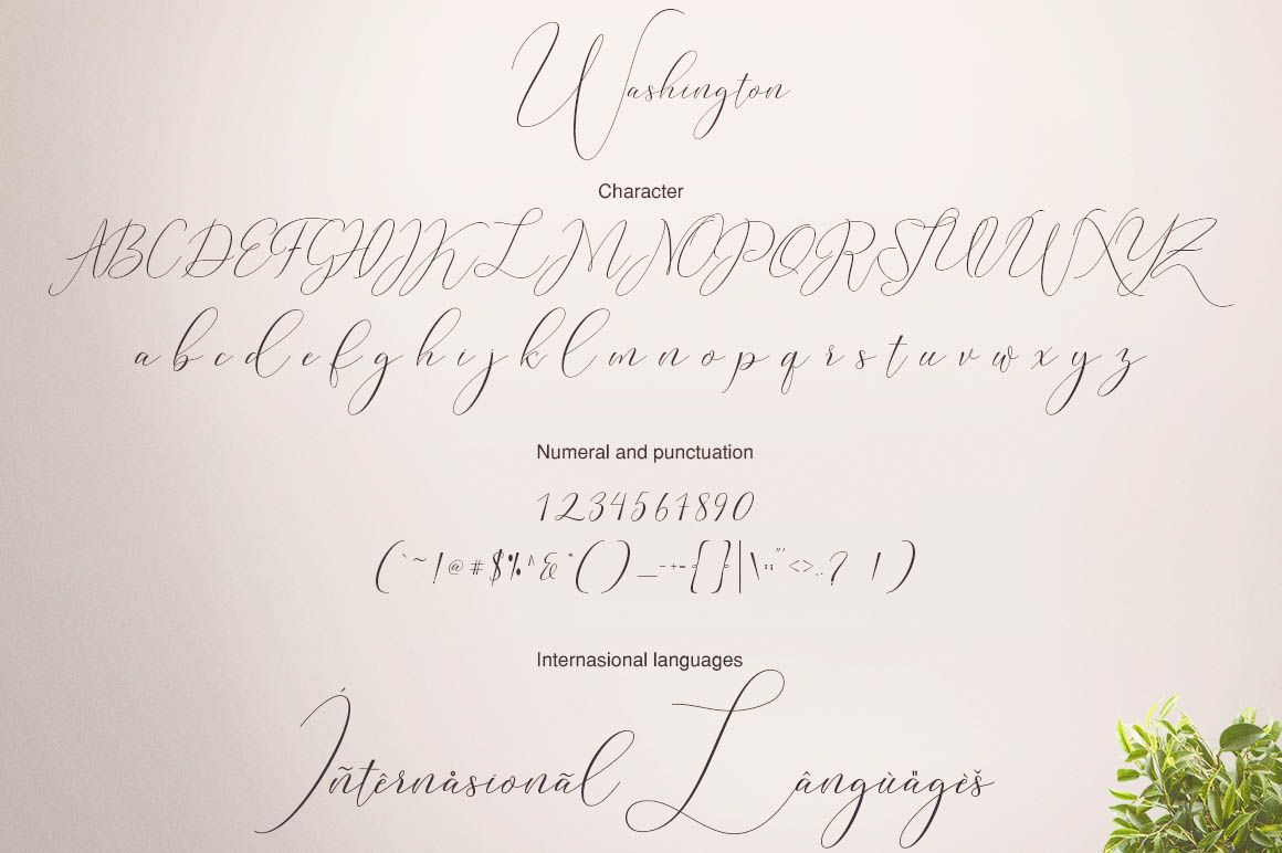 Washington Script. It’s an modern typeface. Washington Script, including swashes, ligatures,Alternate and International support for most Western Languages is included. Washington come with 408 glyphs. This one should make your designs instantly professional and jaw-dropping! Be a perfect professional in a minute and start creating modern designs like ads, sales, logos, branding, posters, social media text overlays today!
