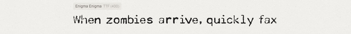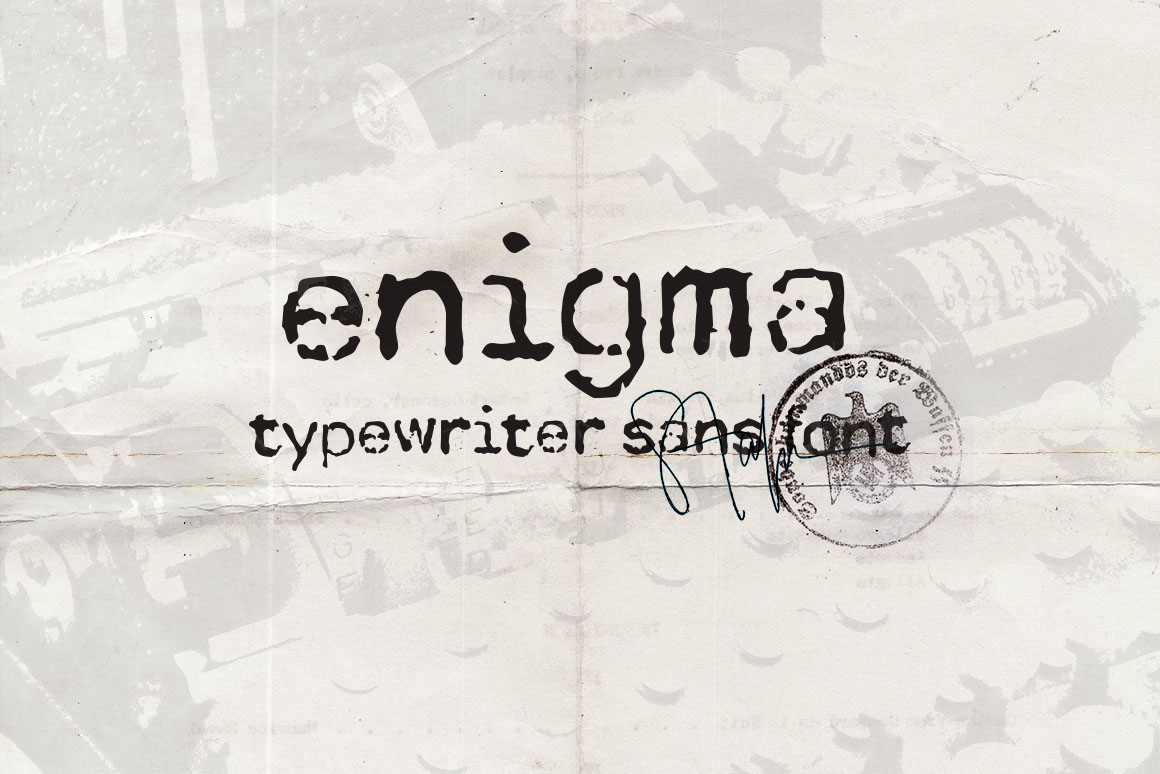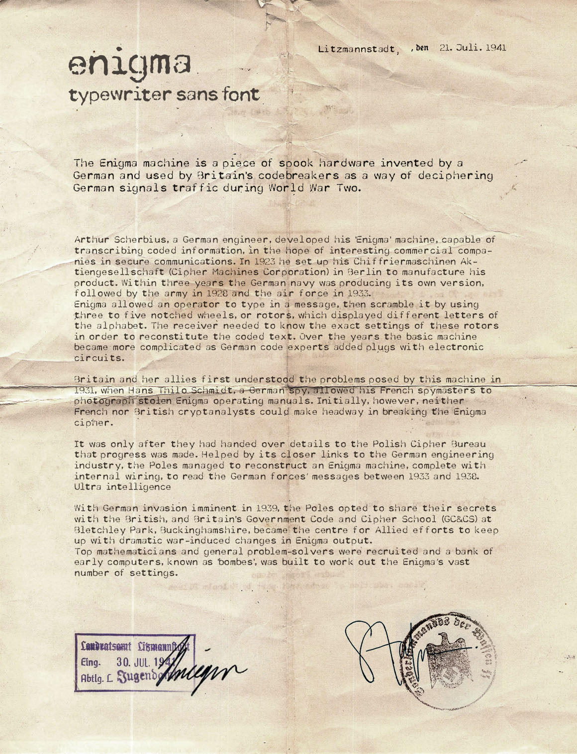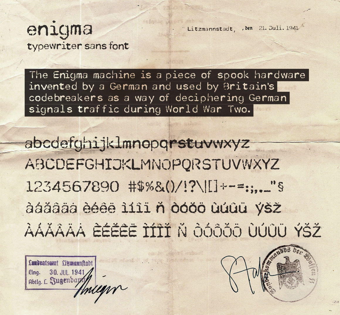 Enigma Typewriter is a font that helps you to recreate old documents and papers. I created this font inspired by Enigma German machine. This font include one ttf file. Multilingual glyphs supported.