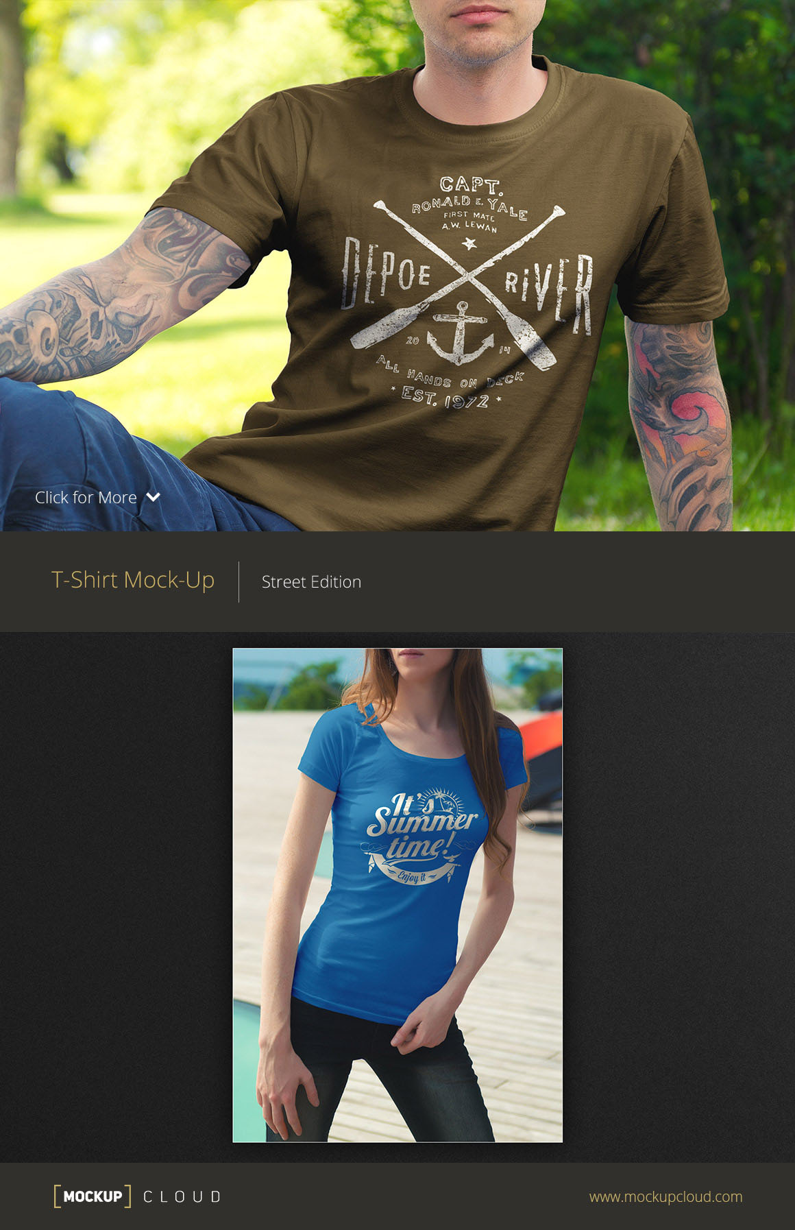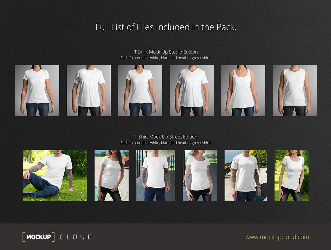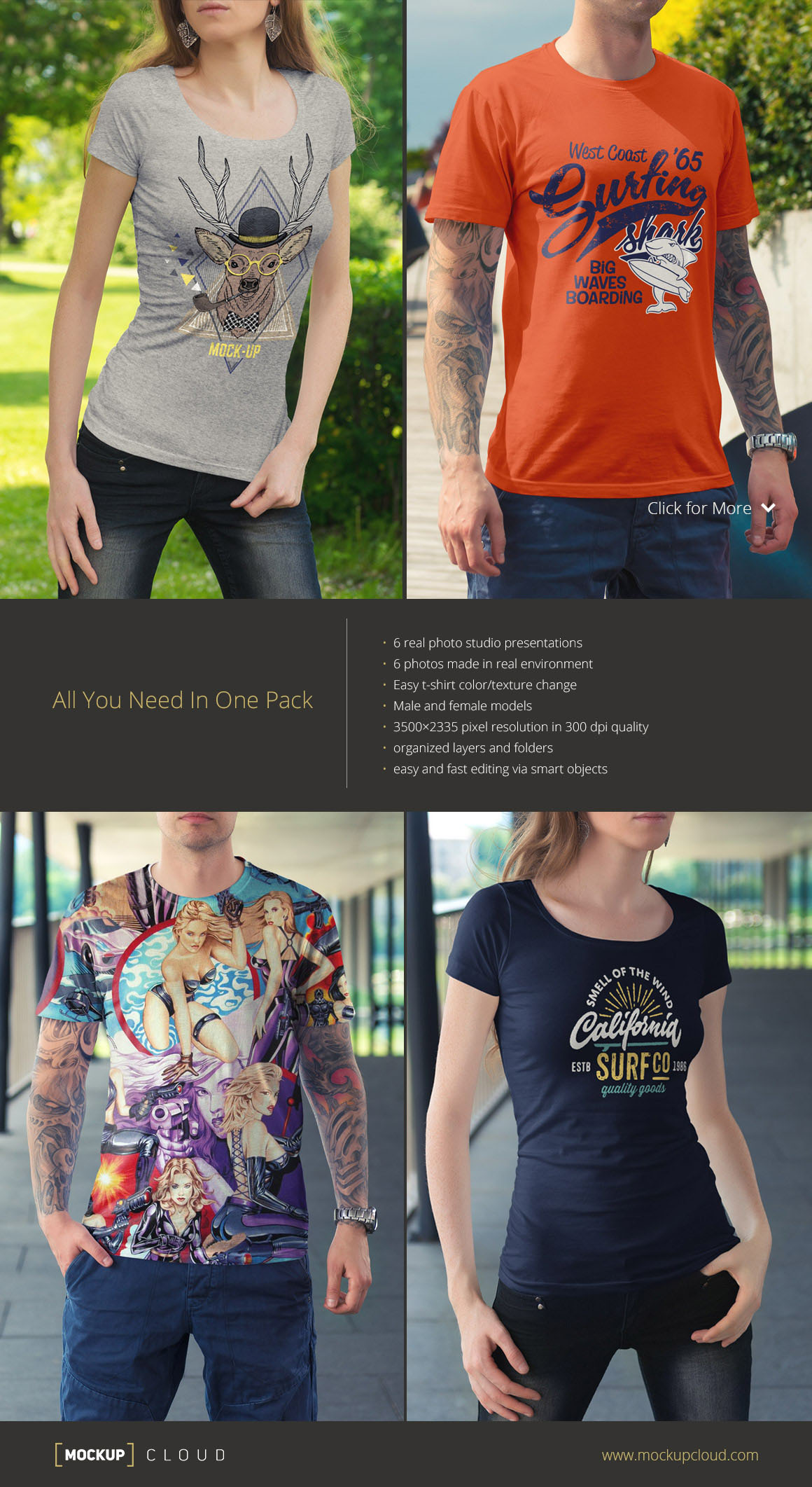 Premium quality, real photo t-shirt mock-up set. Male and female models, on the street’s and in the studio, different environments, t-shirt styles and endless color’s. Easy to place your designs using smart objects, double-click the Smart Layer, copy & paste your artwork, save and you’re done! Presentation never looked so perfect.