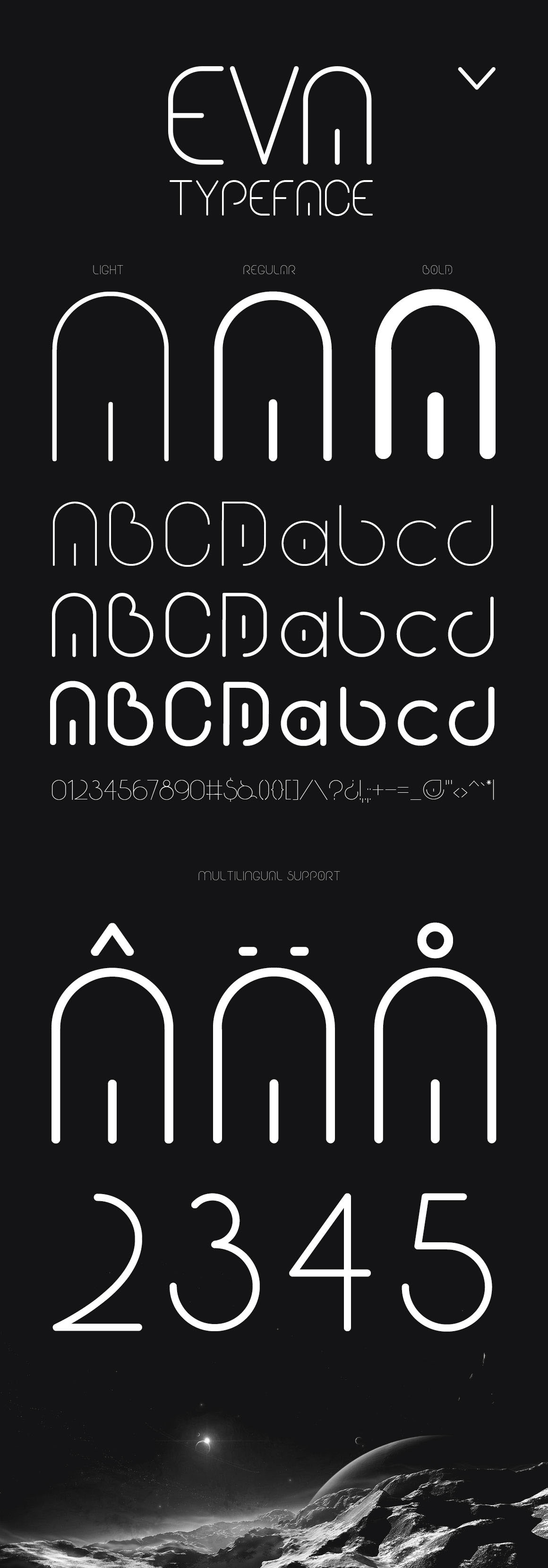 Eva is a modern, stylish and futuristic font (all in one). This font is best for titling. Contain 3 thicknesses: light, regular and bold and have multilingual support.