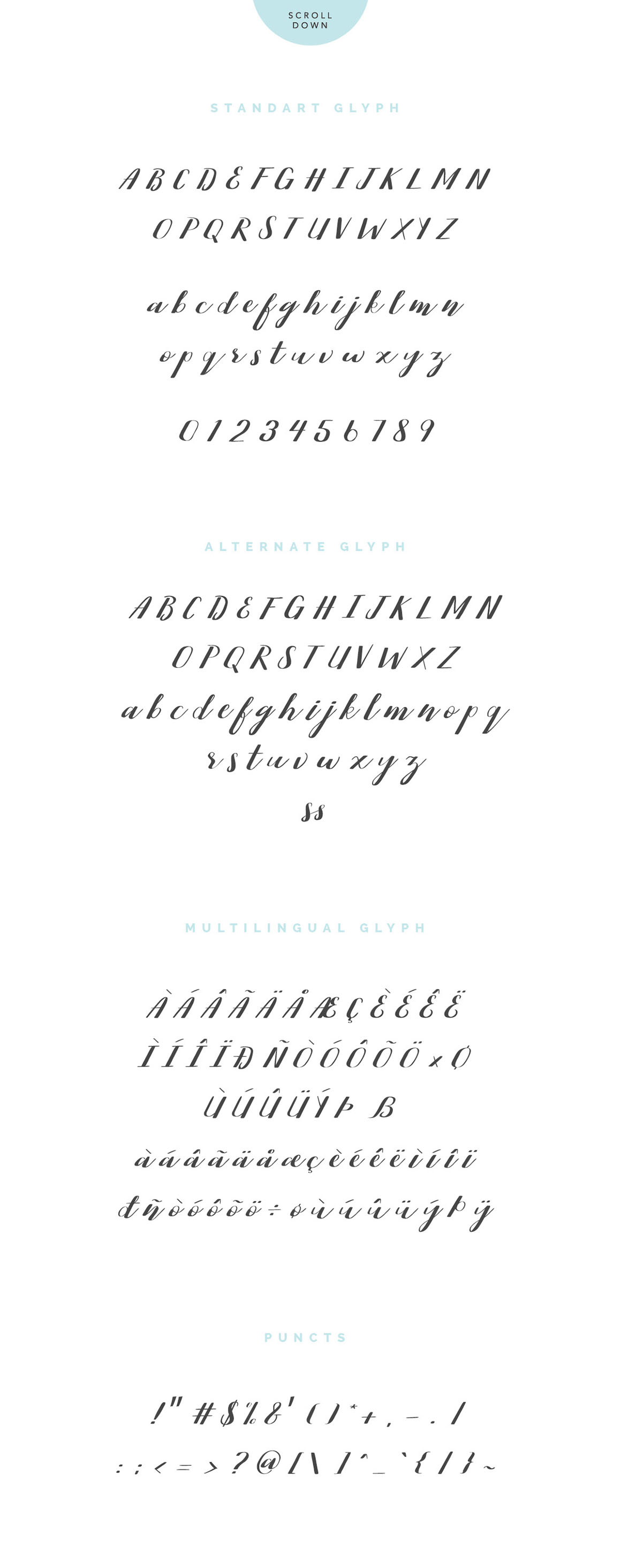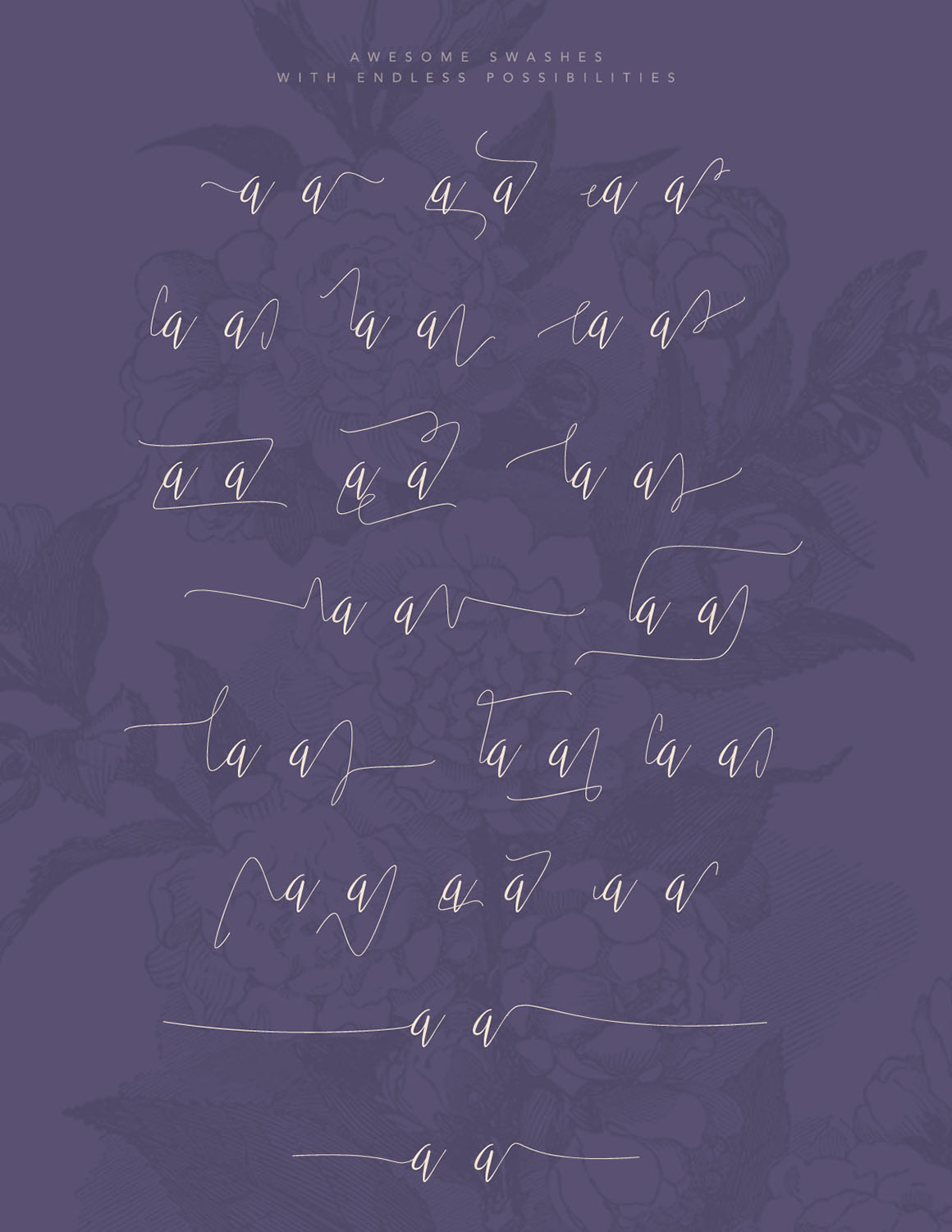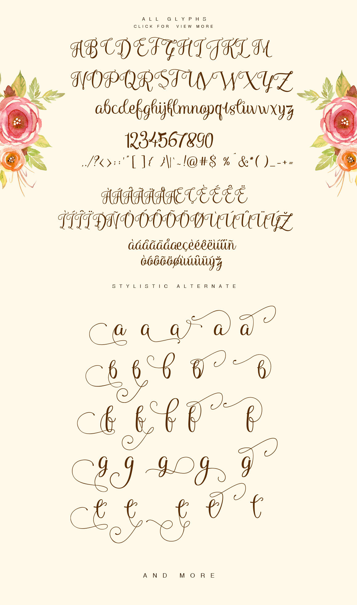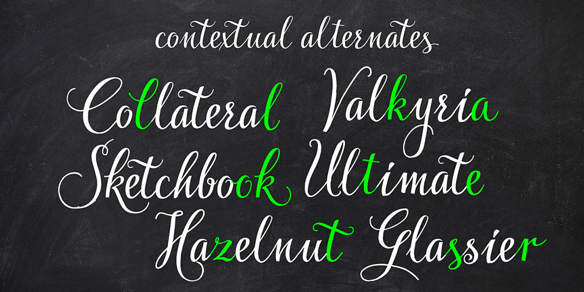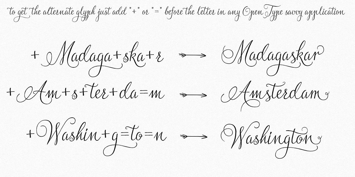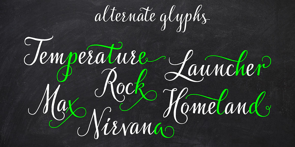 Charlize is a handwritten, fully connected script with ligatures to help with flow and readability. It can be used for invitations, greeting cards, posters, advertising, weddings, books, menus etc. Charlize pro is the most complete style, it contains over 740 glyphs. Every lowercase letter has six variations (uppercase letter has two). To get the alternate glyph just add “+“,”*“,”–“,“__”,”++“ or ”==” before the letter in any OpenType savvy application or manually chosen the characters from Glyph Palette.