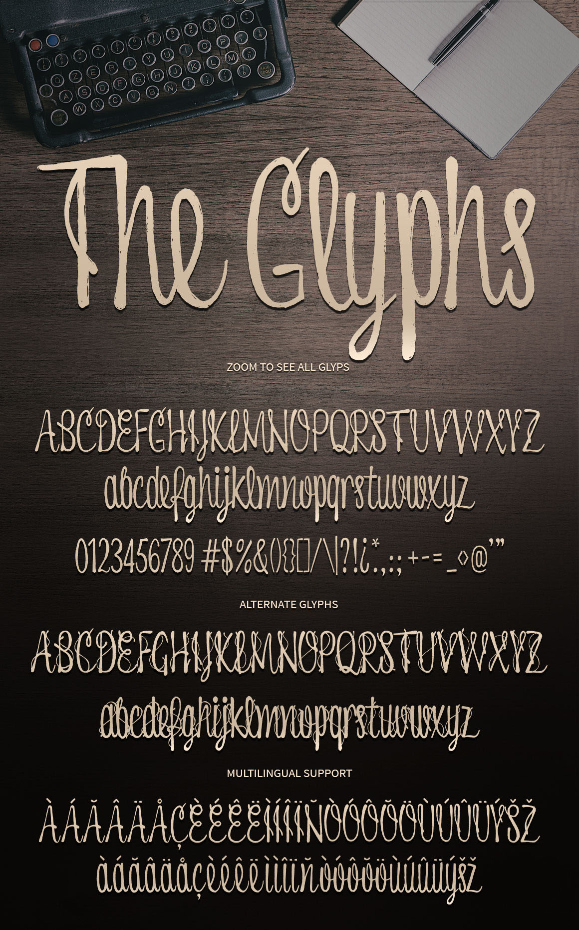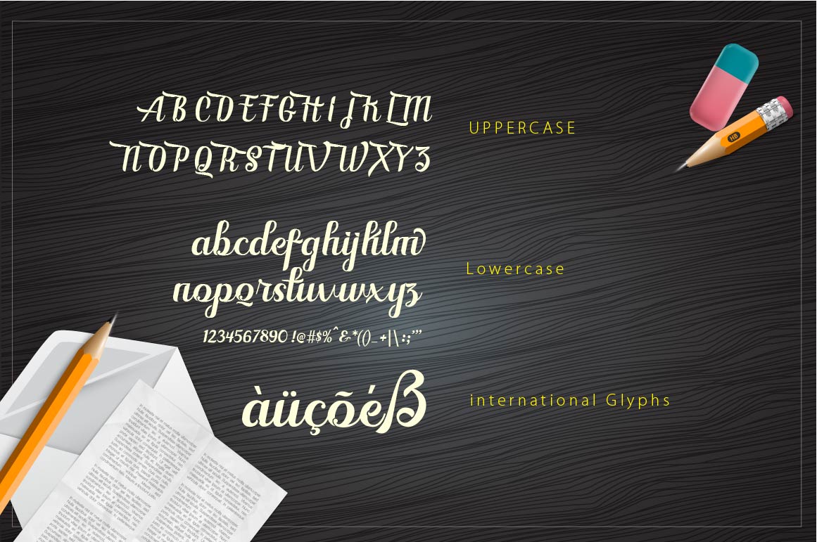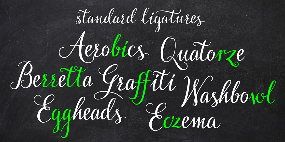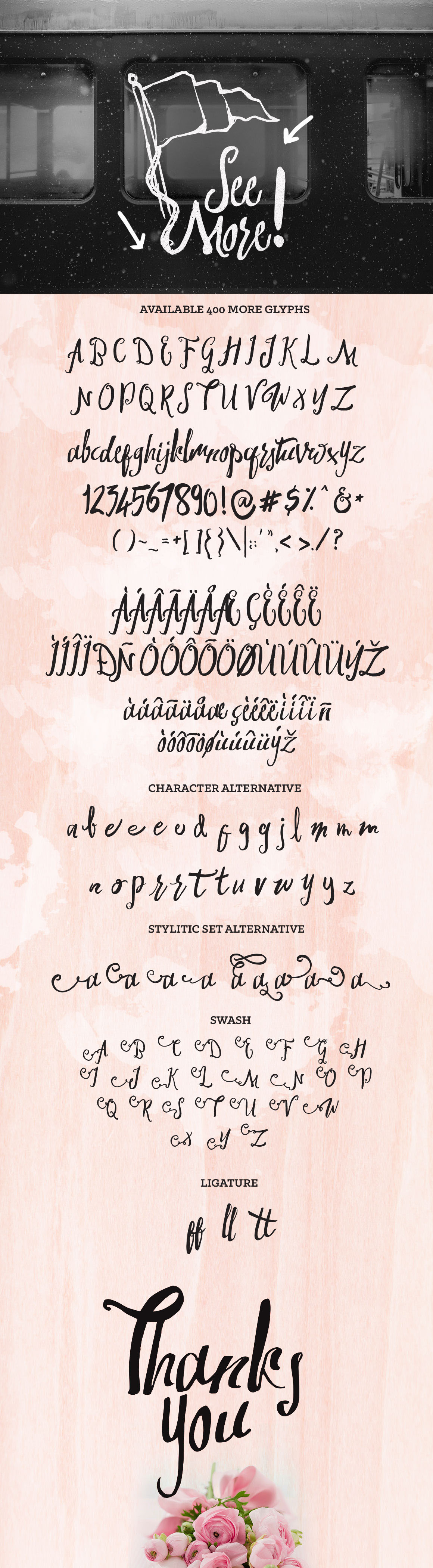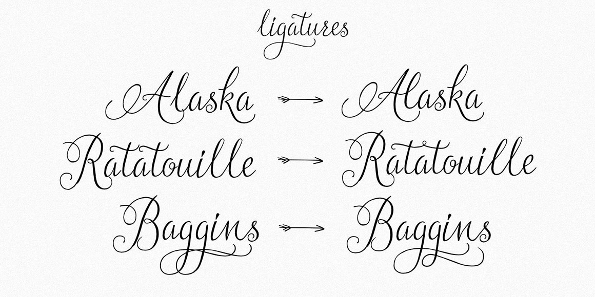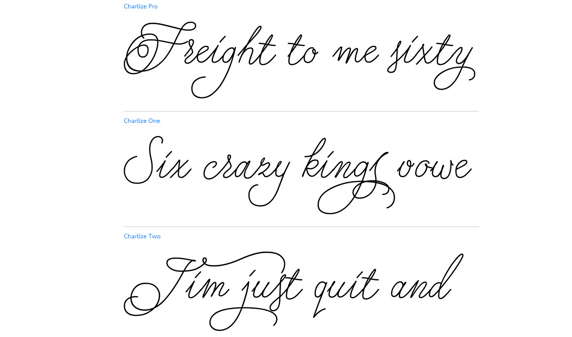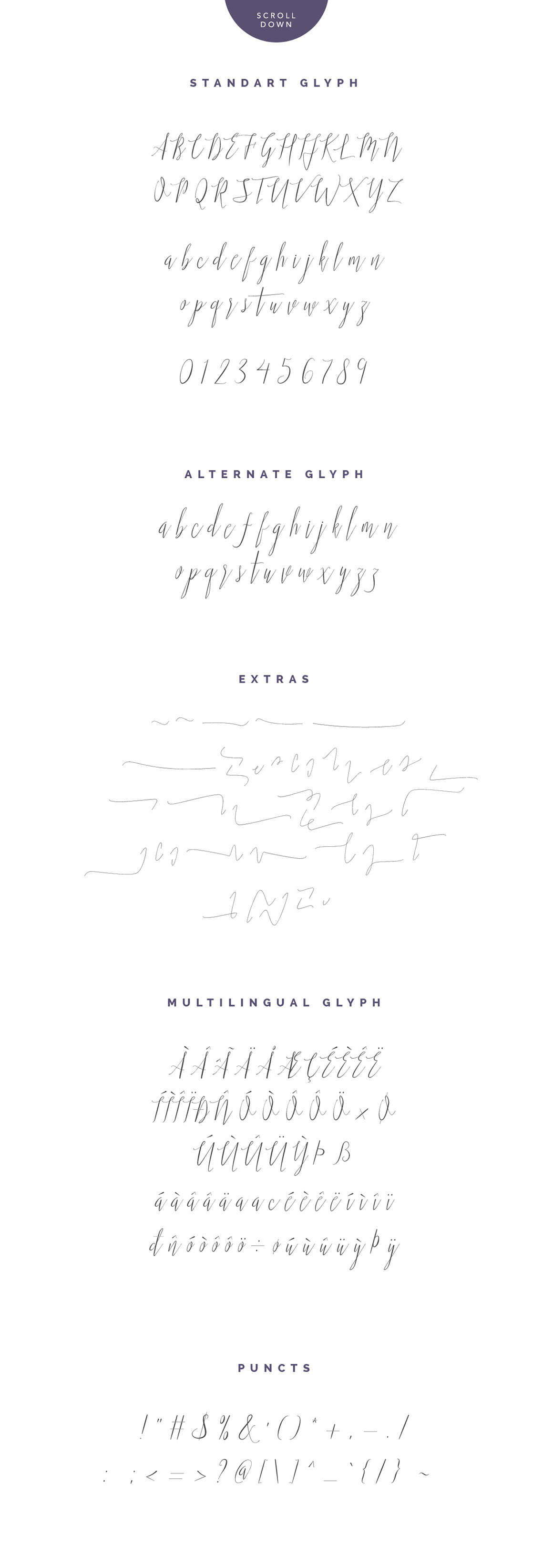 Charlize is a handwritten, fully connected script with ligatures to help with flow and readability. It can be used for invitations, greeting cards, posters, advertising, weddings, books, menus etc. Charlize pro is the most complete style, it contains over 740 glyphs. Every lowercase letter has six variations (uppercase letter has two). To get the alternate glyph just add “+“,”*“,”–“,“__”,”++“ or ”==” before the letter in any OpenType savvy application or manually chosen the characters from Glyph Palette.