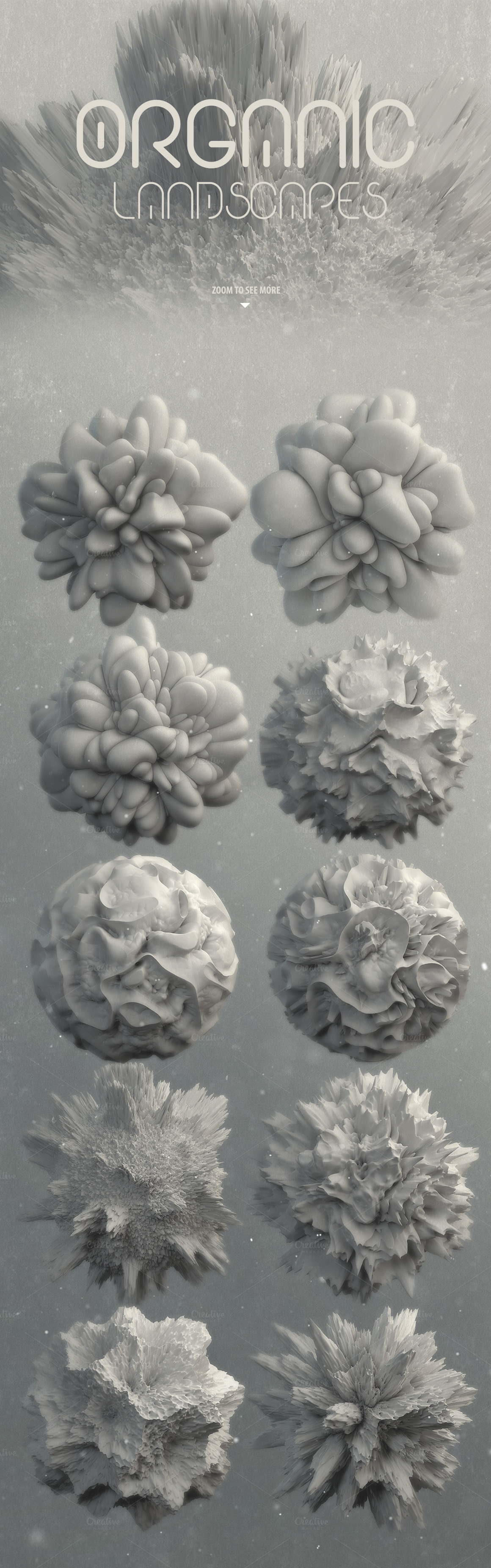 Introducing Organic Landscapes. 10 surreal 3D shapes perfect for your backgrounds. Check the preview #3 to see them all. Product specifications: 10 PSD files, 5000×5000 px | 300 DPI, You can use it both for print and web.