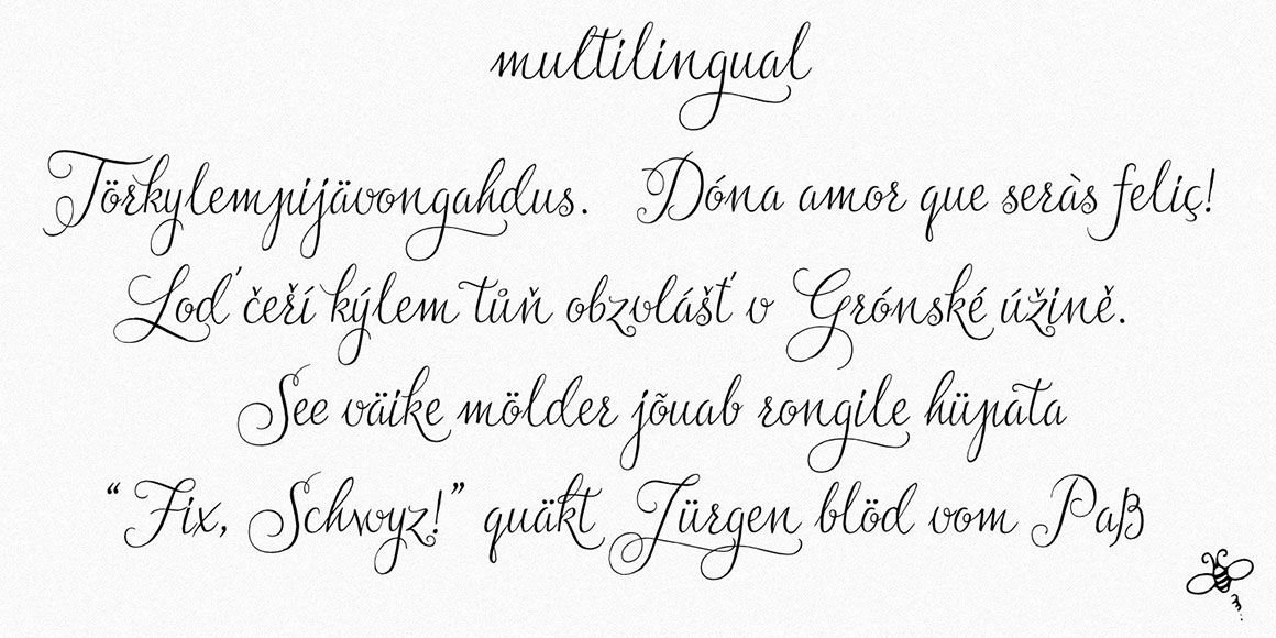 Jasminum is a handwritten, fully connected script with ligatures to help with flow and readability. It can be used for invitations, greeting cards, posters, advertising, weddings, books, menus etc. Jasminum contains over 700 glyphs. Each letter has three variations. To get the alternate glyph just add “+“ or ”=” before the letter in any OpenType savvy application or manually select the characters from Glyph Palette. Language support includes Western, Central and Eastern European character sets, as well as Baltic and Turkish languages.