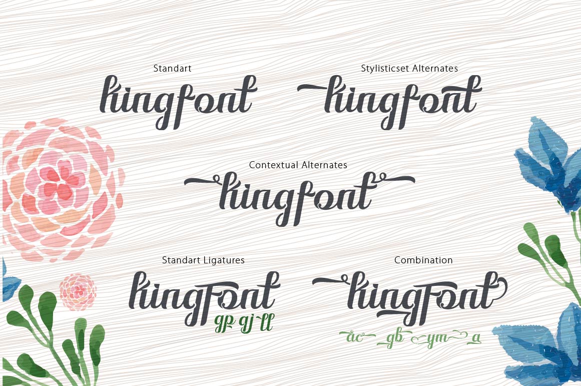 Kingfont script is another lovely modern calligraphy typefaces, Simple, classic and elegant touch. Can be used for various purposes.such as headings, logos, wedding invitation, t-shirt, letterhead, signage, lable, news, posters, badges etc.
