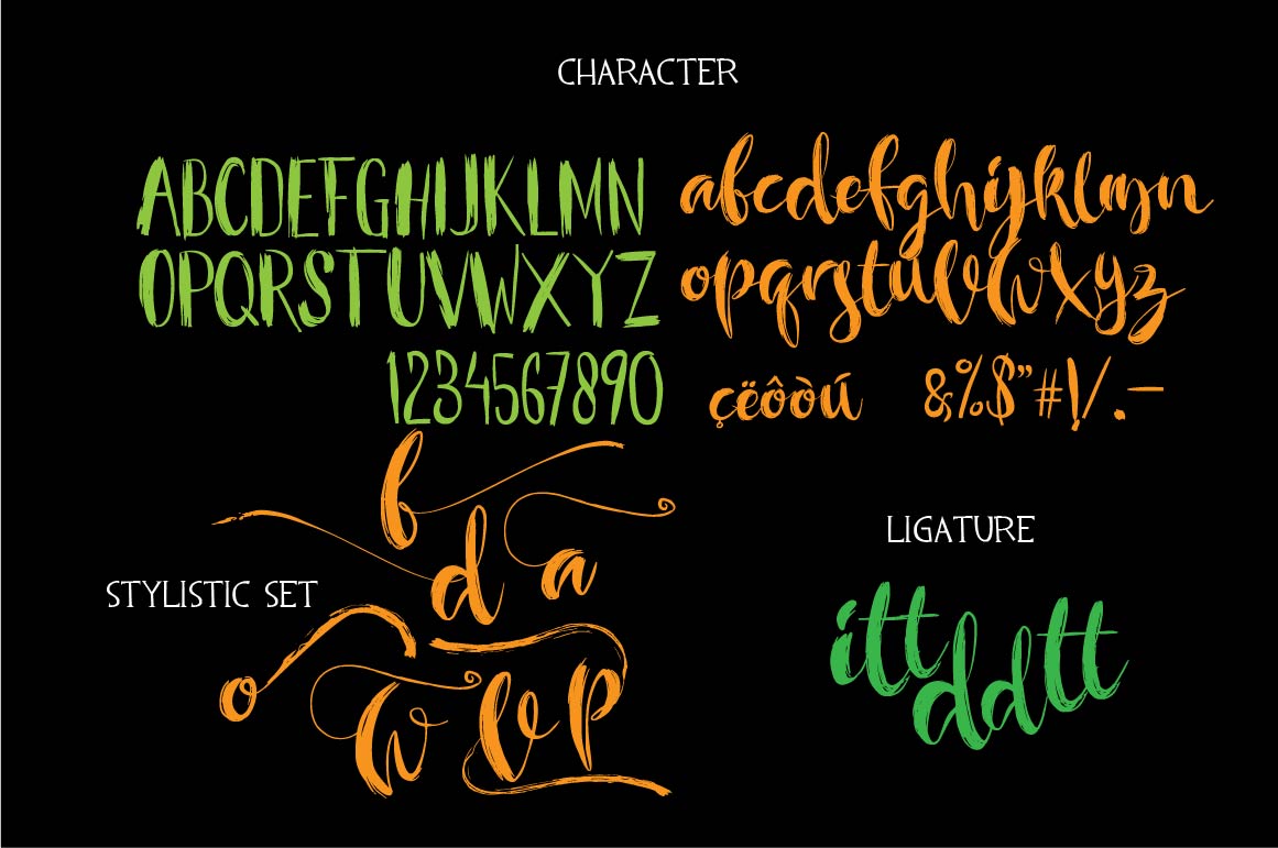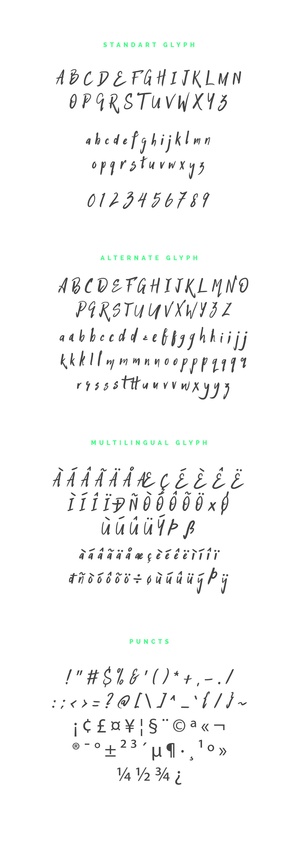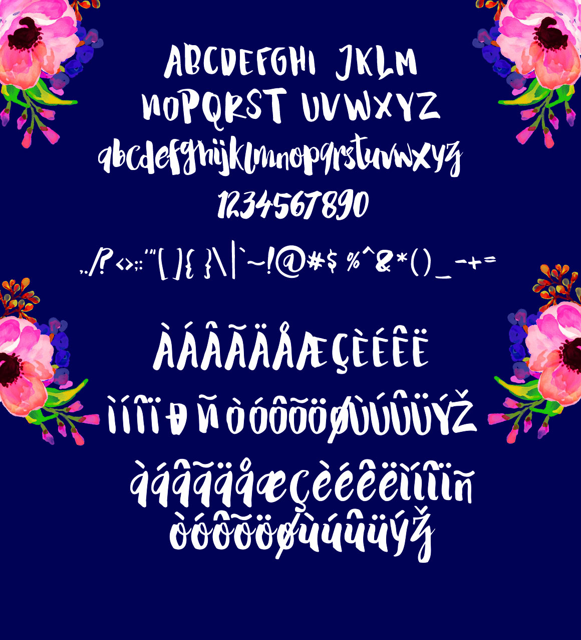 Creative and unperfect brush font with natural look. Features: Ligatures, International glyphs, Basic Latin A-Z and a-z, Numbers.