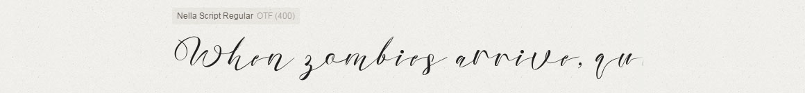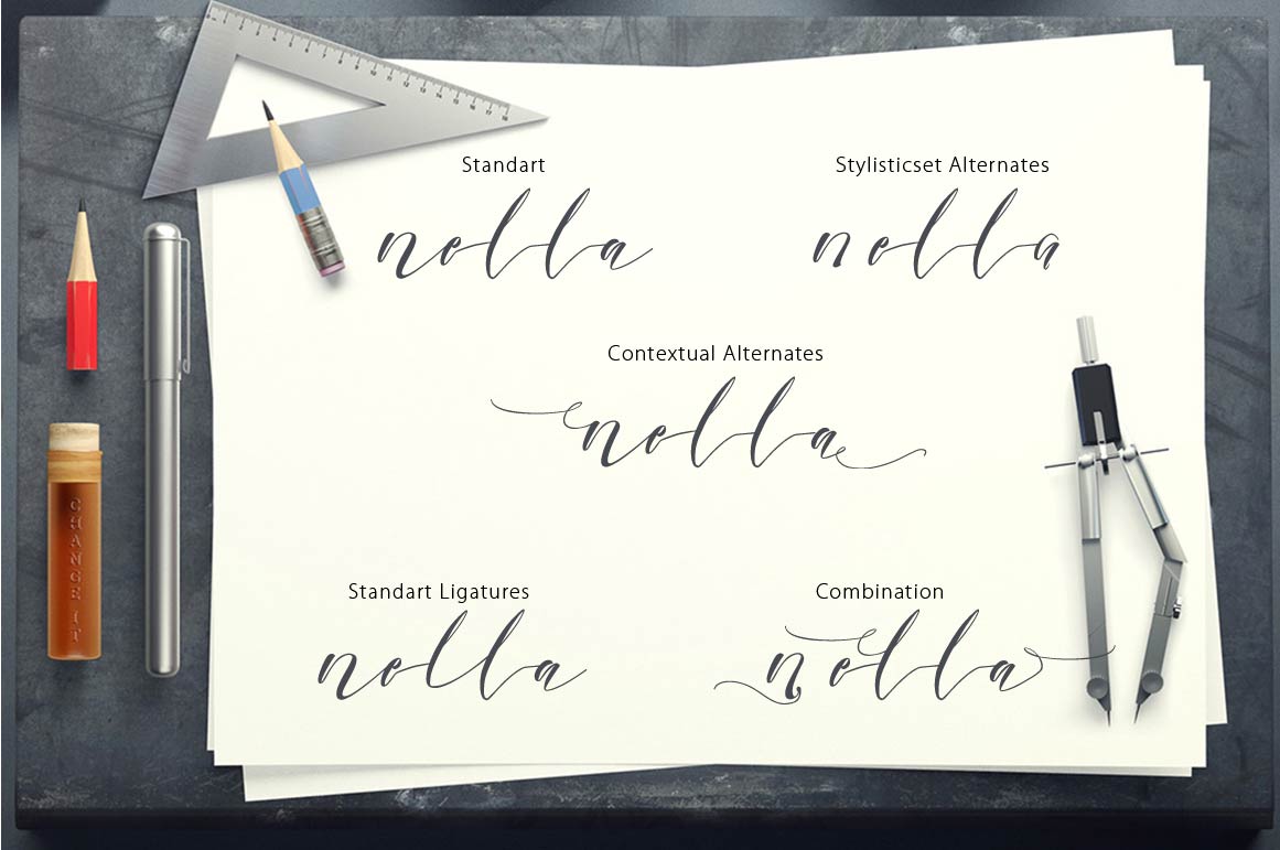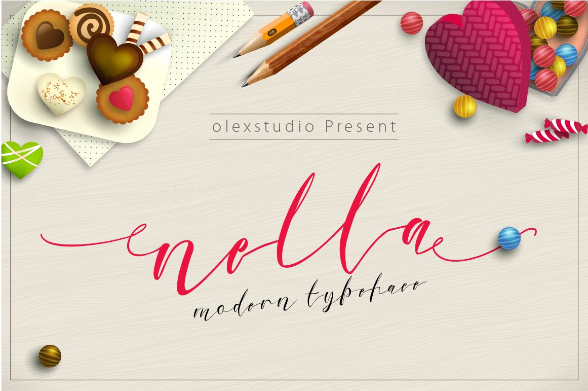 Nella script is another lovely modern calligraphy typefaces and elegant touch. Can be used for various purposes.such as headings, signature, logos, wedding invitation, t-shirt, letterhead, signage, lable, news, posters, badges etc. Nella Script come complete with 418 glyphs.