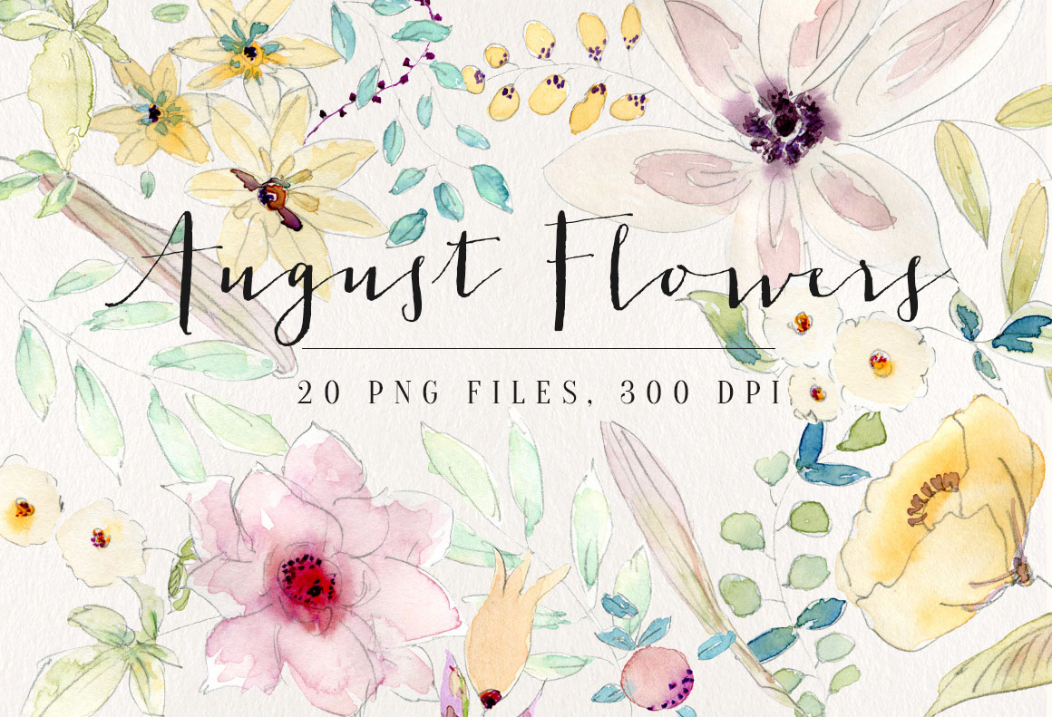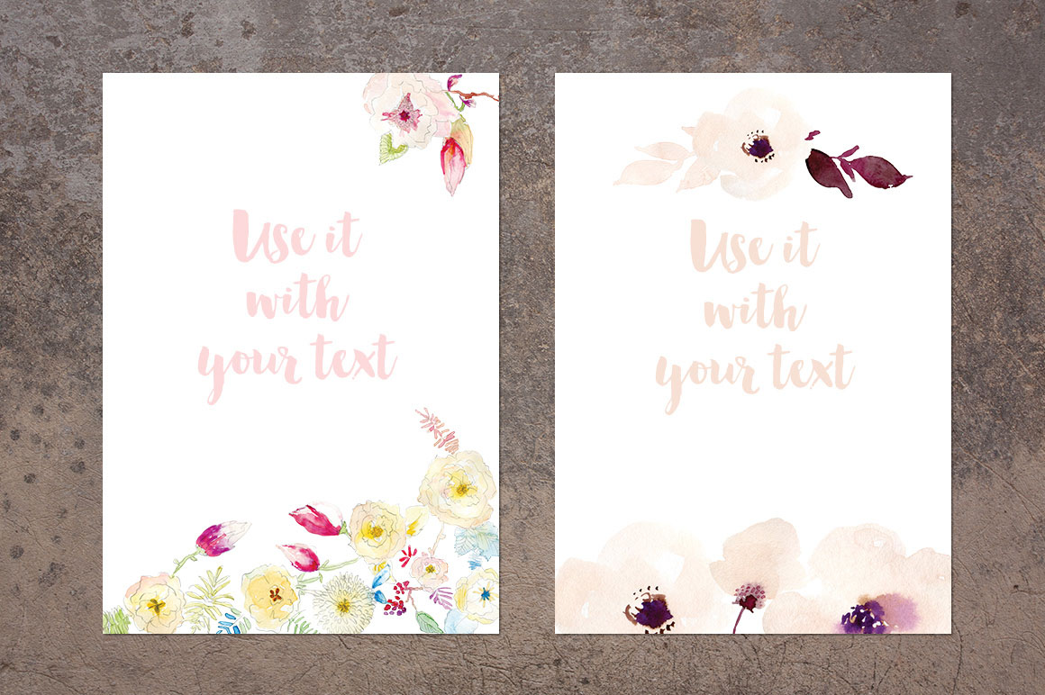 Ideal watercolour elements for invitations, wedding invitations, handmade craft items, scrap booking, printed paper items and more. 44 PNG (included 7 png compositions) hand drawn watercolour graphic elements.Each floral element on an individual png with transparent background. Size approximately 3 x 3 inches to 11 x 11 inches.