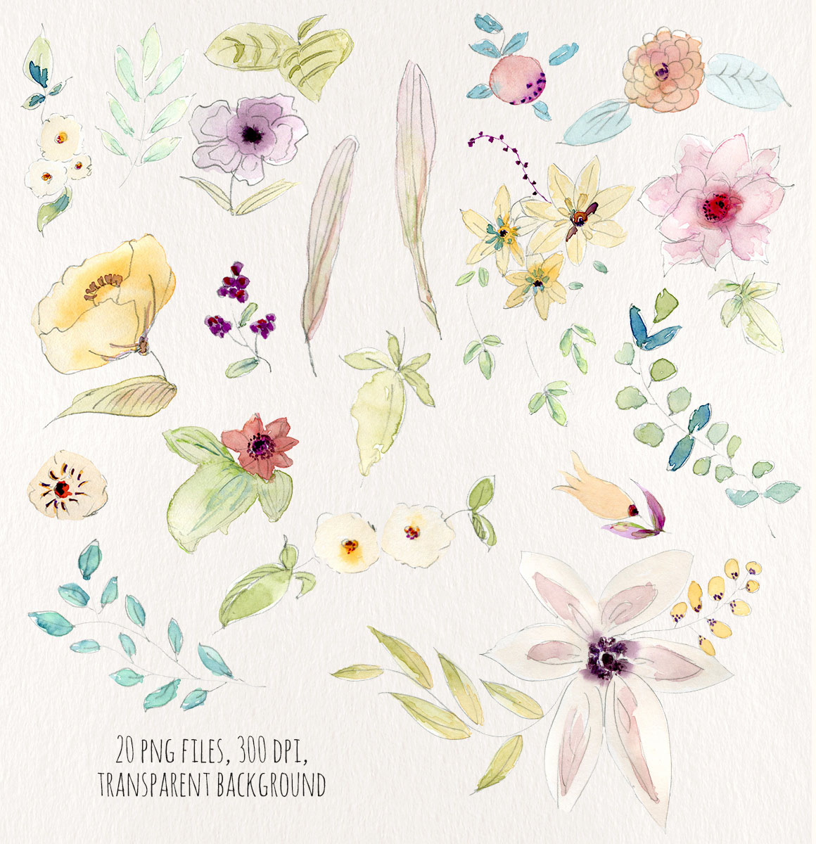 Ideal watercolour elements for invitations, wedding invitations, handmade craft items, scrap booking, printed paper items and more. 20 PNG hand drawn watercolour graphic elements.Each floral element on an individual png with transparent background. Size approximately 2 x 2 inches to 10 x 12 inches.