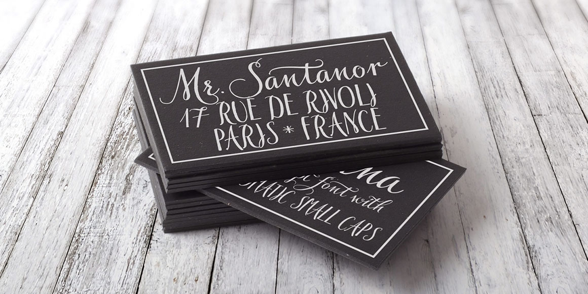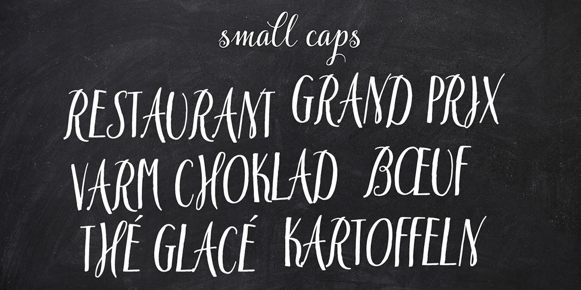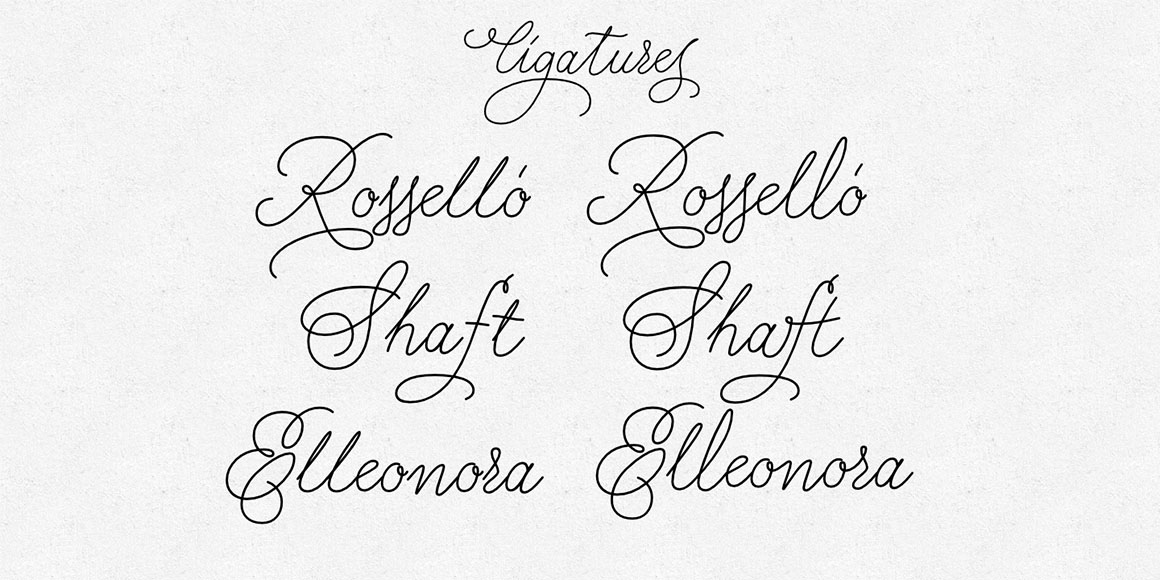 Rosselina is a handwritten, fully connected script with ligatures and contextual alternates to help with flow and readability. It can be used for invitations, greeting cards, posters, advertising, weddings, books, menus etc. Every lowercase letter has at least two variations. To get the alternate glyph just add “+” before the letter in any OpenType savvy application or manually choose the character from Glyph Palette. When you type uppercase letters they will change to Small Caps. Language support includes Western, Central and Eastern European character sets, as well as Baltic and Turkish languages.
