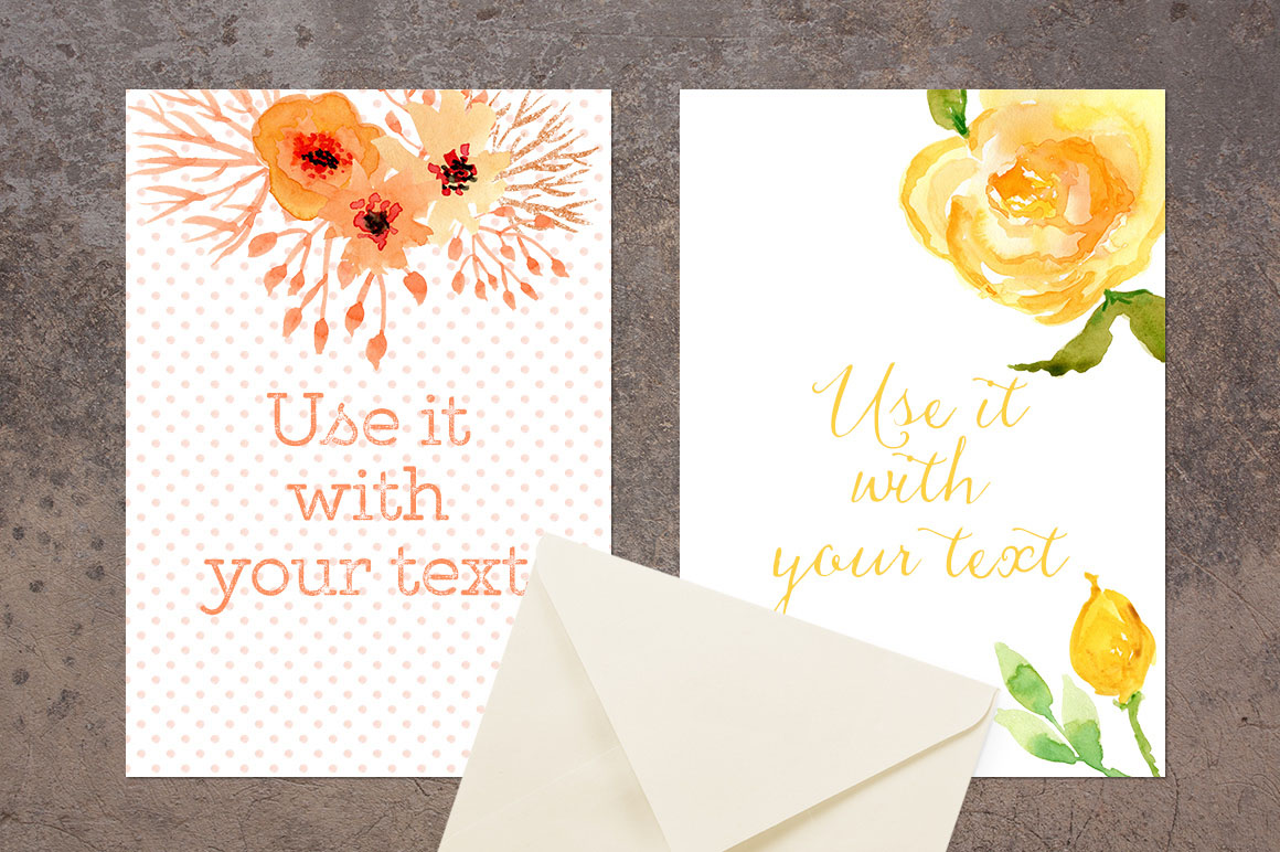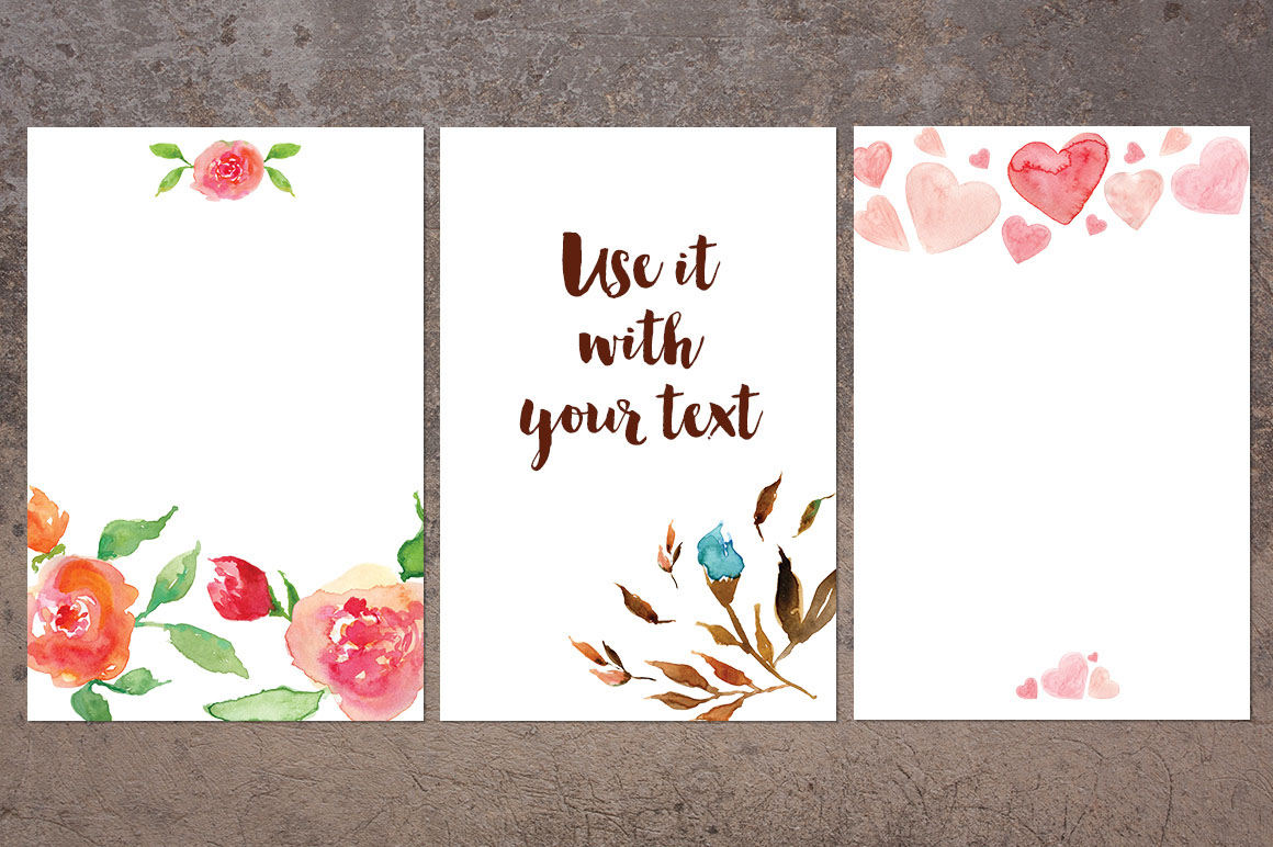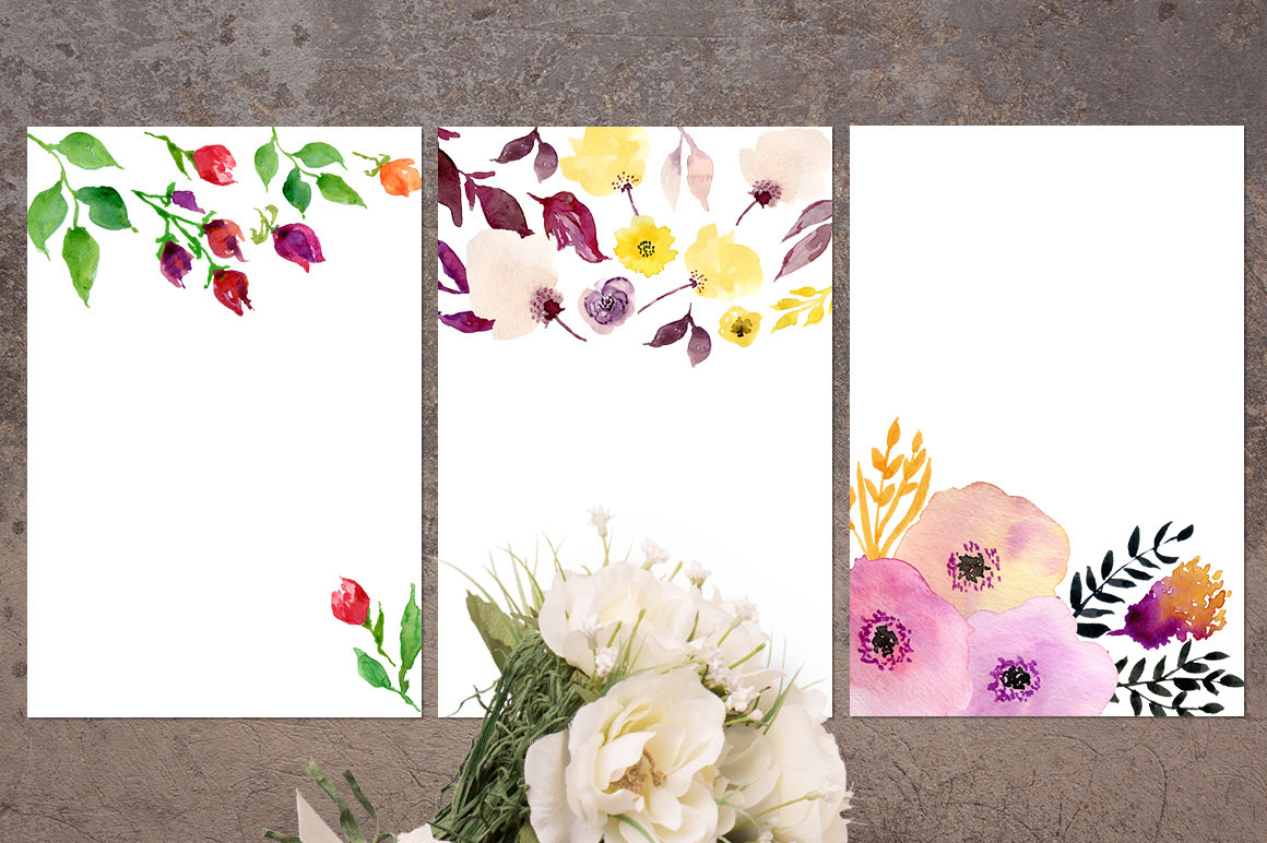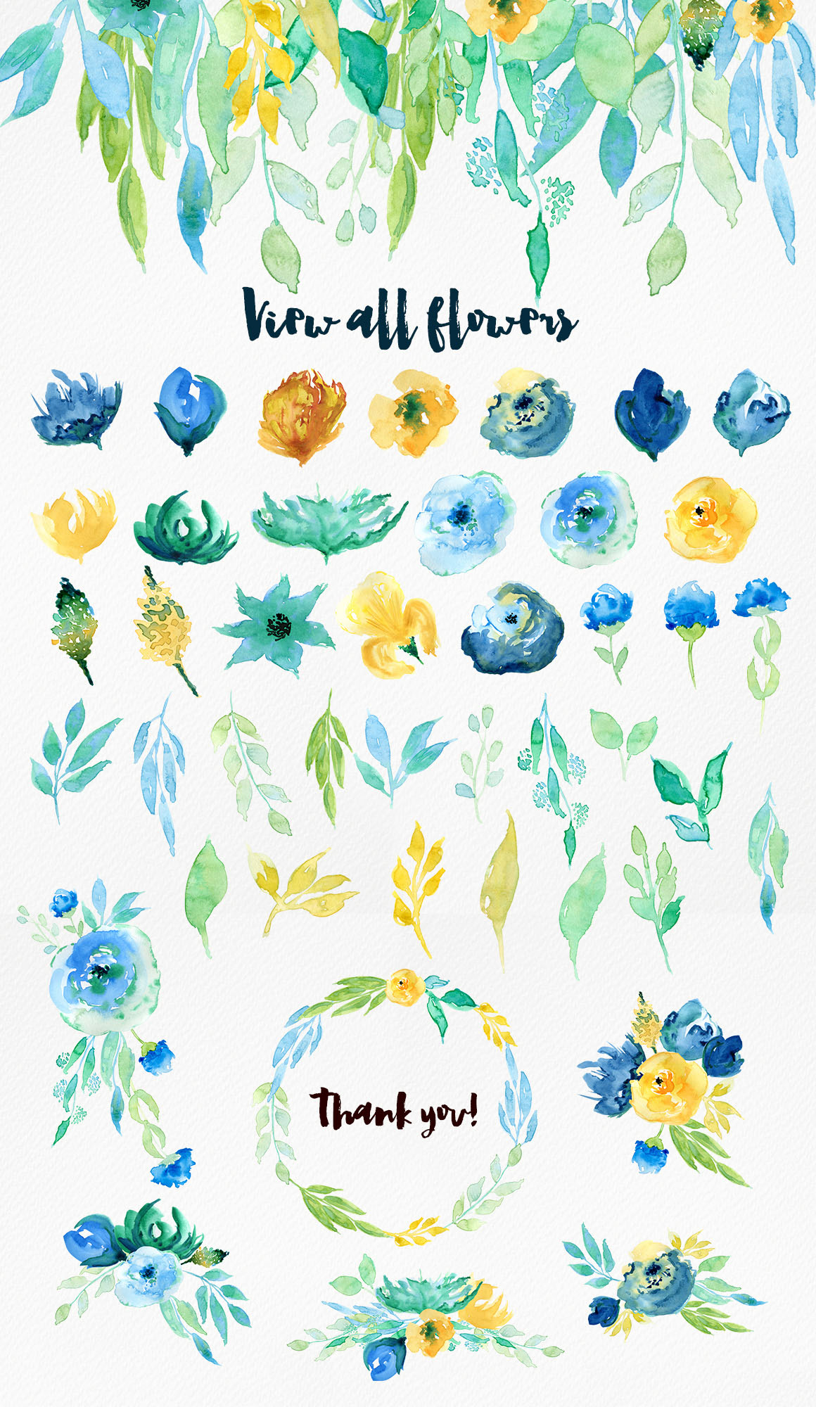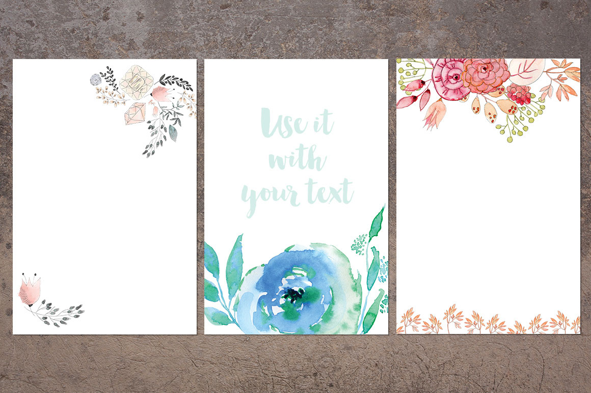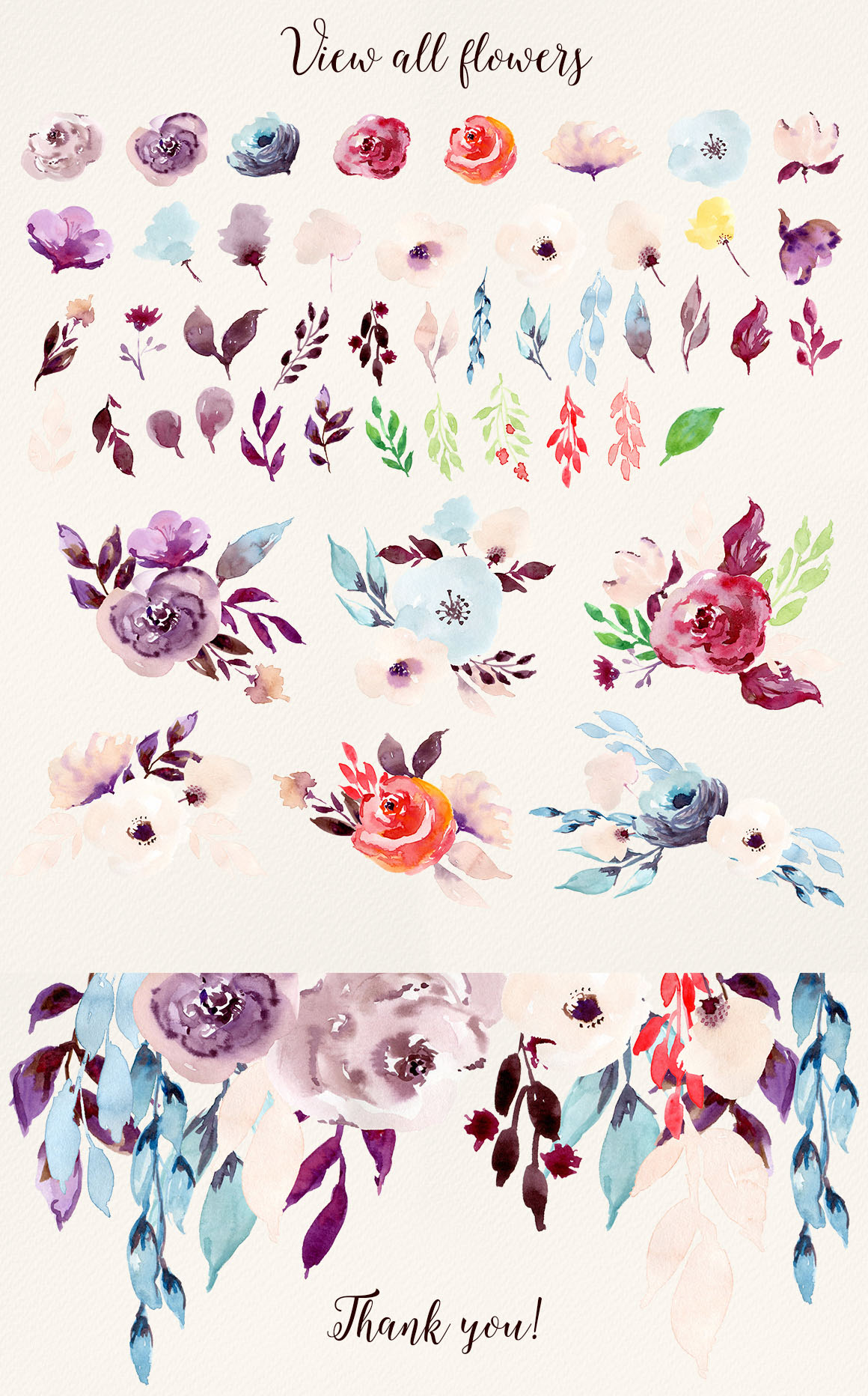 Ideal watercolour elements for invitations, wedding invitations, handmade craft items, scrap booking, printed paper items and more. 49 PNG (included 7 png compositions) hand drawn watercolour graphic elements.Each floral element on an individual png with transparent background. Size approximately 4 x 6 inches to 10 x 8 inches.