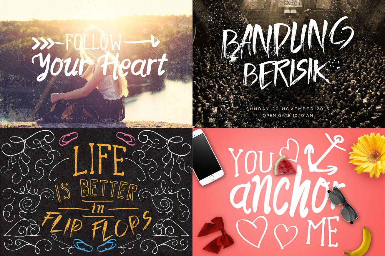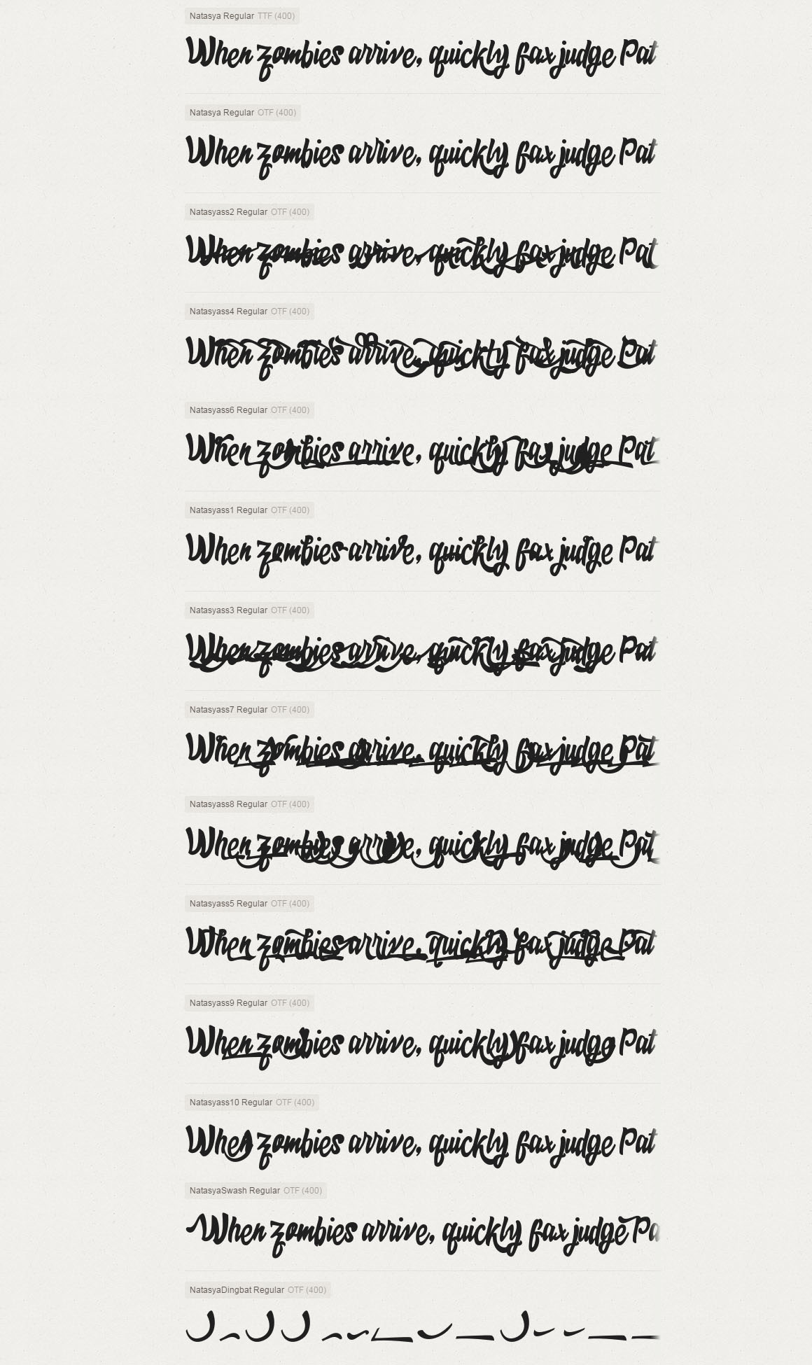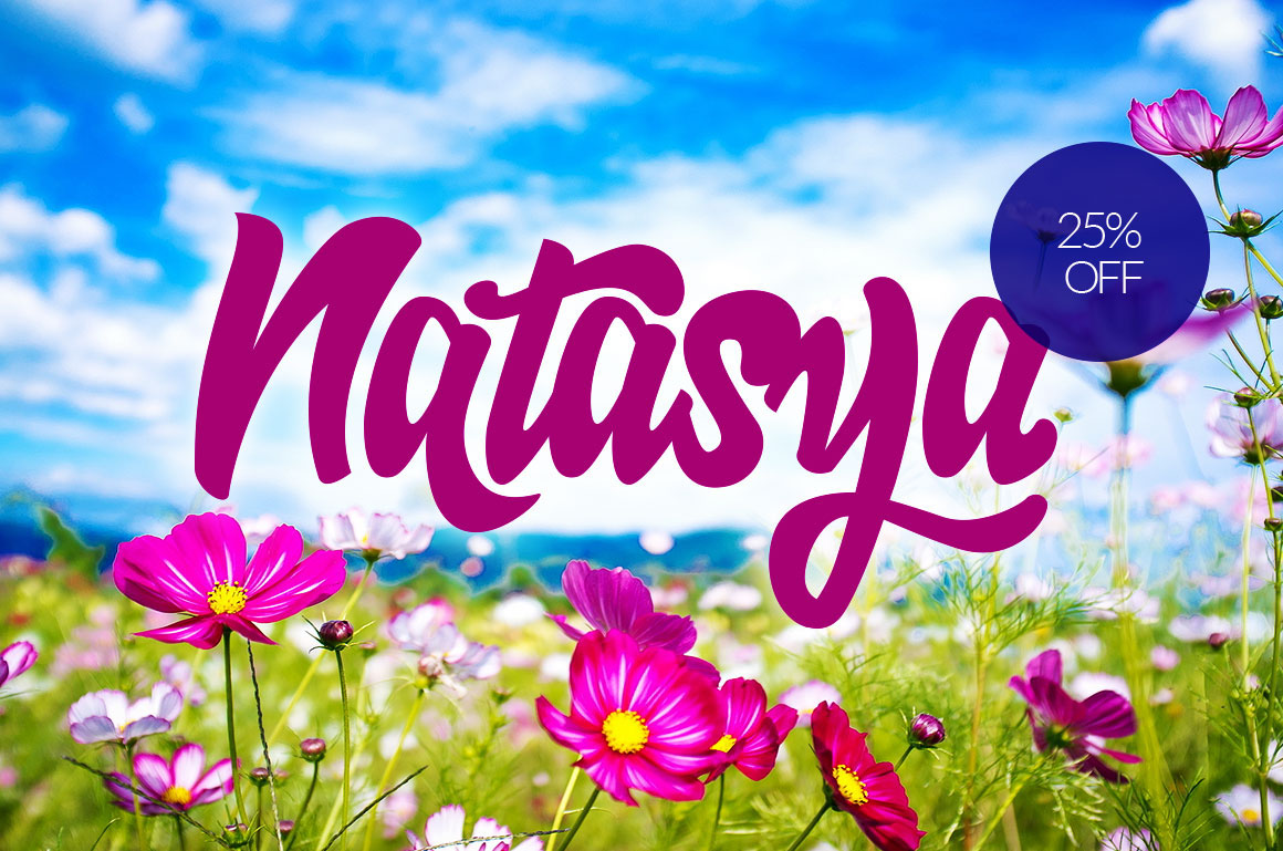Natasya is bold, playful, modern, and multi-purpose typeface that combines brush lettering with natural handwriting. It is suitable for logo, packaging, headline, poster, t-shirt, etc. With 401 glyphs and 191 alternatives characters, you can mix and match Natasya to fit your design. The alternative characters divided into several OpenType features such as Ligature, Contextual alternates, stylistic alternates, stylistic sets, and swash. It can be accessed by using OpenType savvy program such as Adobe Illustrator and Adobe InDesign.