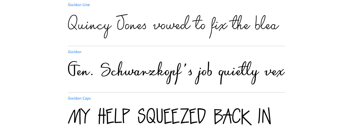 Gwidon is a family of three quite distinct fonts that perform together very well. Gwidon Regular and Gwidon Line are elegant, fully connected scripts with ligatures to help with flow and readability. Gwidon Caps is all capital letter font which include 2 version for each letter, easily reachable through keyboard upper and lower keys. Gwidon can be used for invitations, greeting cards, posters, advertising, weddings, books, menus etc. Language support includes Western, Central and Eastern European character sets, as well as Baltic and Turkish languages.