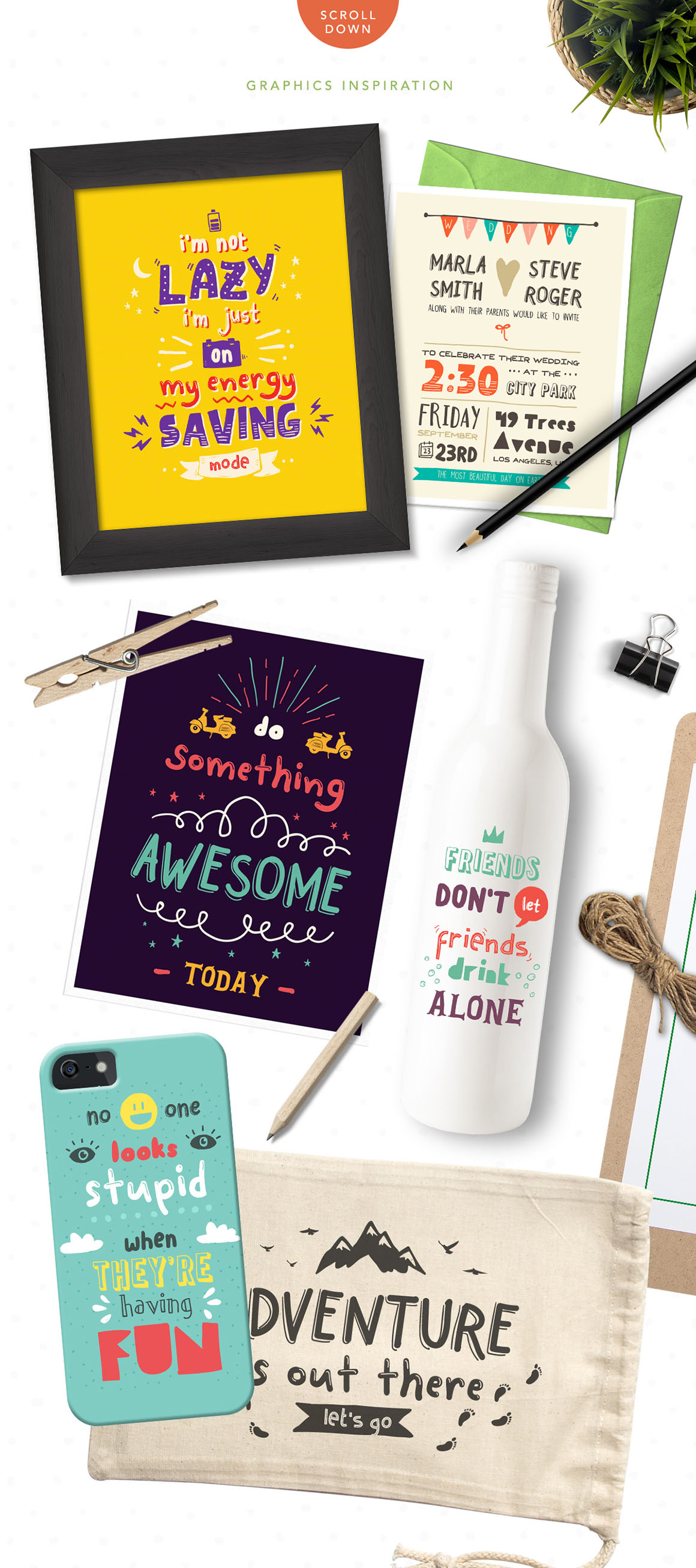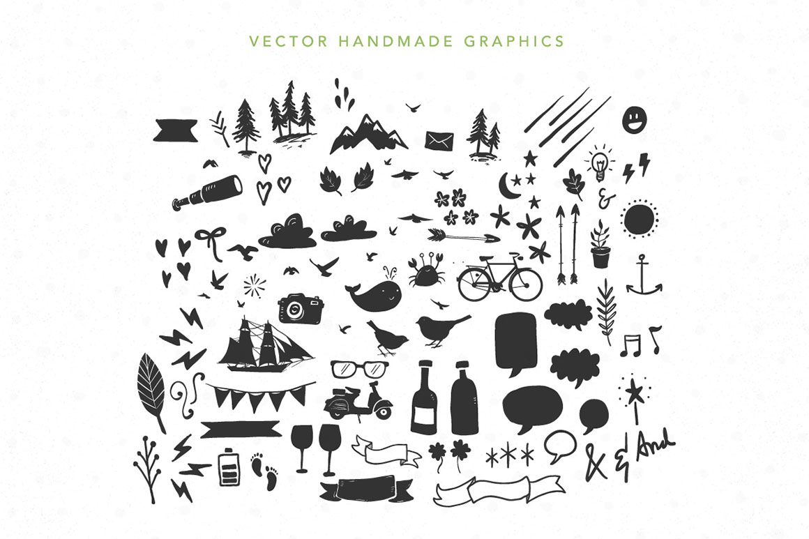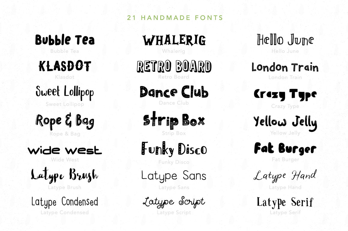 This pack contain 22 Handmade Fonts, 15 Patterns, 50+ Vector Graphics and 6 Beautiful Quotes Design. Every single letters created with hard work and lot of time consumed to make beautiful font results. This pack can be used for quotes, poster, wedding invitation, branding, logo, fashion, apparel, letter, invitation, stationery, etc. With beautiful patterns inside this products will improve your design looks more awesome. WHAT YOU GET: 22 Handmade Fonts + Latype Catchwords Font (.ttf & .otf), 15 Pattern (.ai & .eps), 50+ Vector Graphics (.ai & .eps), 6 Typography Design (.ai & .eps).