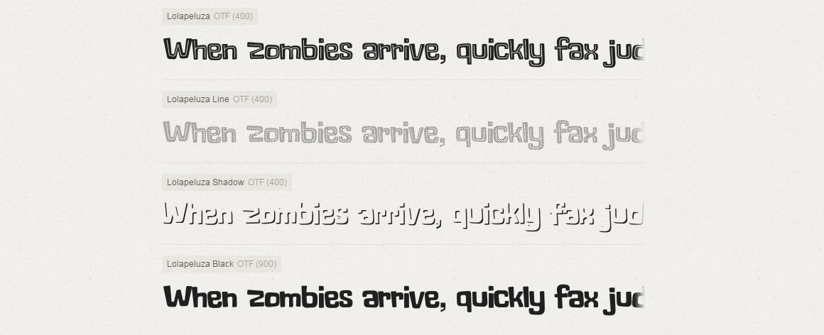 Name: Lolapeluza Family Year: 2015 Author: Héctor Barroso Concept: Inspired logo “Lollapalooza” The intention was to design a typeface cheerful, Entertaining, it worked perfect Designs for children and youth 4 variants are also included: -Regular: Basic set -Black: Heavy -line: Can run over or behind text -Shadow Cyrillic alphabet is also included to enhance but the typography more a set of alternative.