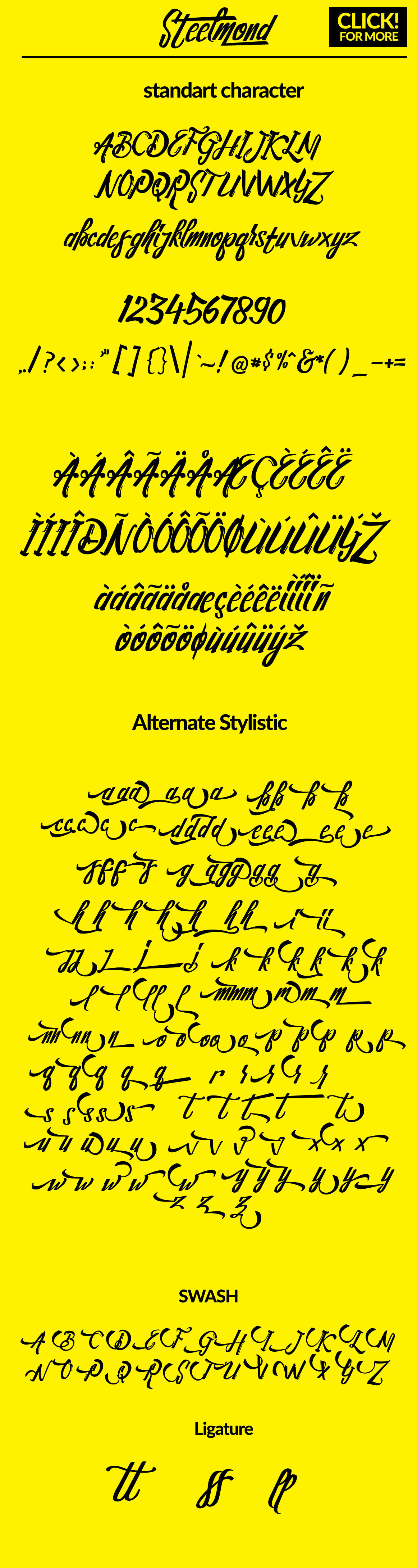 Steelmond is a script font inspired by brush pen hand lettering. Features: Discretionary Ligatures, Stylistic Alternates, Initial and Terminal Forms that setting up in Contextual swashes ( This fonts is automatically setting the initial and terminal forms as default, and if you want to turn off the initial and terminal just click the button of the contextual swashes, it more easier than opening the glyph tab).