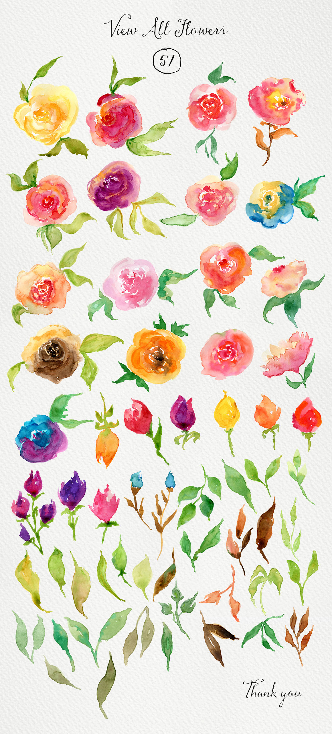 Watercolour roses. Ideal for invitations, wedding invitations, handmade craft items, scrap booking, printed paper items and more. 57 PNG (300dpi) hand drawn watercolour graphic elements,Each floral element on an individual png with transparent background. Size approximately 1 x 2 inches to 12 x 7 inches.