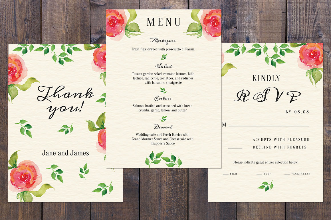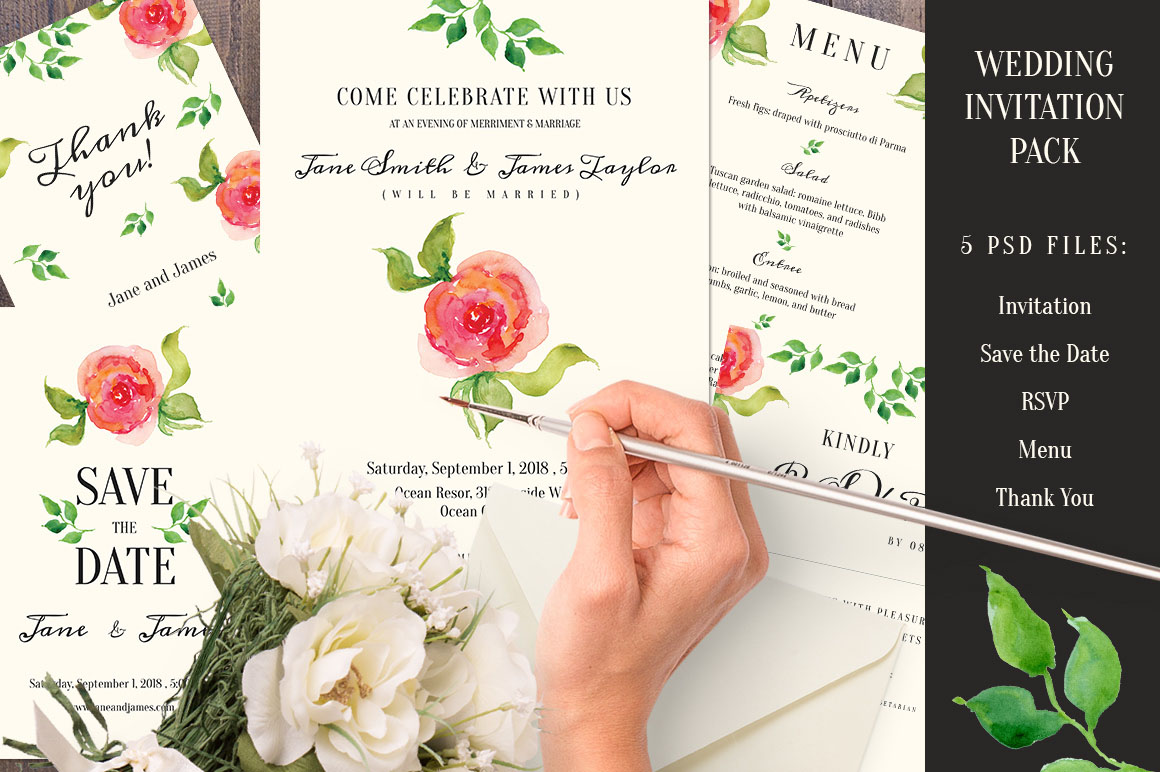 PSD files wedding invitation pack template ready to print. Send your guests elegant invitations. In this case you need photoshop. Choose a premium cardstock for more luxury view and sent to your print shop as pdf file. You could change background fill and edit text, all fonts are free – link is in Read me file. Size all files: 5,25 x 7,25″ full bleed Files Included: Invitation psd file, 300 dpi, CMYK, RSVP psd file, 300 dpi, CMYK, Menu psd file, 300 dpi, CMYK, Thank You psd file, 300 dpi, CMYK, Save the Date psd file, 300 dpi, CMYK, 5 reference images.