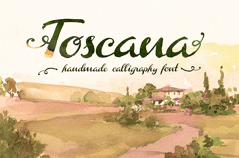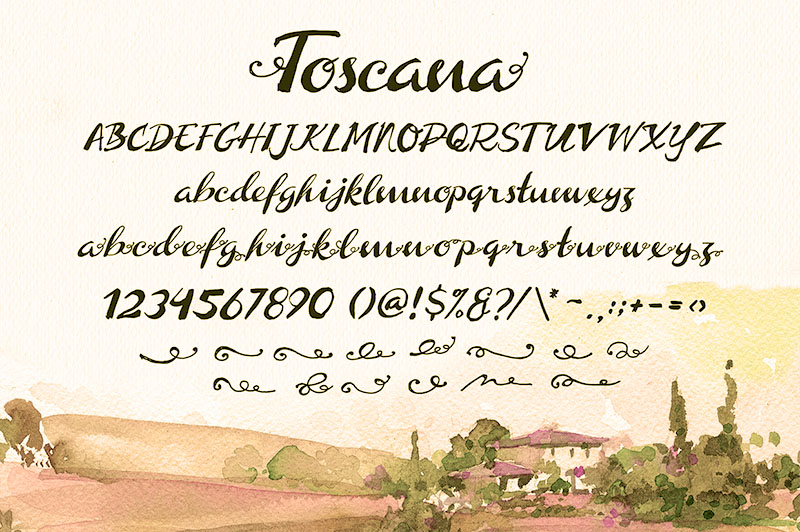 Toscana Font is a handmade calligraphic type. This font contains uppercase and lowercase with alternate decorative end letter. This font include 2 ttf files script font and alternate lowercase letters + ornaments.